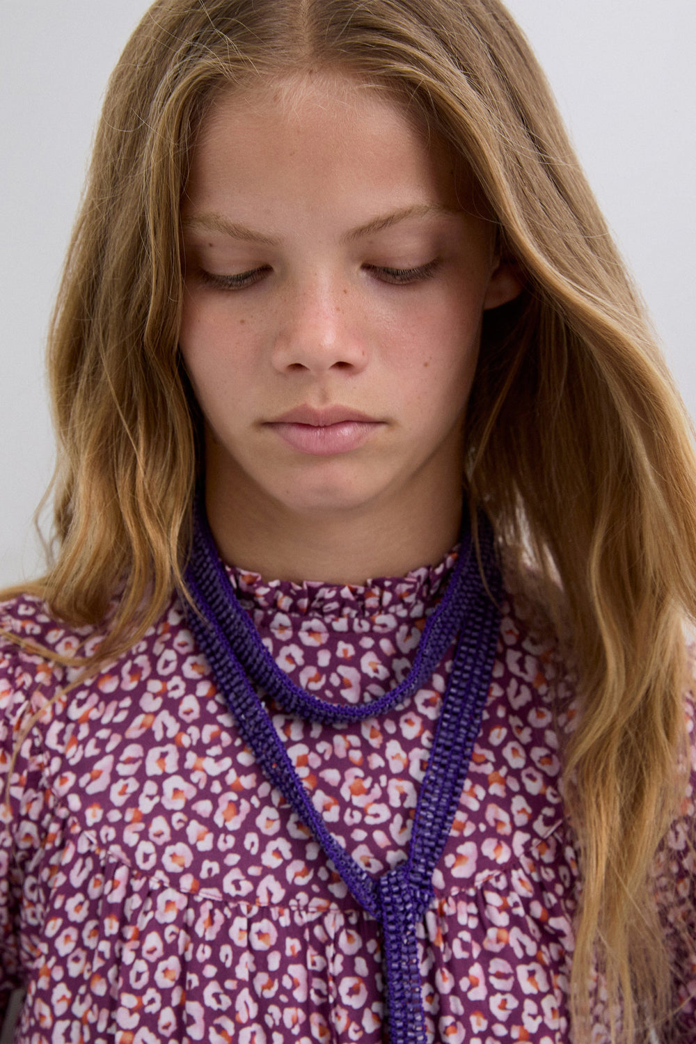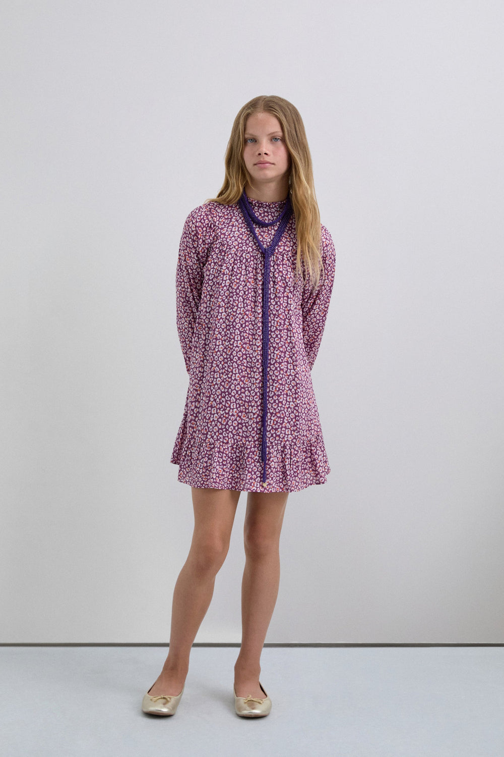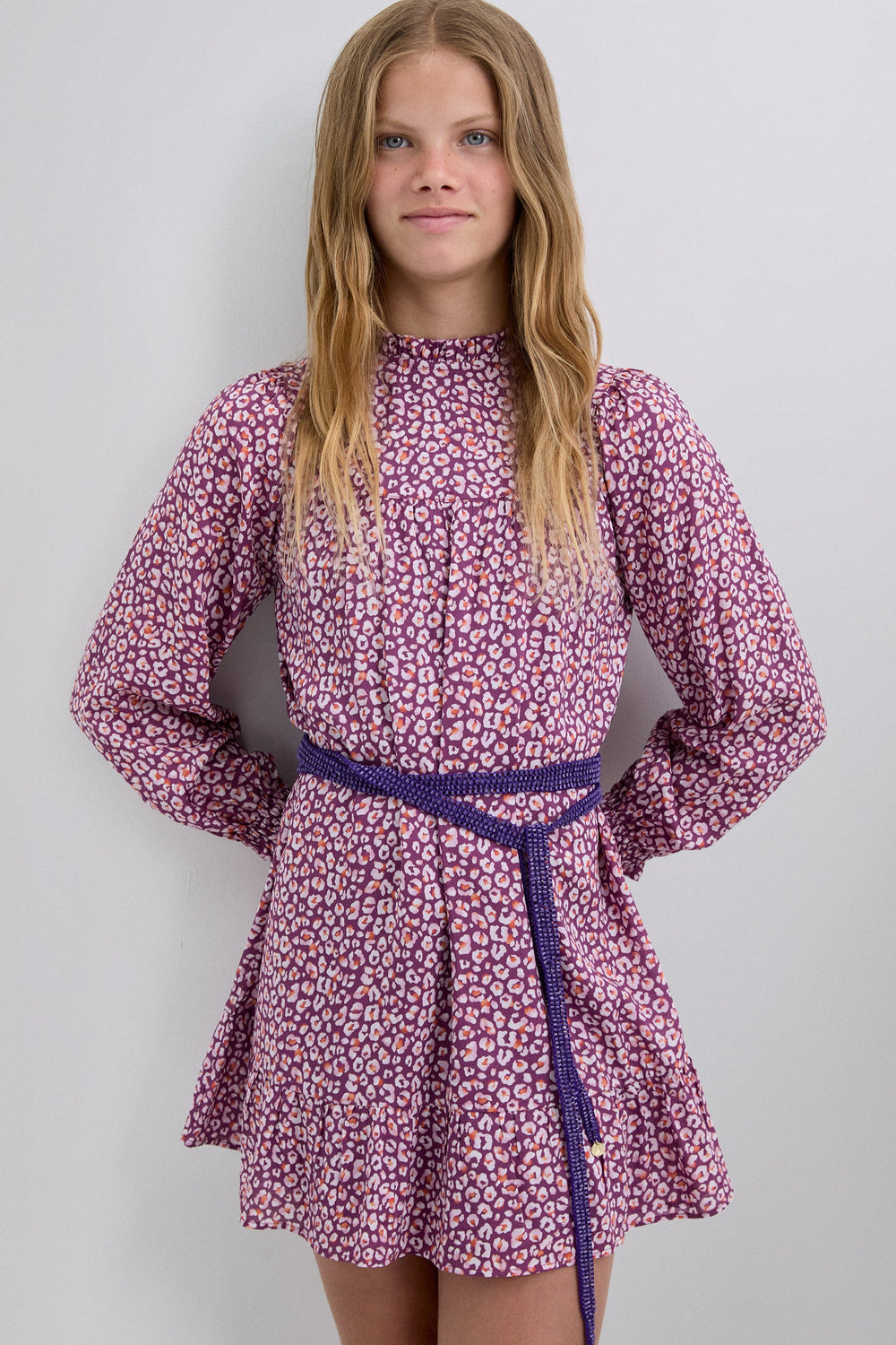 Mini dress made of 100% viscose with animal print. Babydoll cut, high collar with gathering on the chest and long sleeves with gathered cuffs. Skirt with a slight flounce.