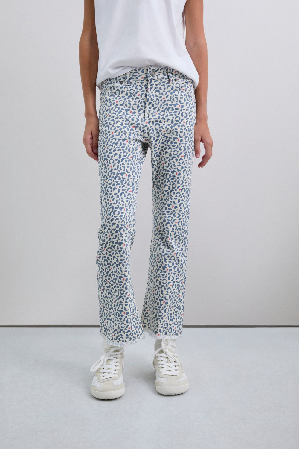 Denim jeans. Two front pockets. Two back pockets with skull and logo label detail. Frayed motif on the hems. Belt loops at the waist. Button and zip fastening. Animal print.