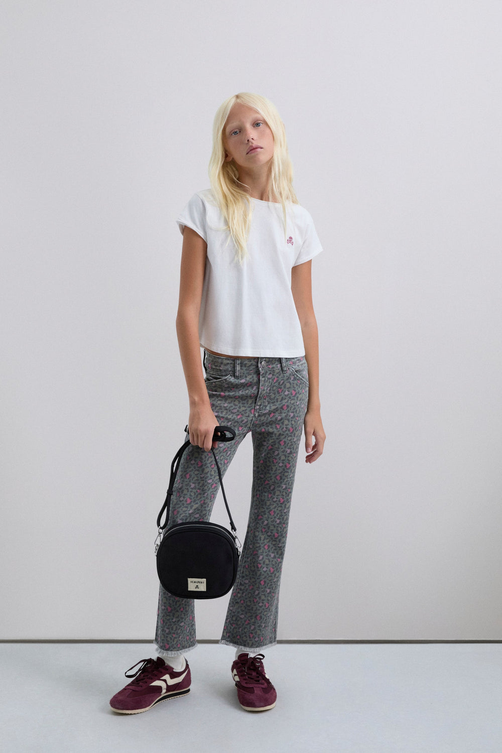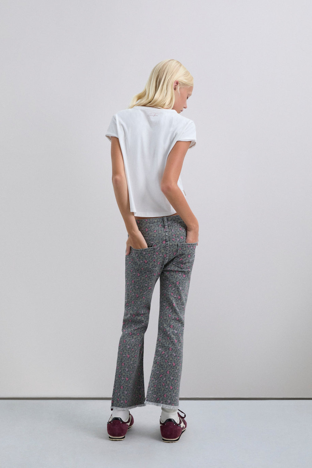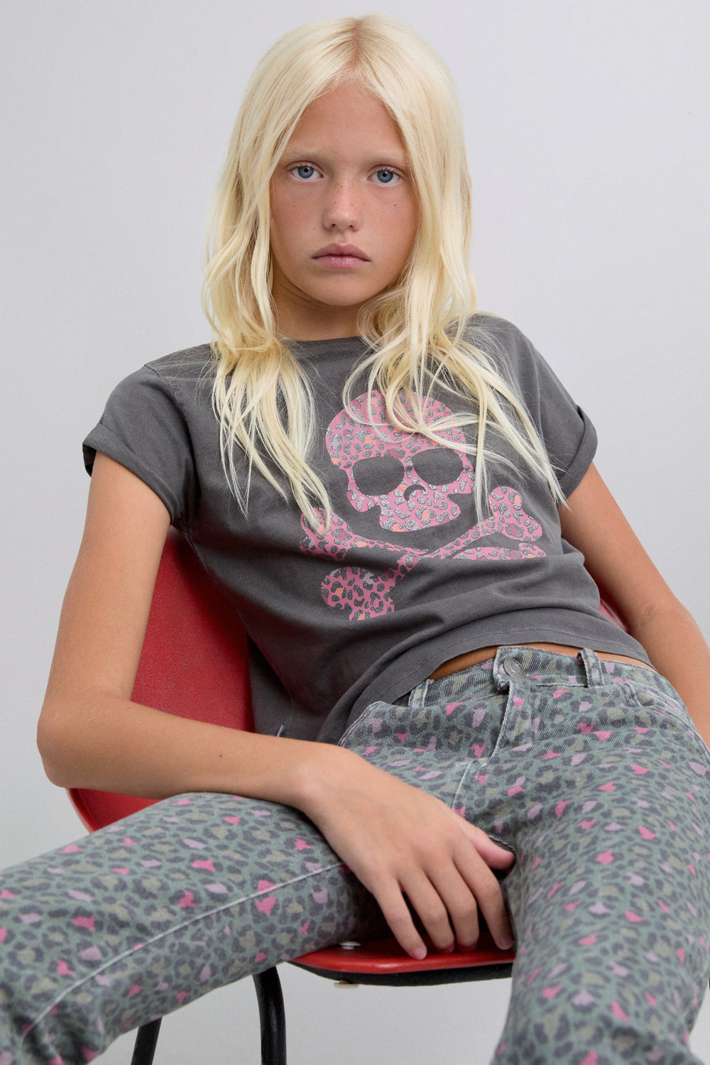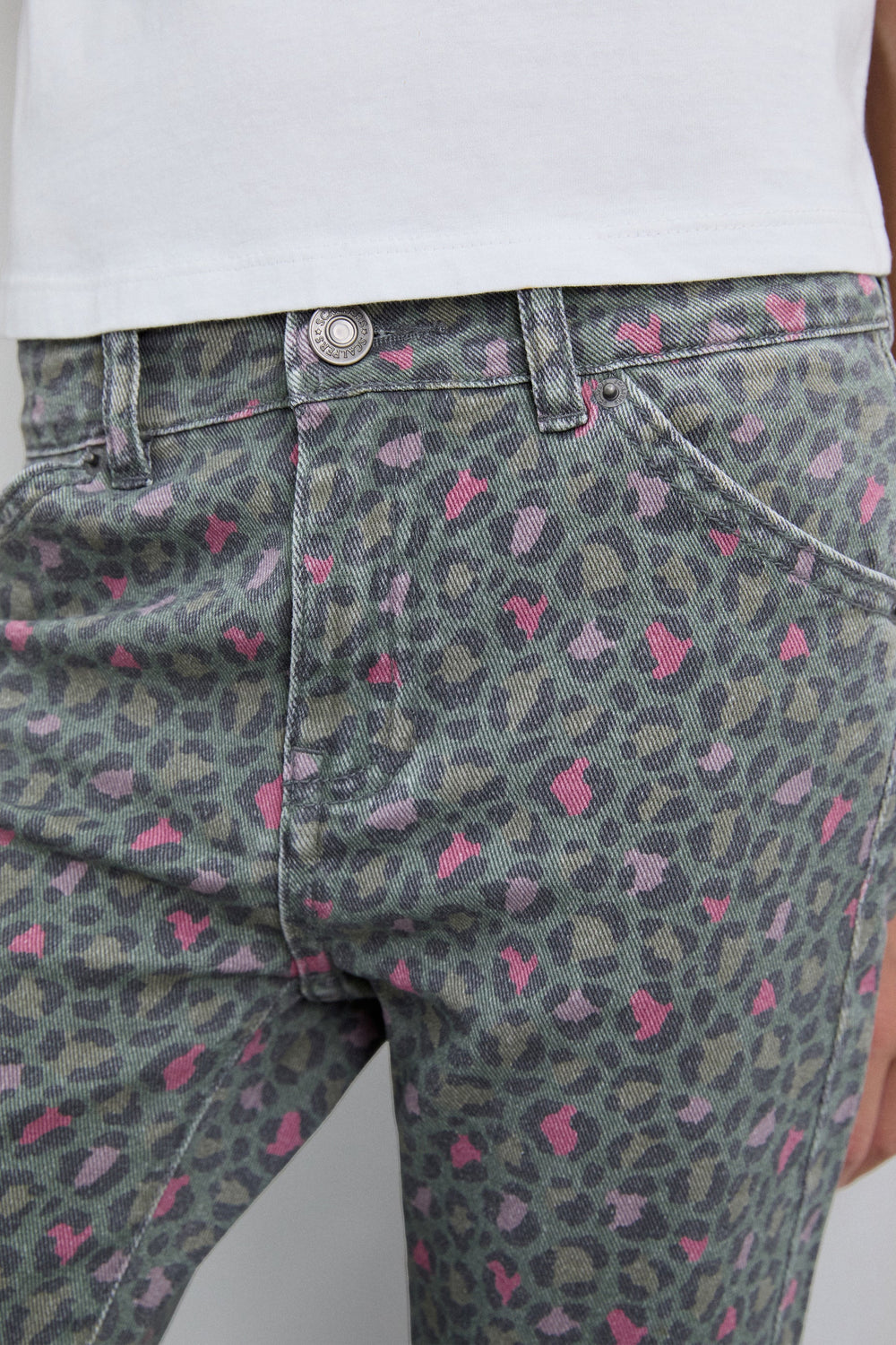 Denim jeans. Two front pockets. Two back pockets with skull and logo label detail. Frayed motif on the hems. Belt loops at the waist. Button and zip fastening. Animal print.