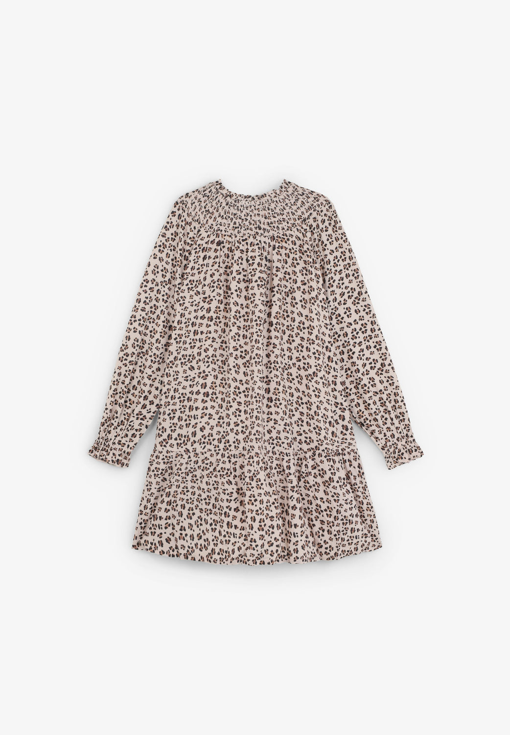 Animal print dress. Slightly puffed long sleeves. Smocking collar and button fastening.
