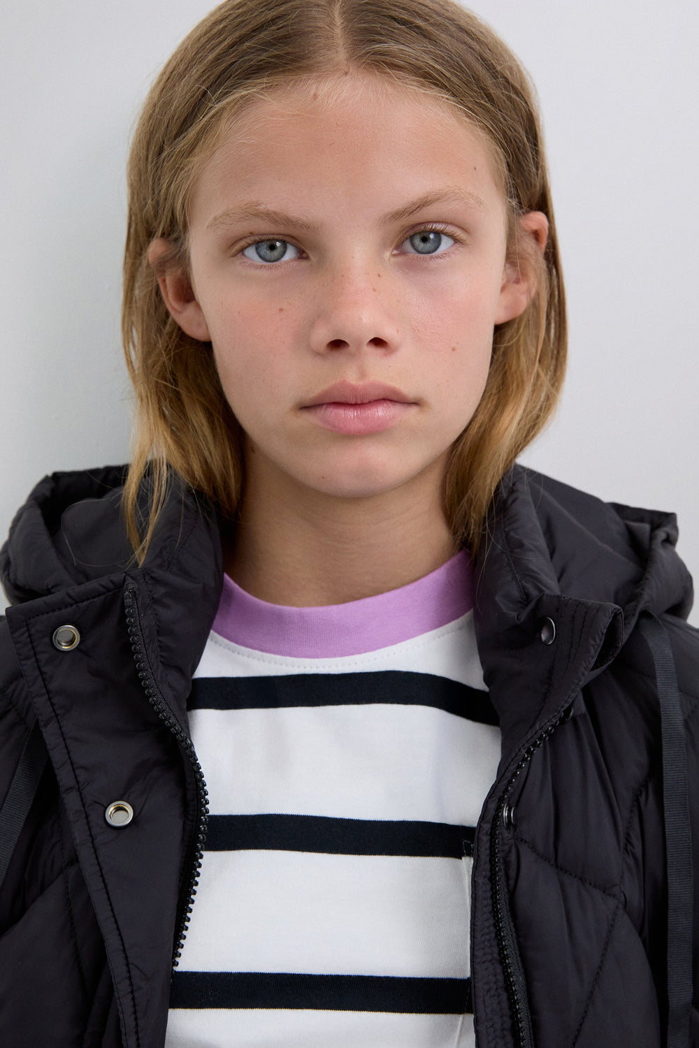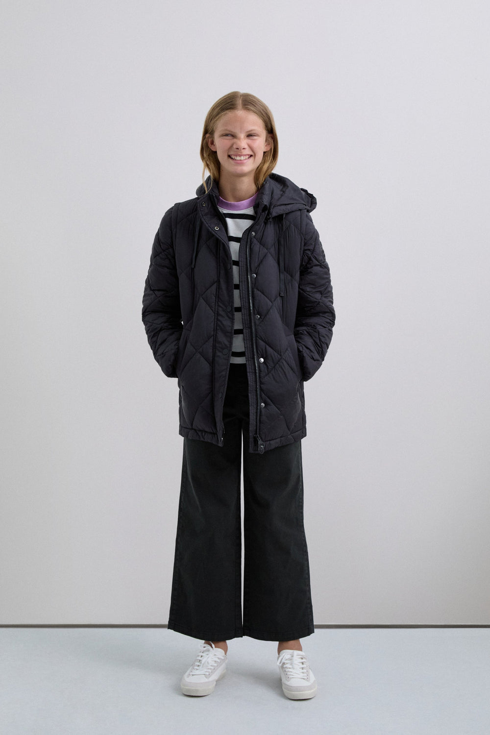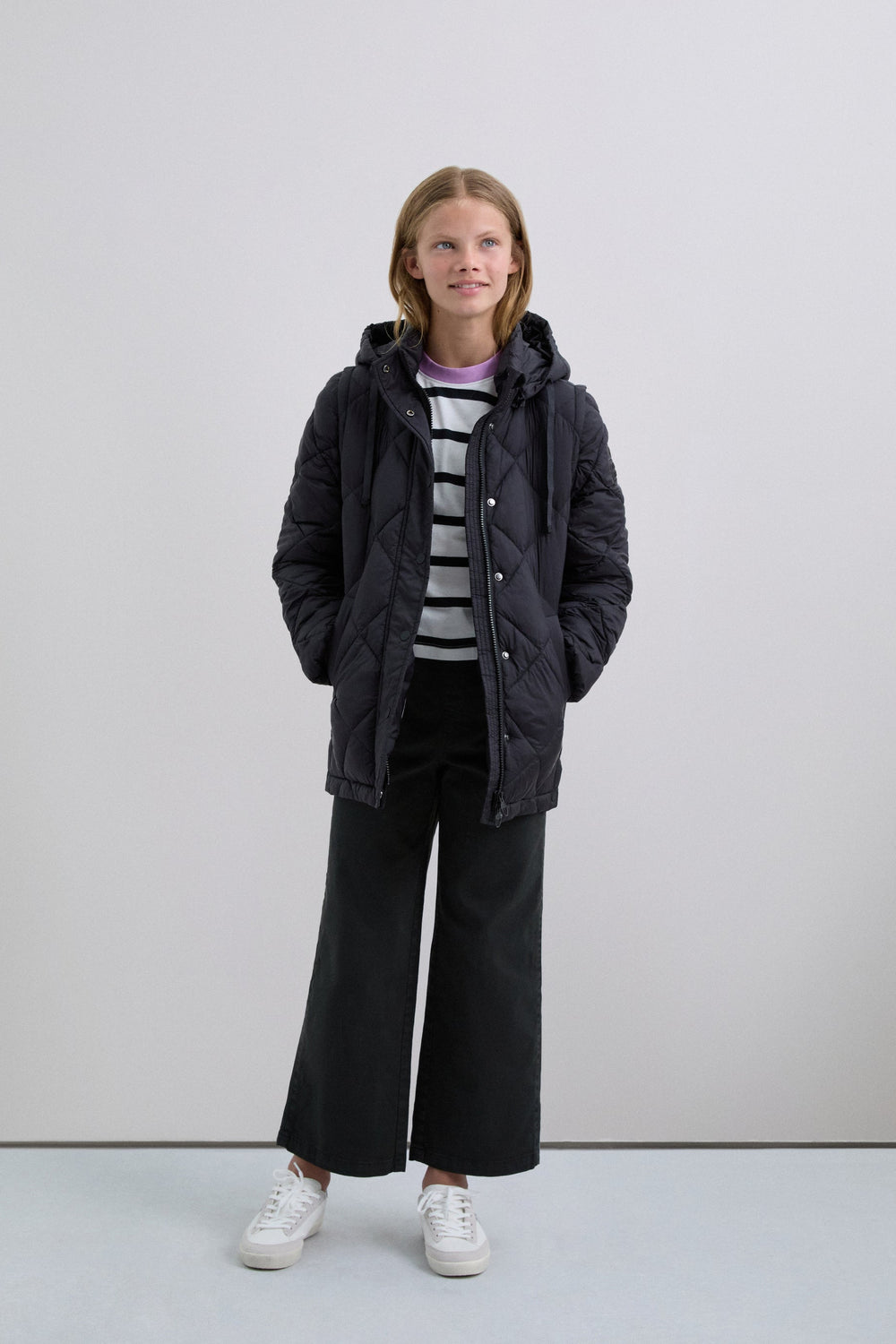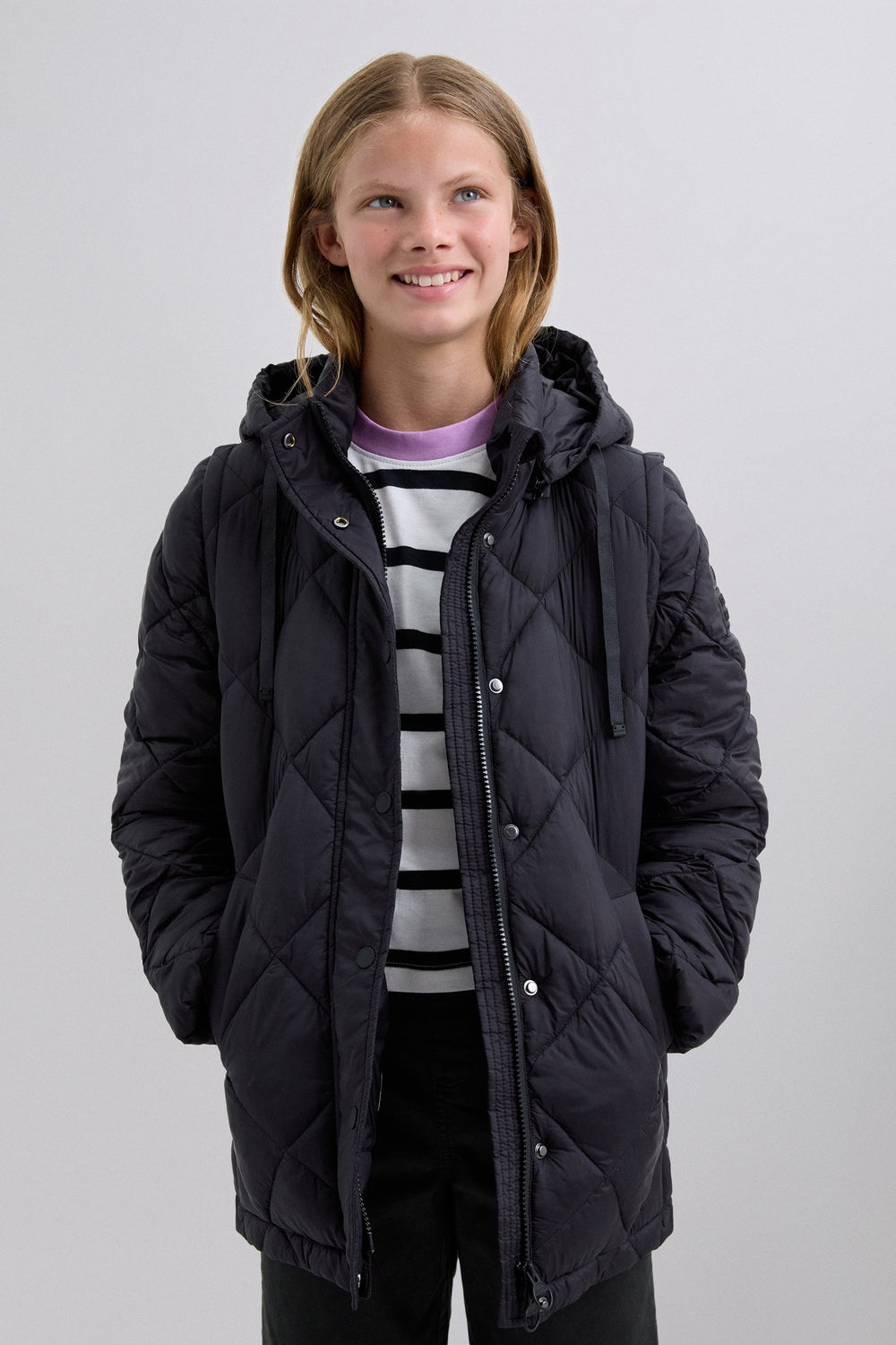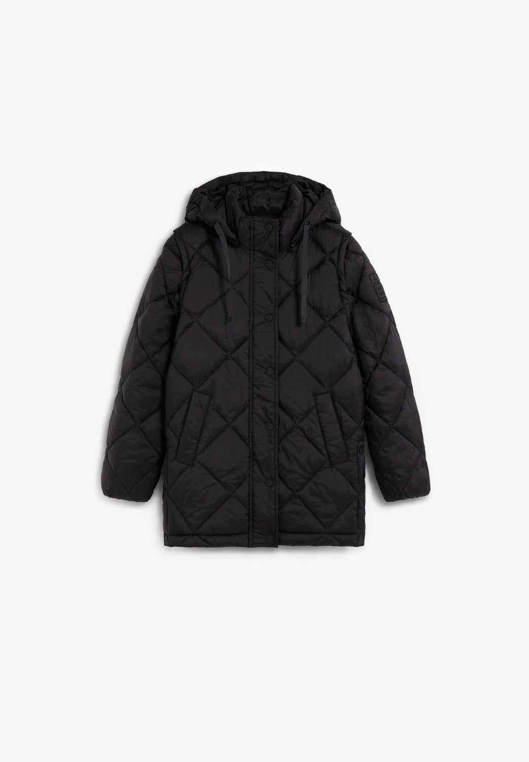 Padded coat. Detachable hood and sleeves. Front zip fastening concealed by placket with press stud fastening. Side pockets. Recycled fleece lining. Logo detail on the back.