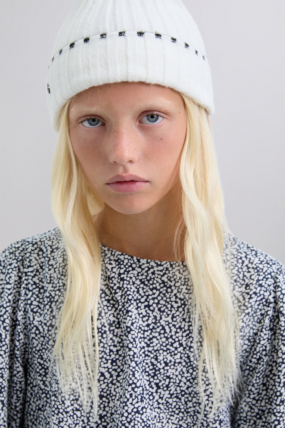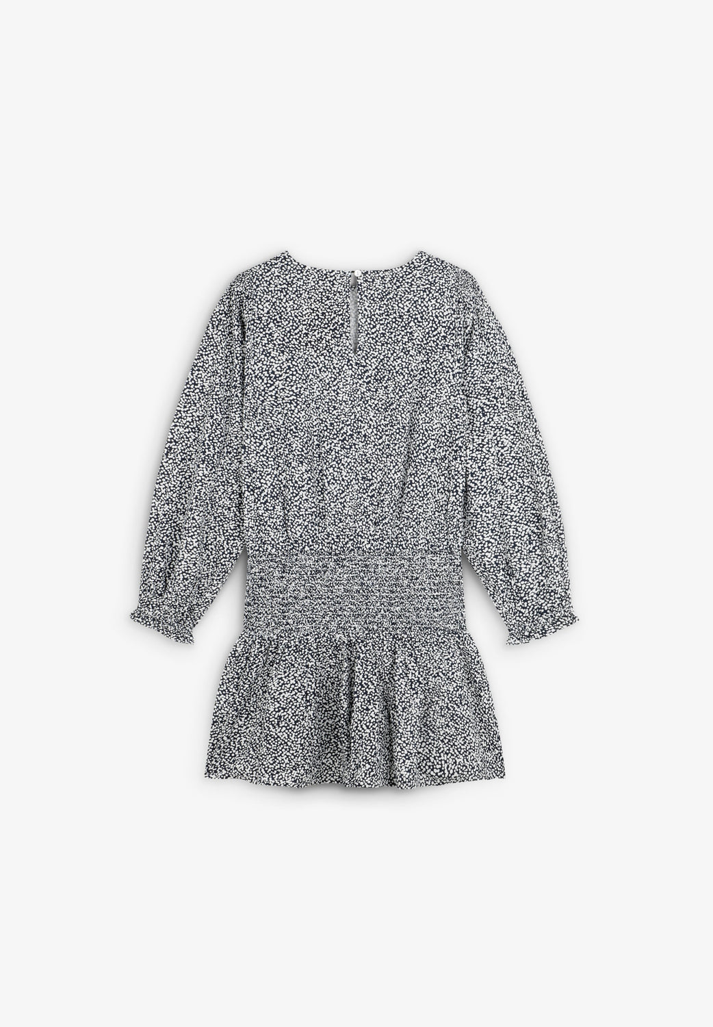 Mini dress. Regular fit. Round neck. Long, slightly puffed sleeves with gathered cuffs. Smoked and skull detail on waist. Back button fastening.