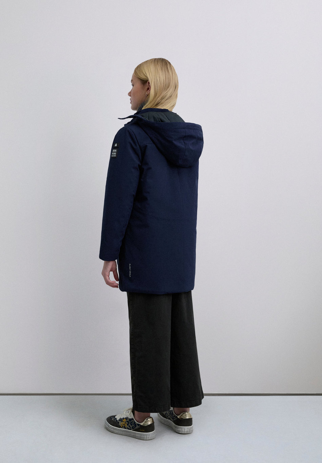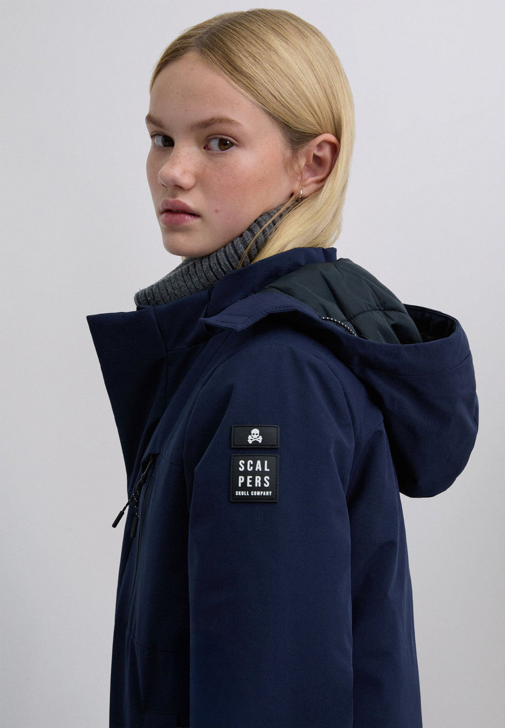 Long parka made of recycled technical fabric. Regular fit, hood and fastening with thermo-sealed zip and placket. Long sleeves and thermo-sealed zip pockets. Side rubberised patch.