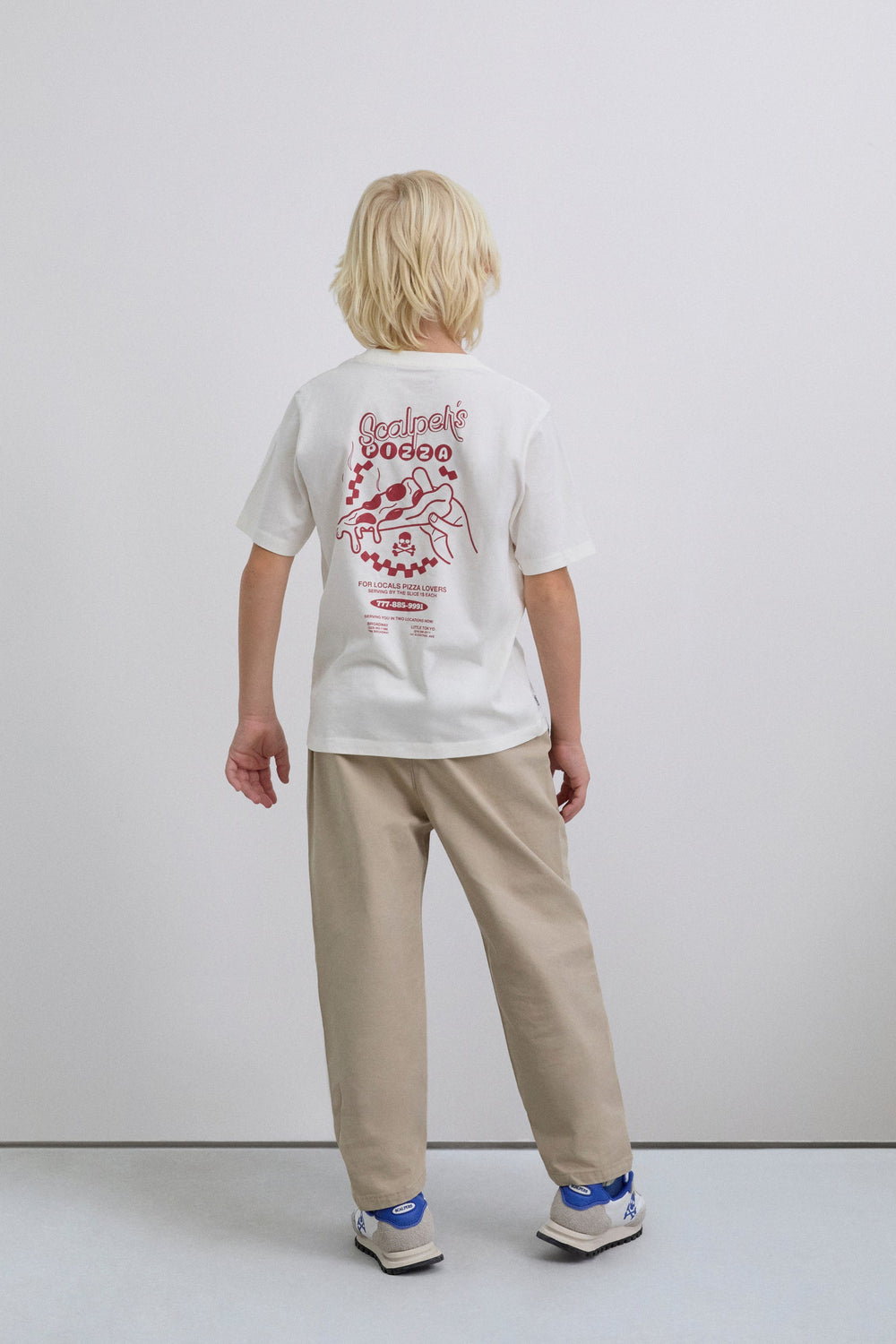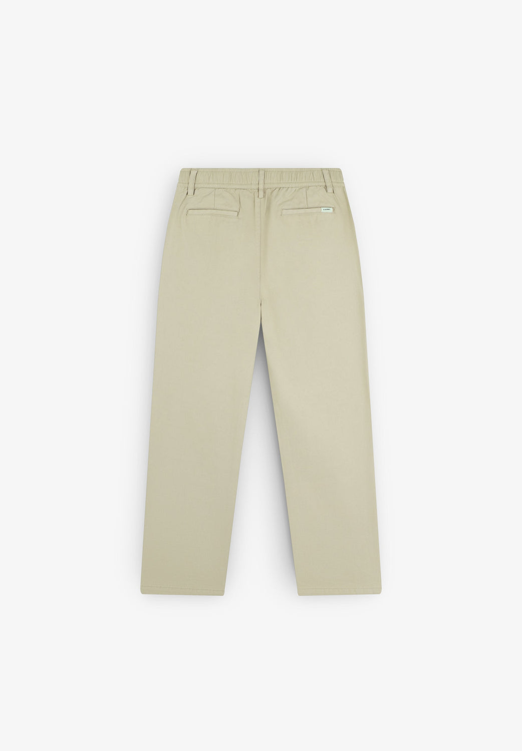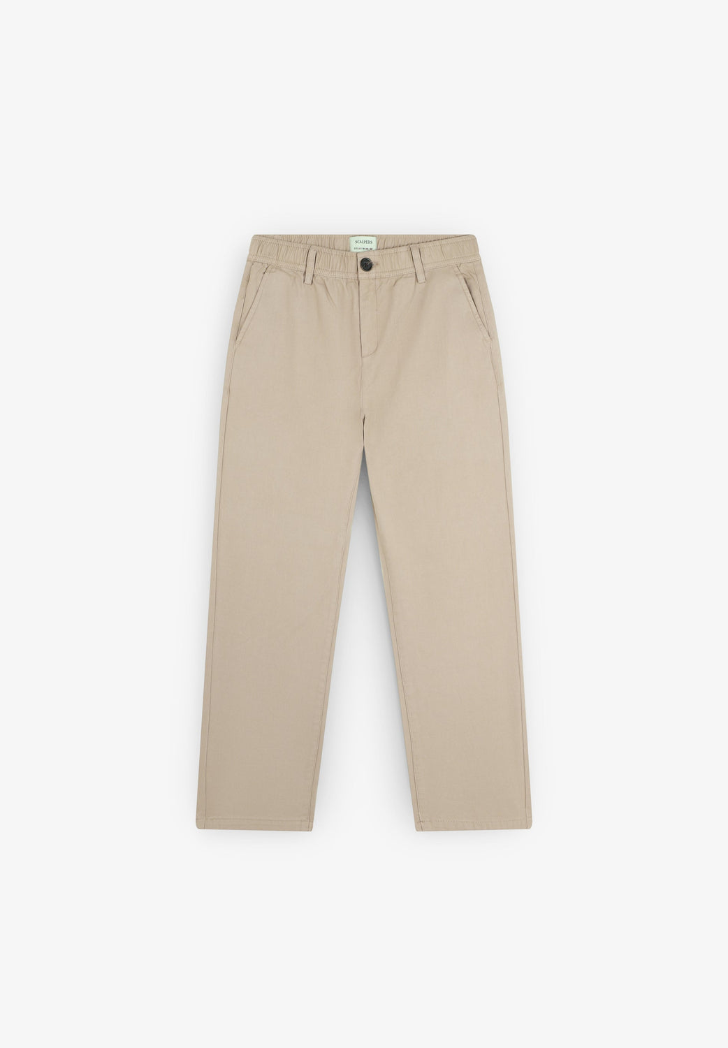Chino trousers made of 100% BCI cotton. Two front and back pockets. Button fastening and belt loops. Logo label detail on the pocket.