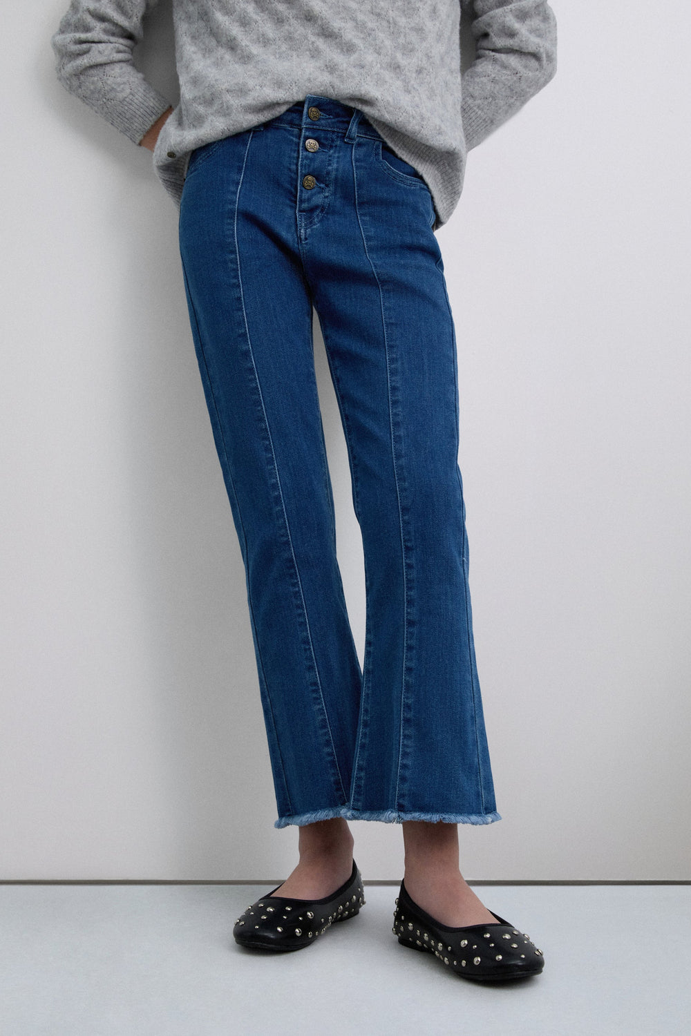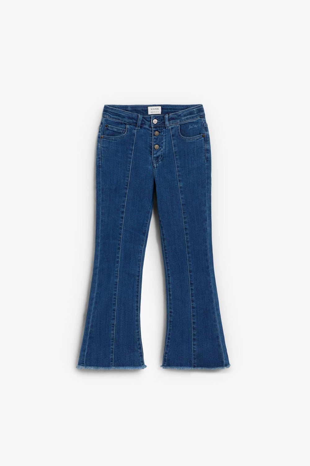 Trousers made of slightly stretchy cotton. Flared. Button fastening with skull logo details. Front pockets and back patch pockets Finished with fringing and front stitching.