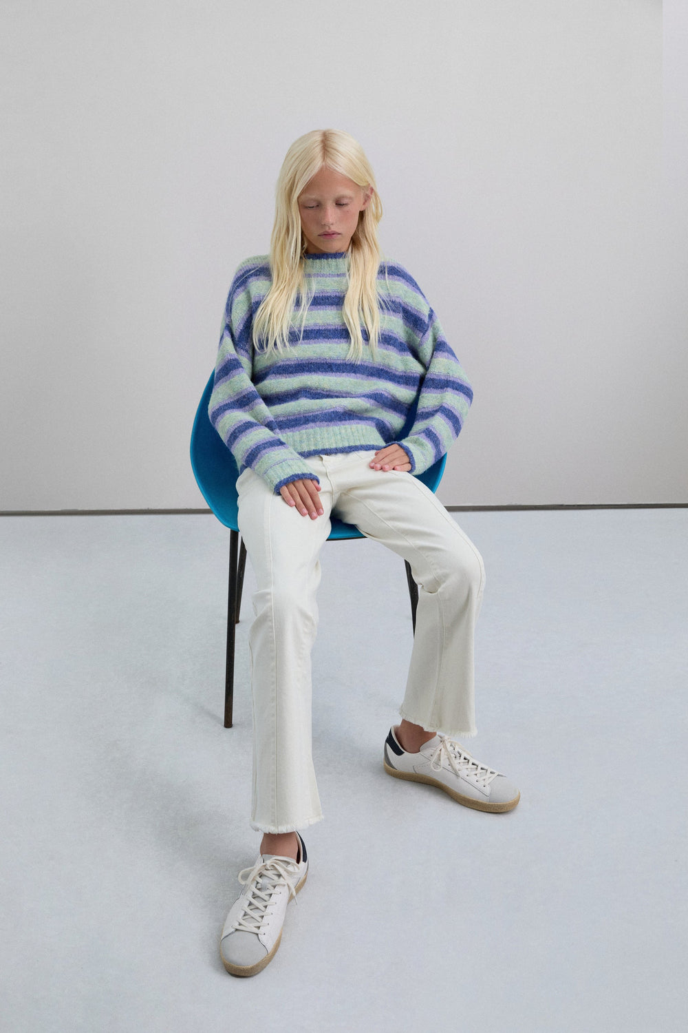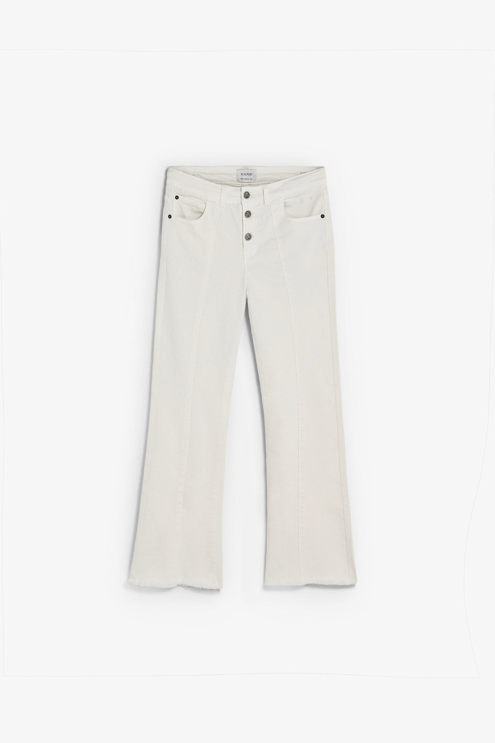 Trousers made of slightly stretchy cotton. Flared. Button fastening with skull logo details. Front pockets and back patch pockets Finished with fringing and front stitching.