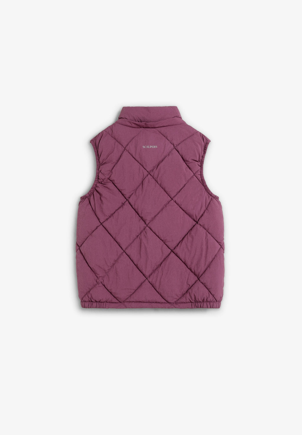 Heavy-duty padded waistcoat with adjustable hood. Double slider zip fastening. Rubberised skull detail on chest. Zip pockets and an inner pocket