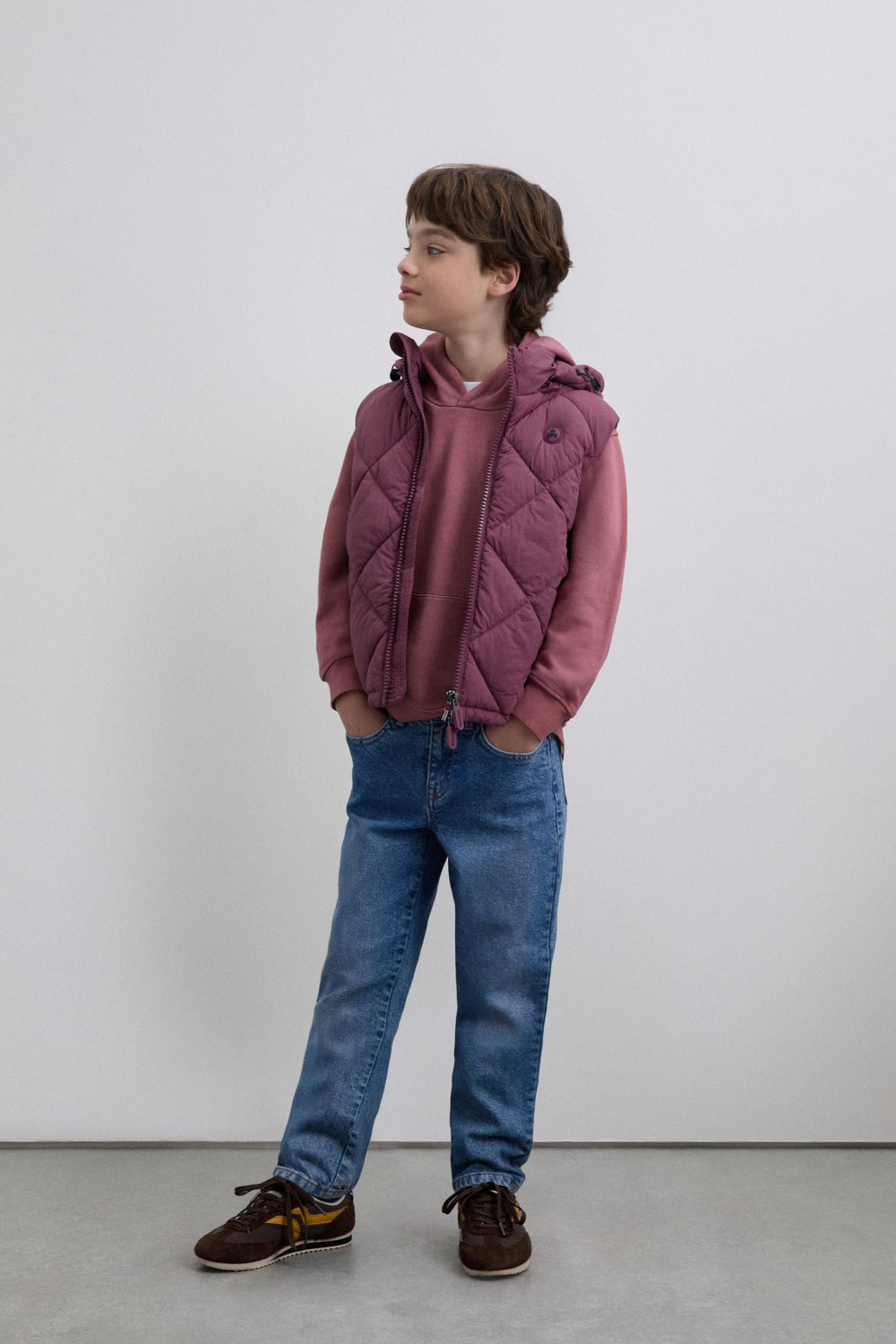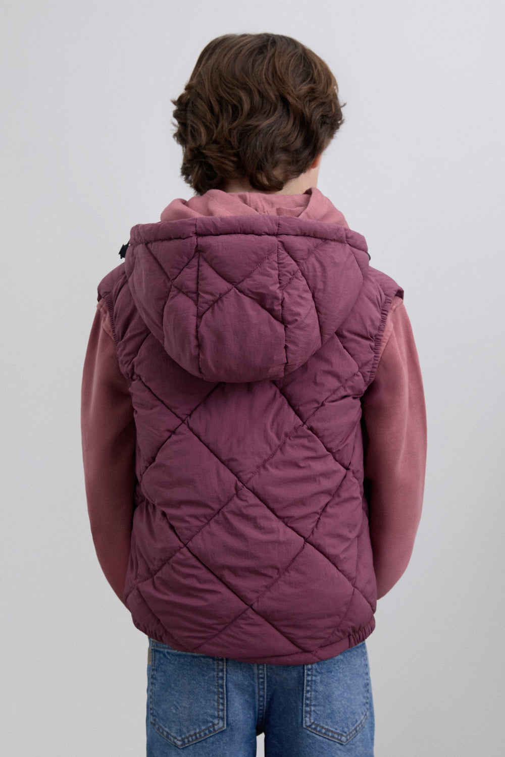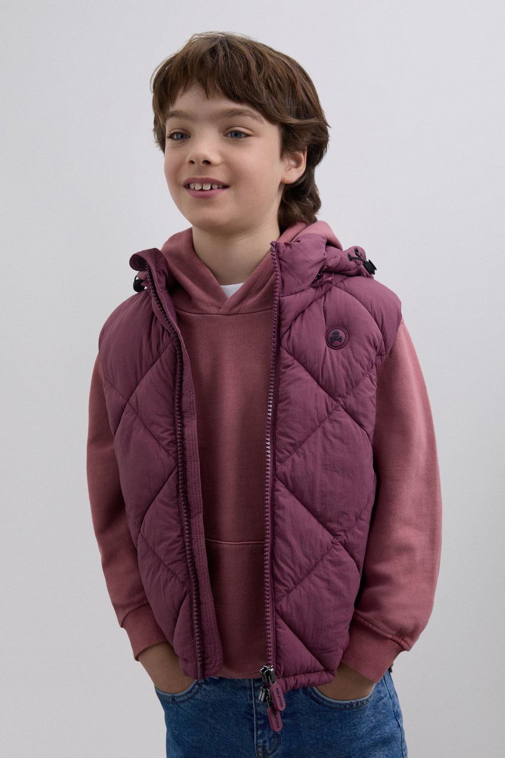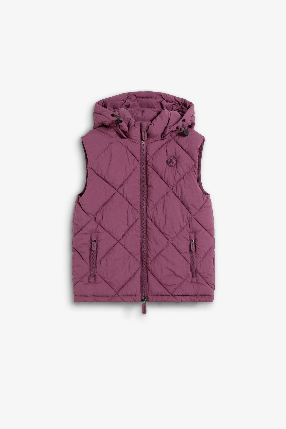 Heavy-duty padded waistcoat with adjustable hood. Double slider zip fastening. Rubberised skull detail on chest. Zip pockets and an inner pocket
