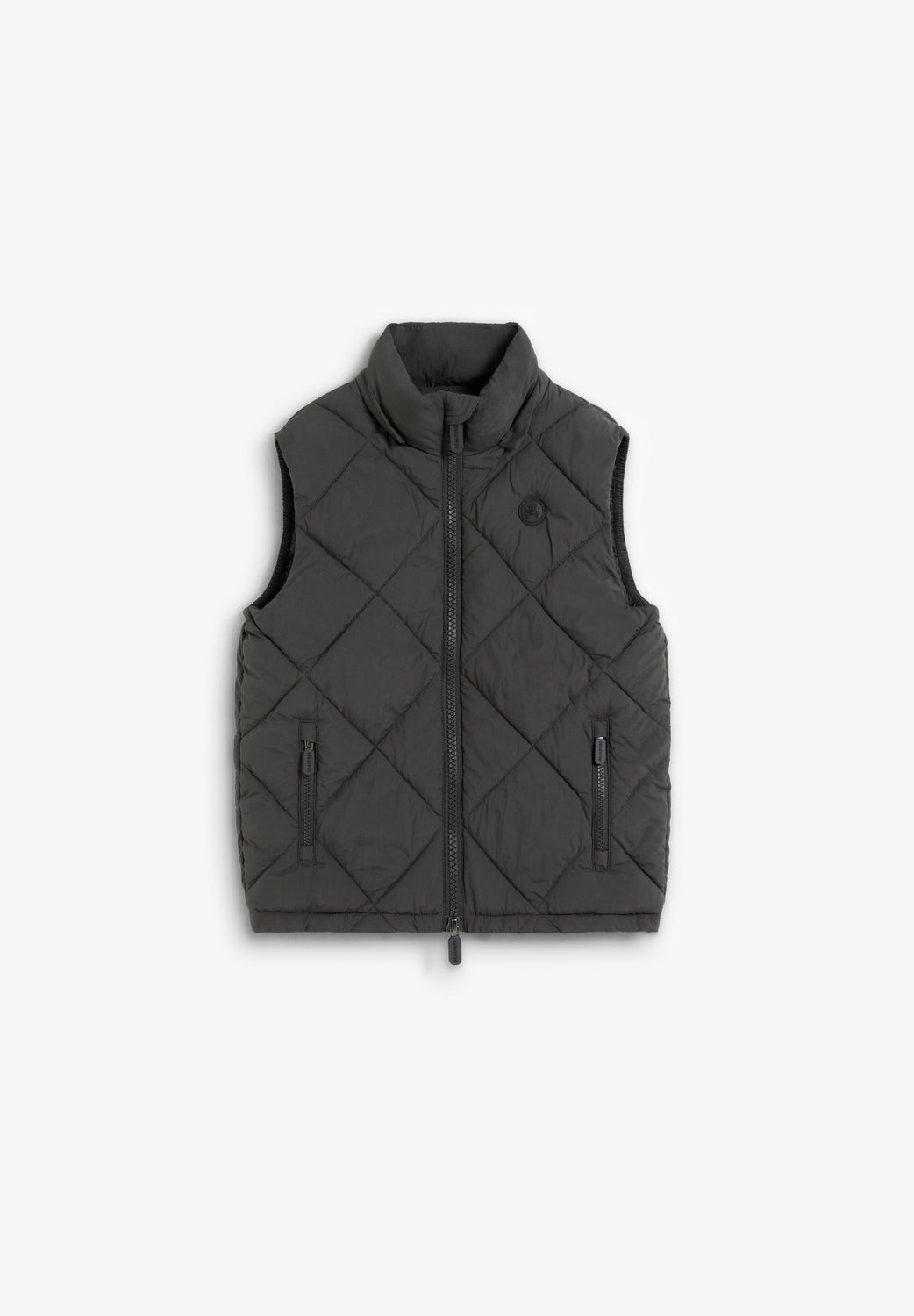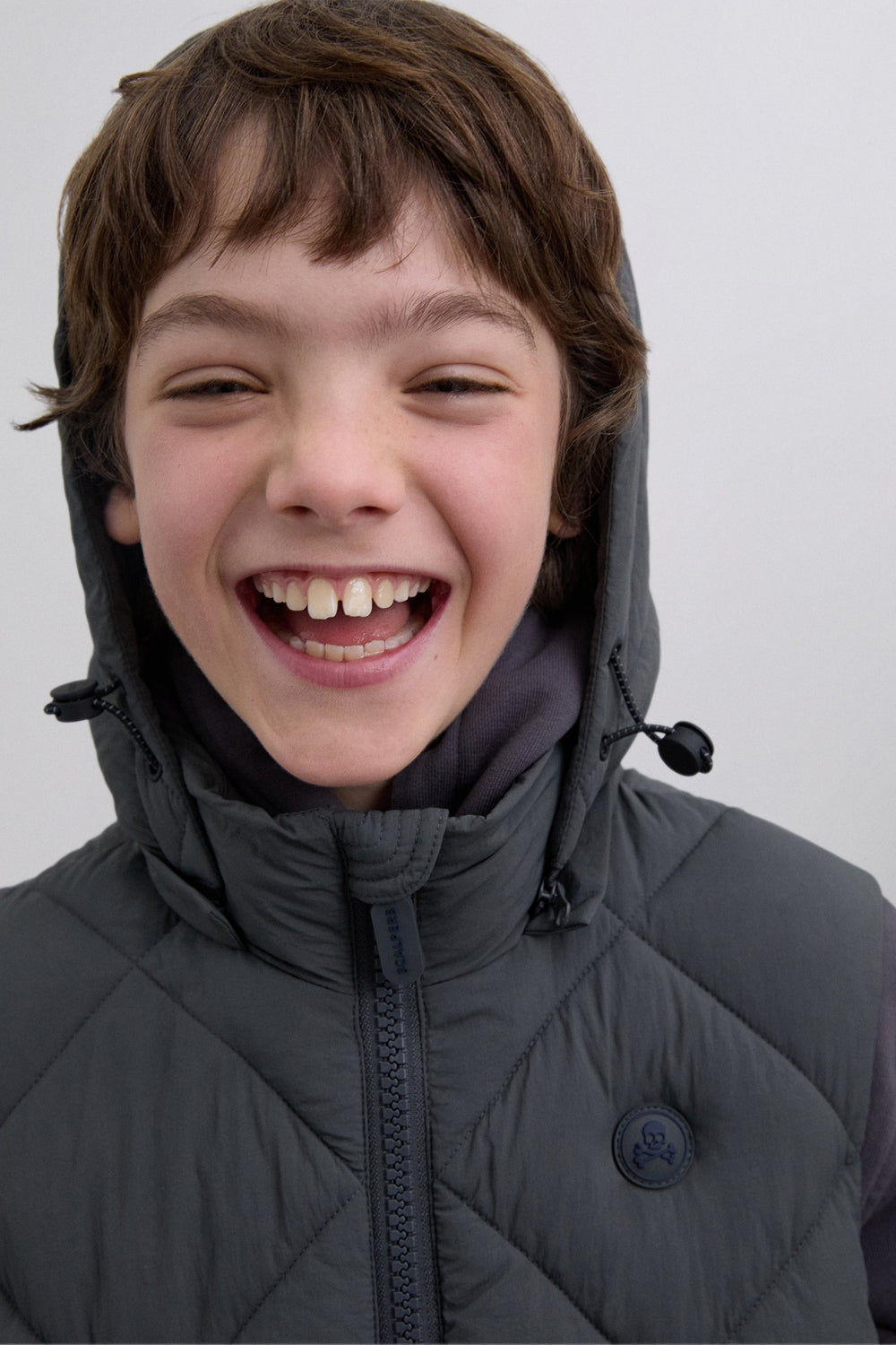 Heavy-duty padded waistcoat with adjustable hood. Double slider zip fastening. Rubberised skull detail on chest. Zip pockets and an inner pocket