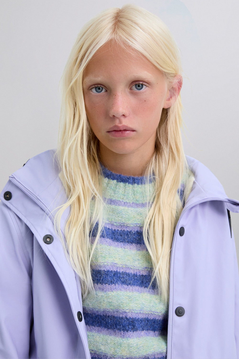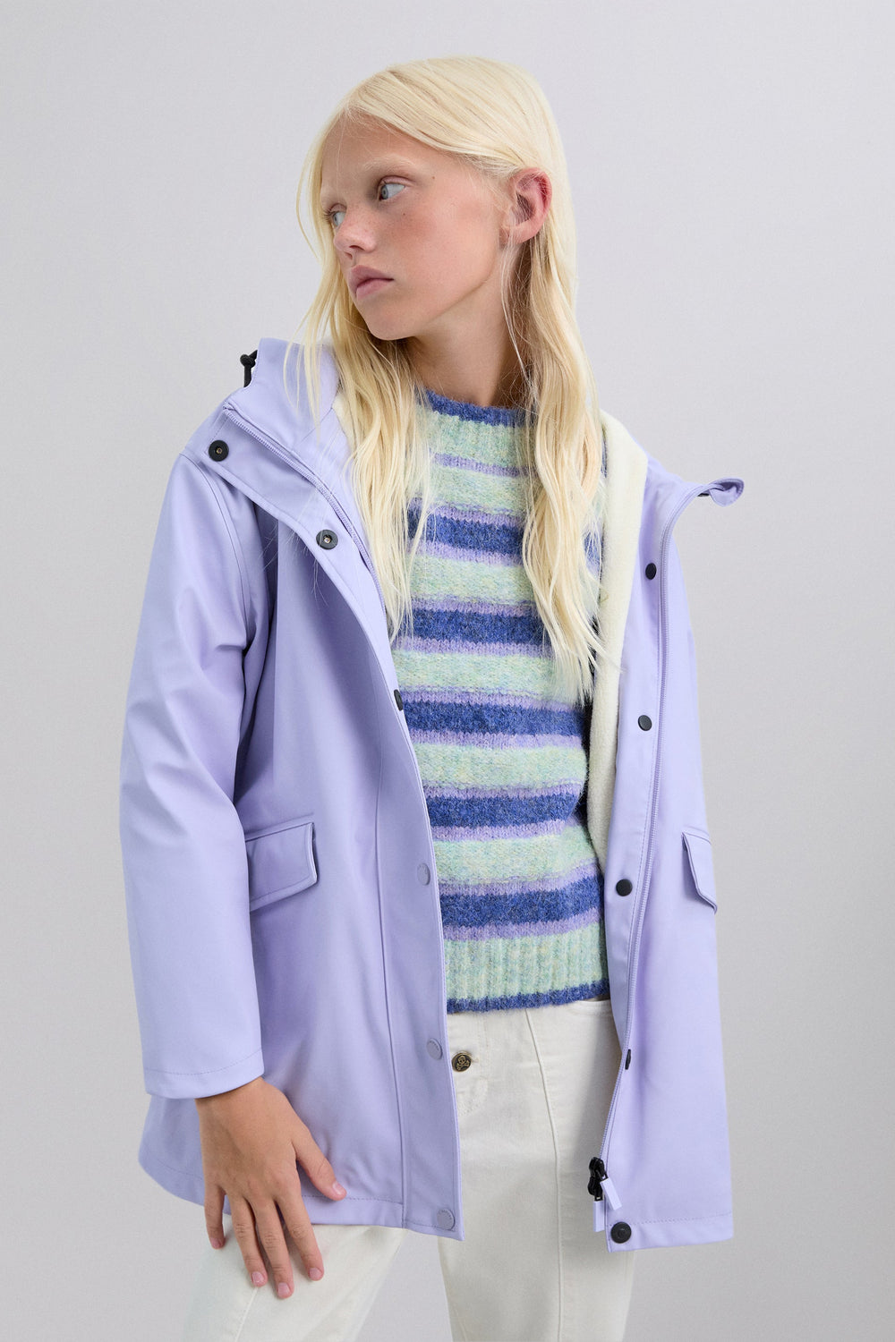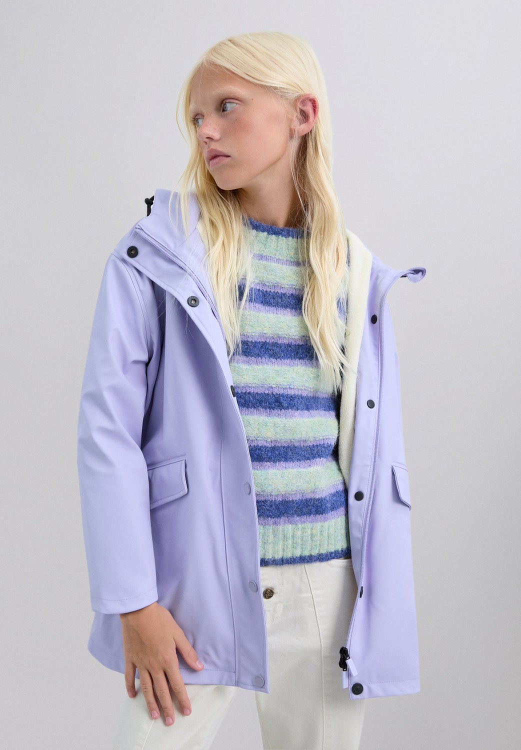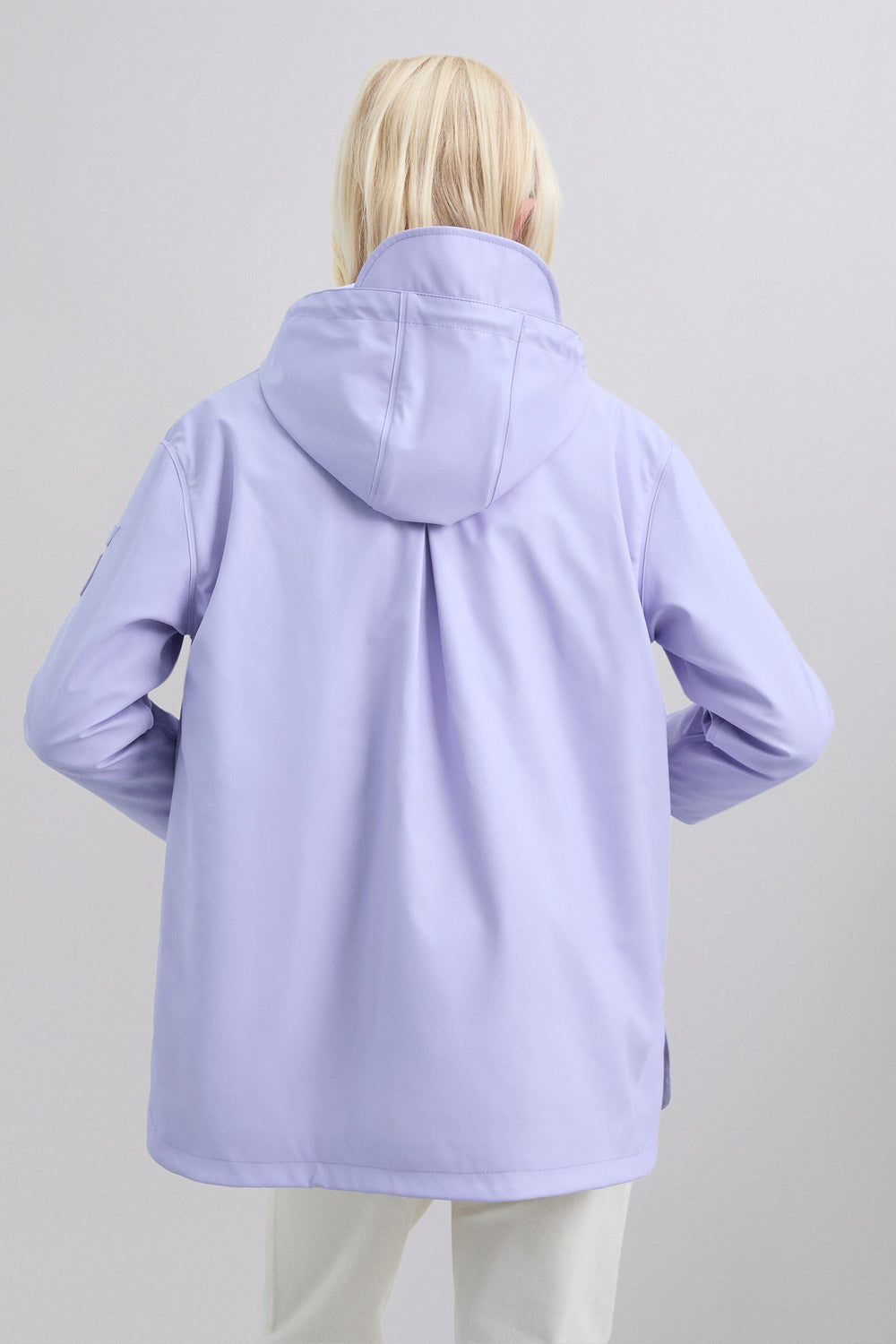 Waterproof jacket. Long sleeves. Adjustable drawstring hood. Two front pockets. Rubberised skull and logo patch detail on sleeve. Button and zip fastening.