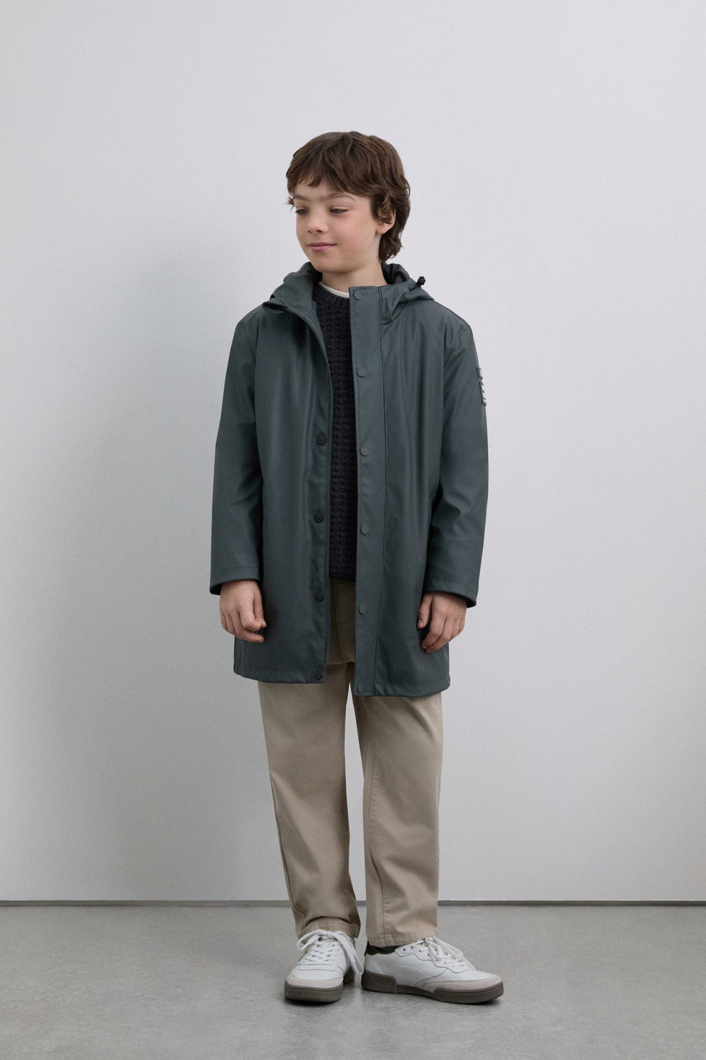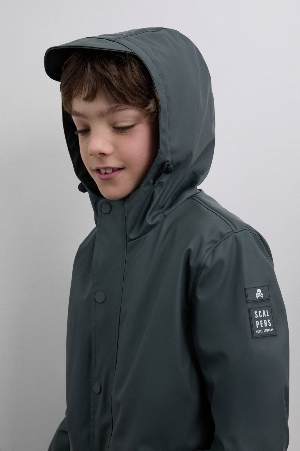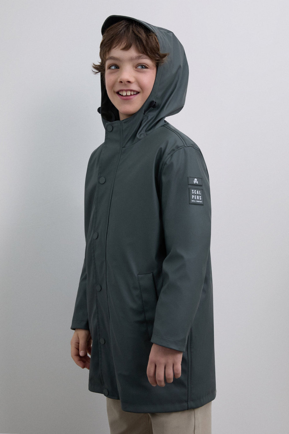 Waterproof parka with adjustable hood. Side pockets with placket and snap button. Synthetic lining. Rubber logo patch detail and skull. Button fastening. Long sleeves.
