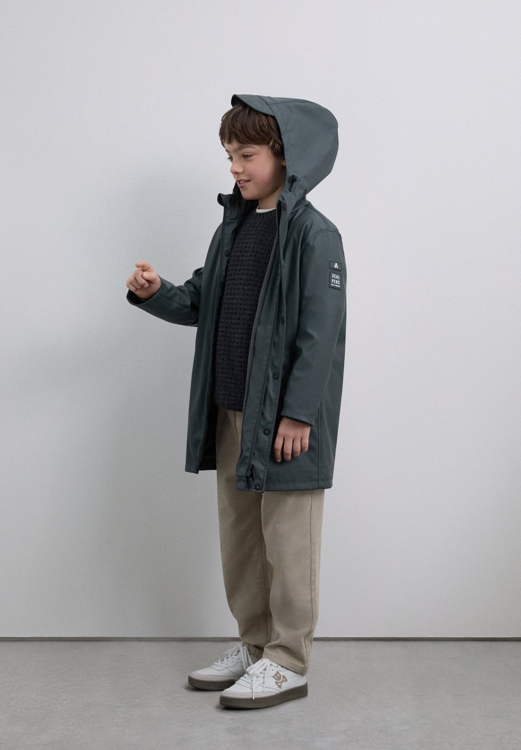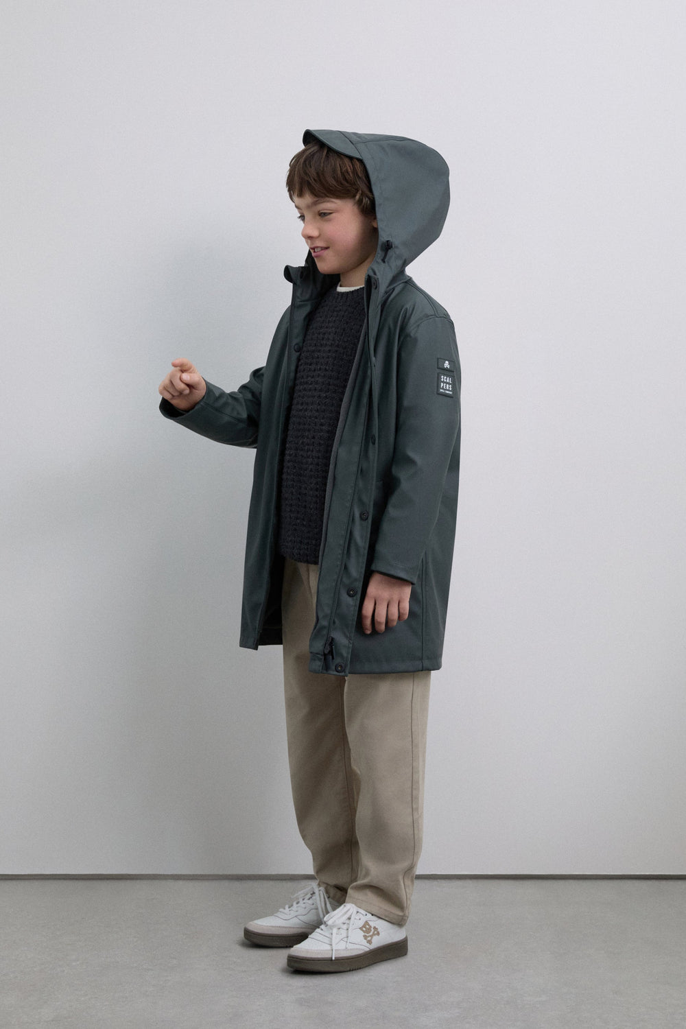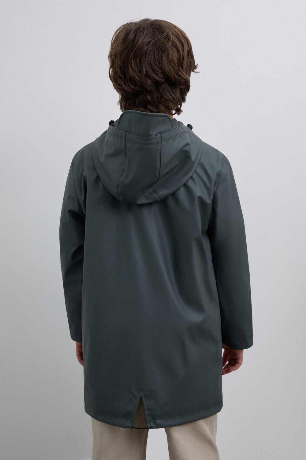 Waterproof parka with adjustable hood. Side pockets with placket and snap button. Synthetic lining. Rubber logo patch detail and skull. Button fastening. Long sleeves.