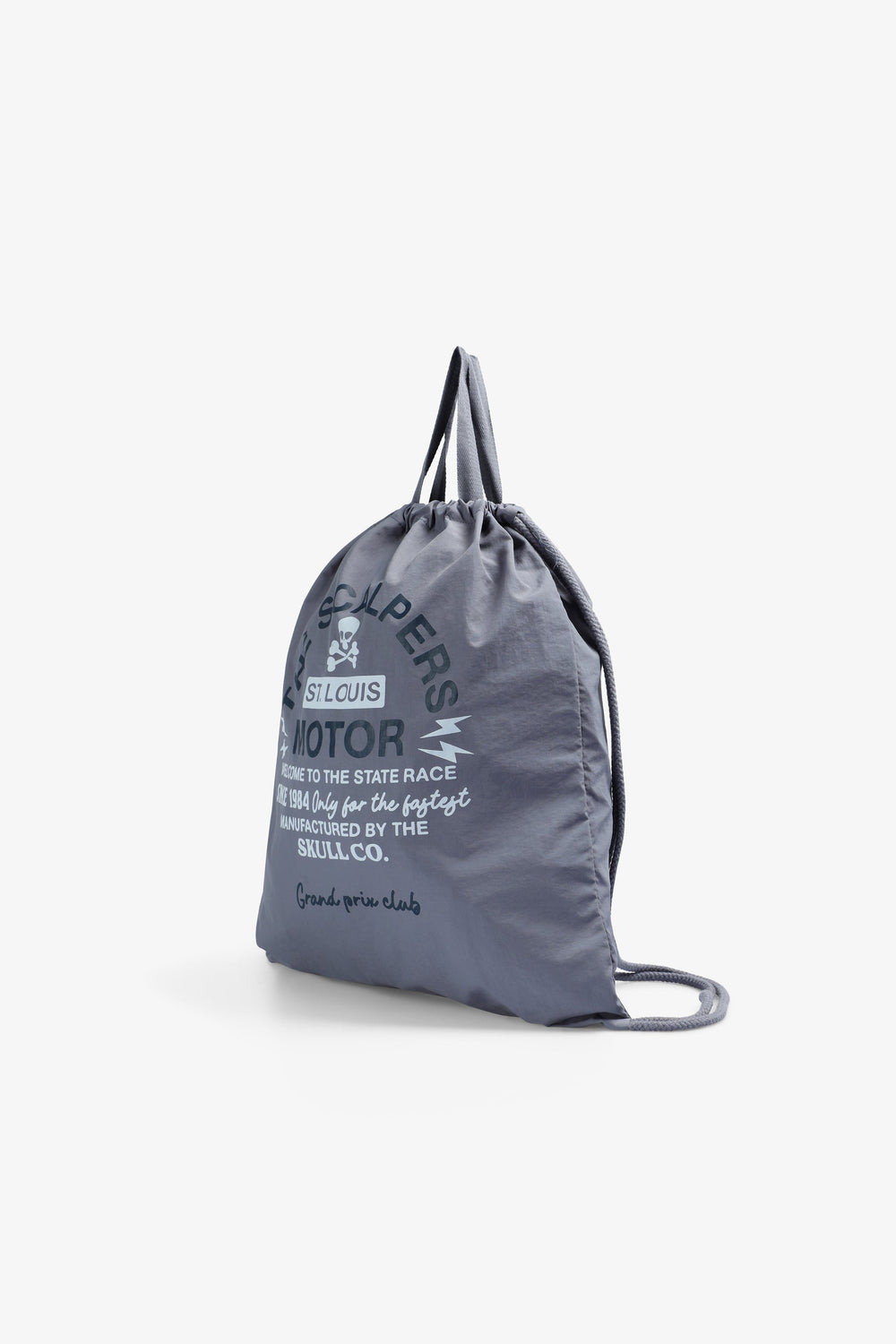 Lightweight synthetic bag. Handle. Double handle on back. Front logo print.