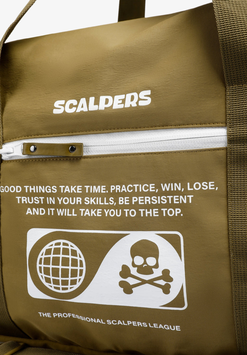 Bag made of a technical fabric. Main and side compartments with zip closure. Zip fastening, short handles and long detachable strap. Front logo and skull print.