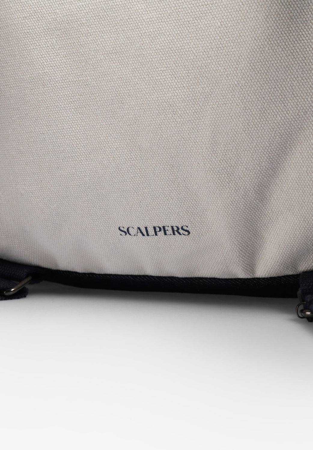 Backpack made of 100% cotton. Lined. Front pocket with zip fastening. Two side compartments. Shoulder straps. Embroidered logo detail on the front. Main fastening with adjustable cords.