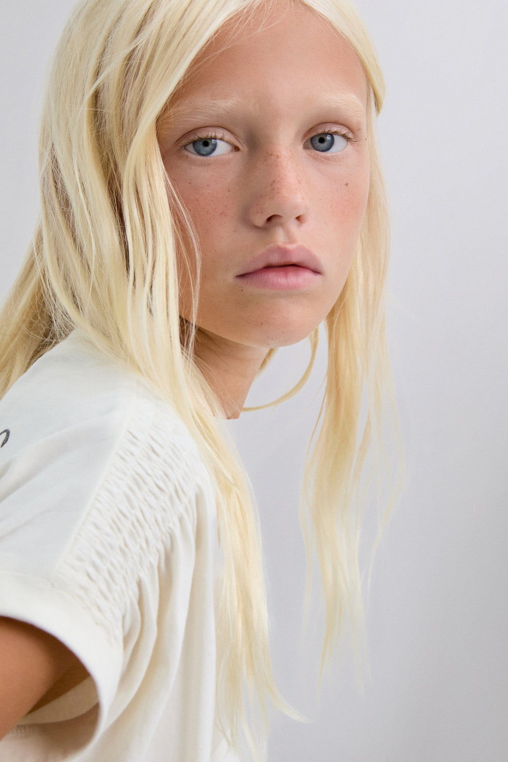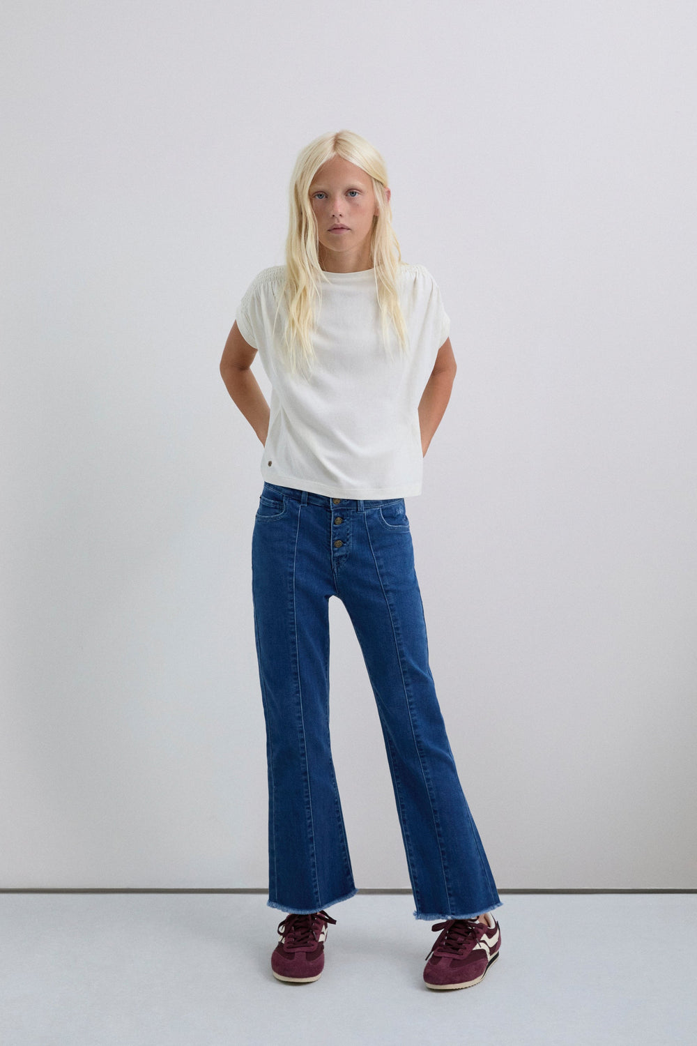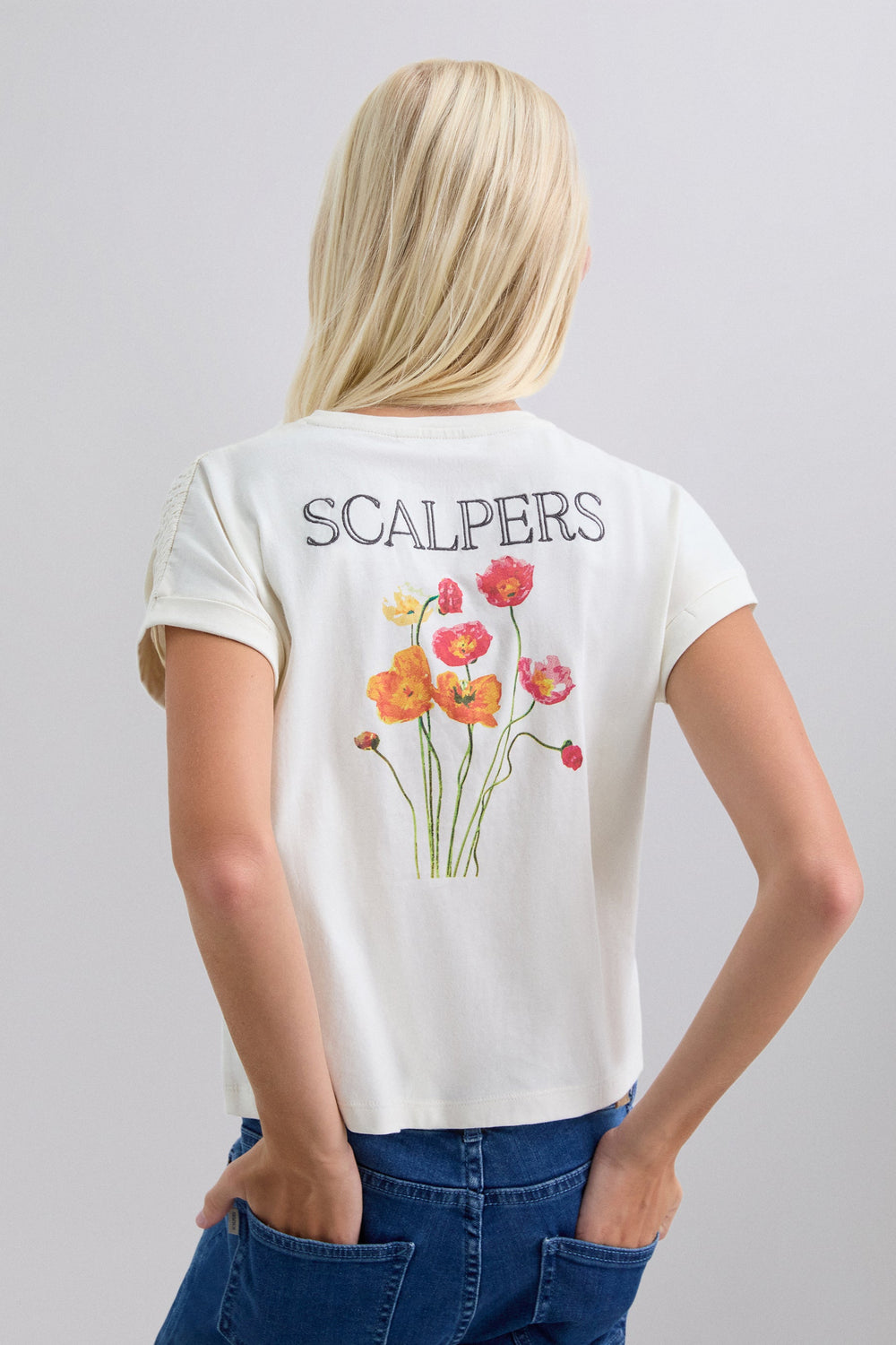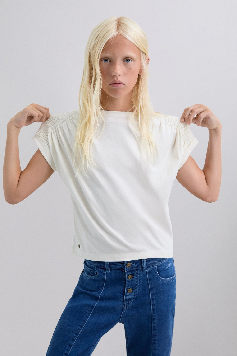 T-shirt made of 100% BCI cotton. Short sleeve. Round neck. Gathered detail on sleeve and metallic skull on waist. Back print with embroidered logo.