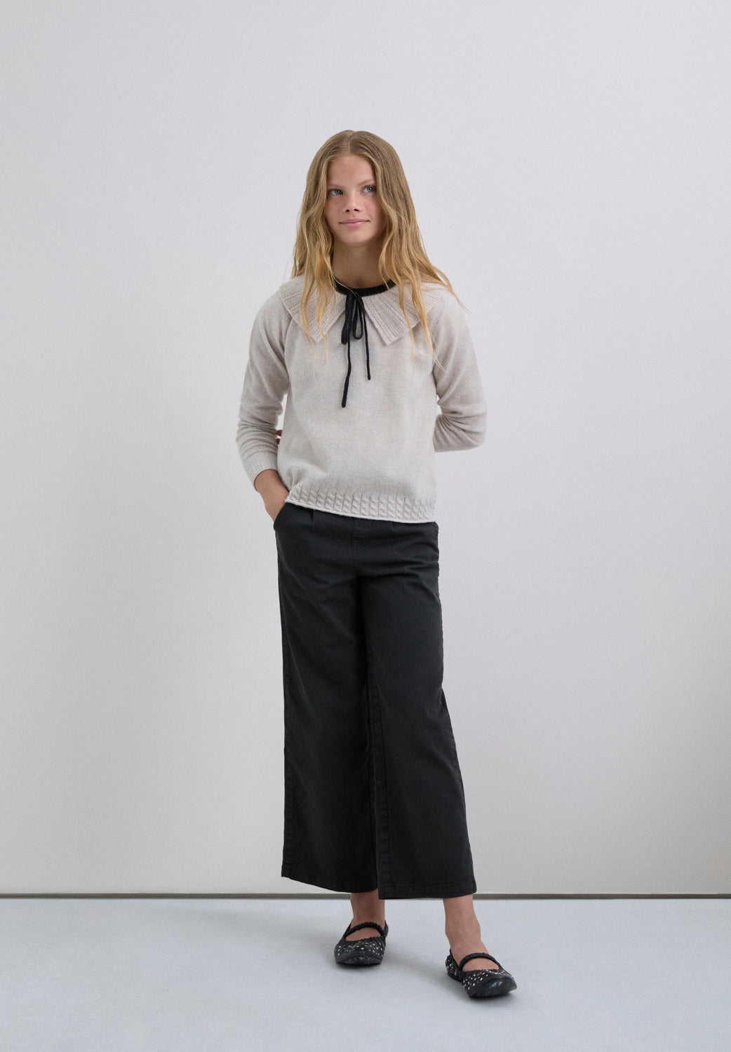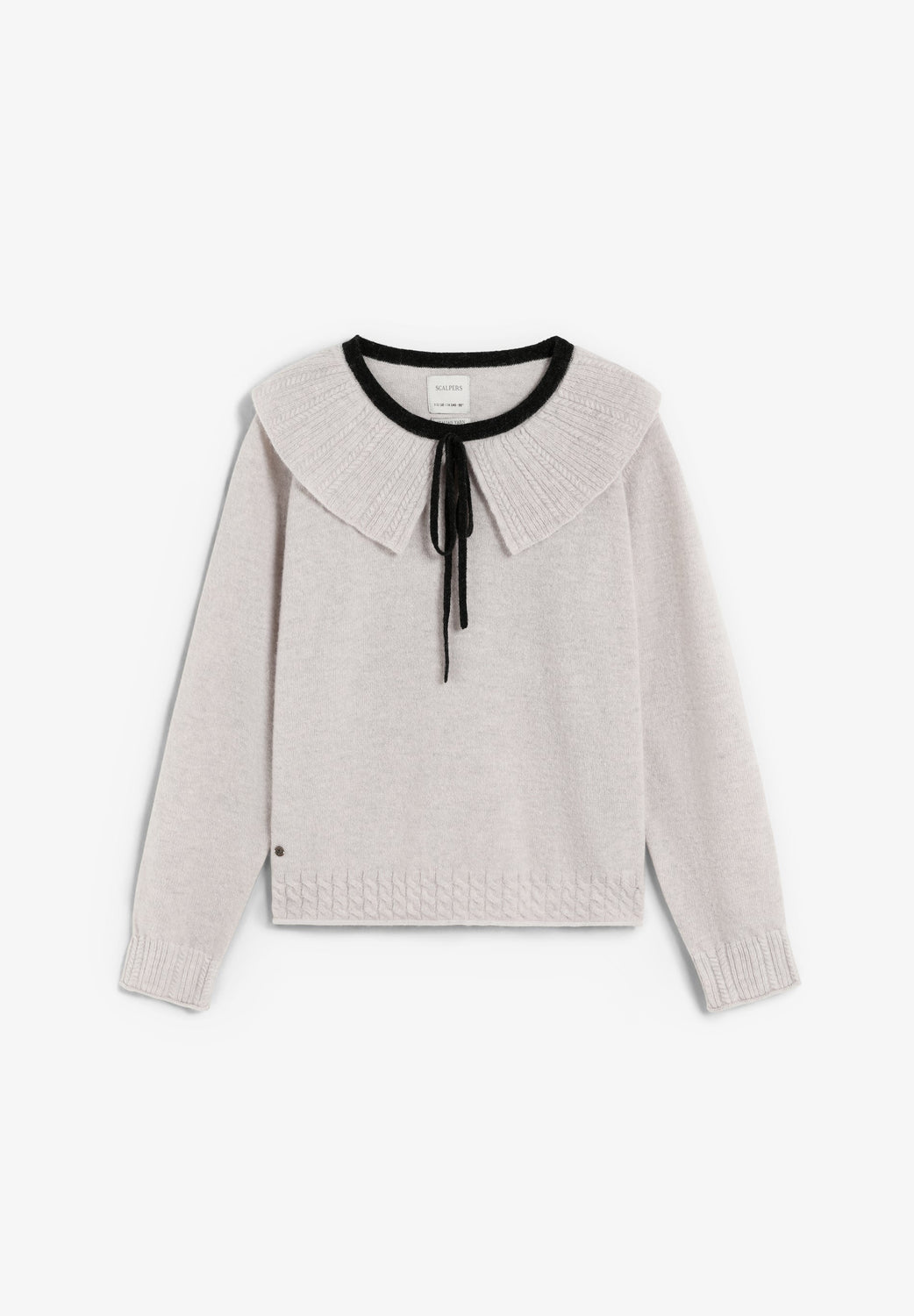 Knit sweater in a wool blend. Regular fit. Bib collar with contrast tie. Long sleeves with ribbed trim.