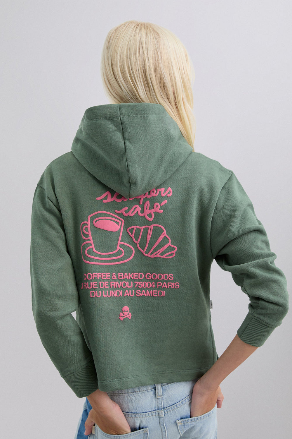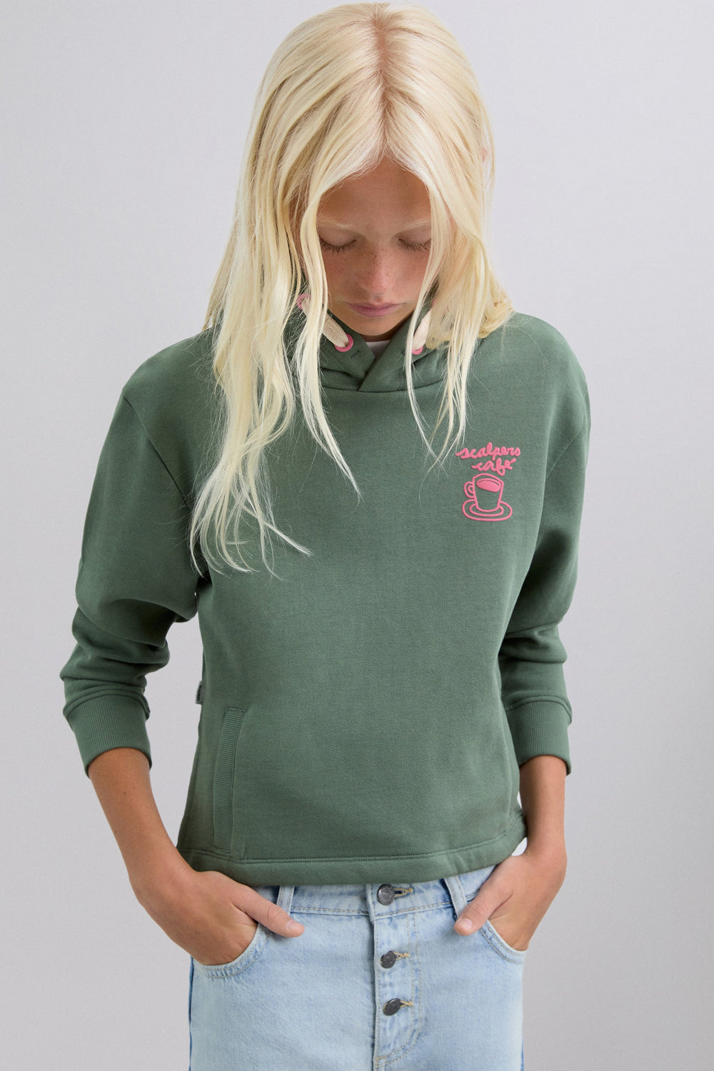 Sweatshirt with adjustable hood made of 100% BCI cotton. Long sleeves with cuffs and front pouch pockets. Print detail on the chest and back.