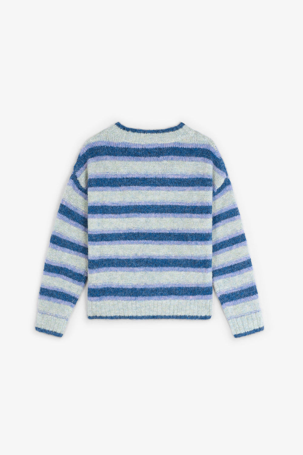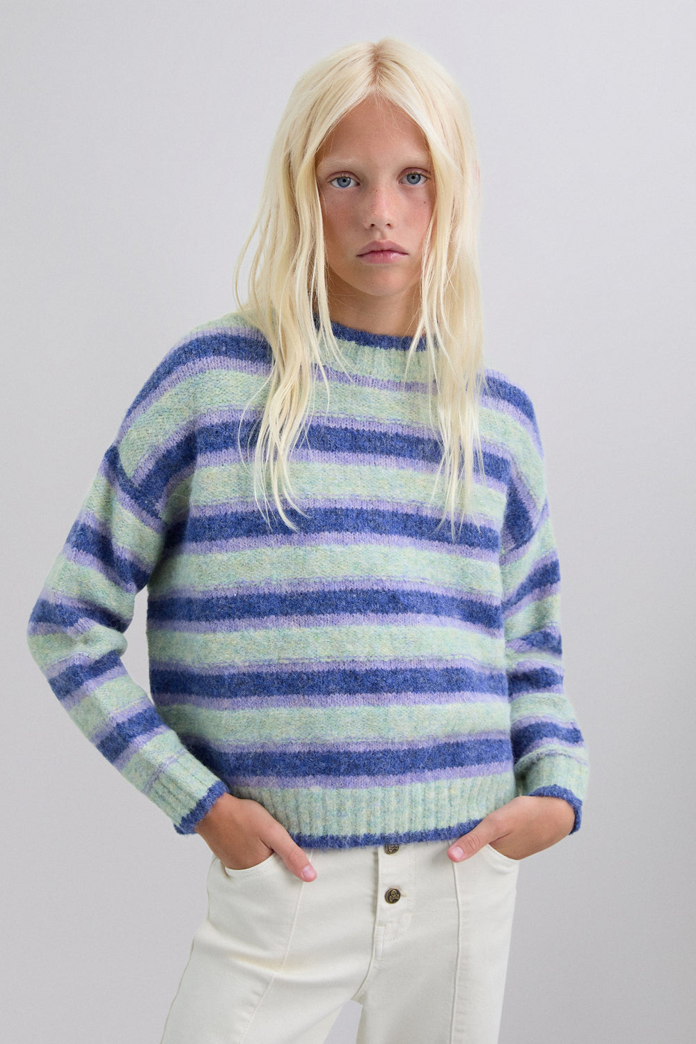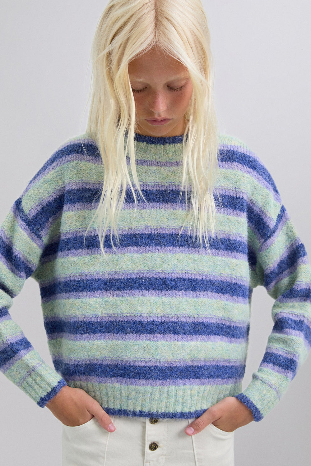 Knit sweater with stripe print. Long sleeves. Round neck. Ribbed trim.
