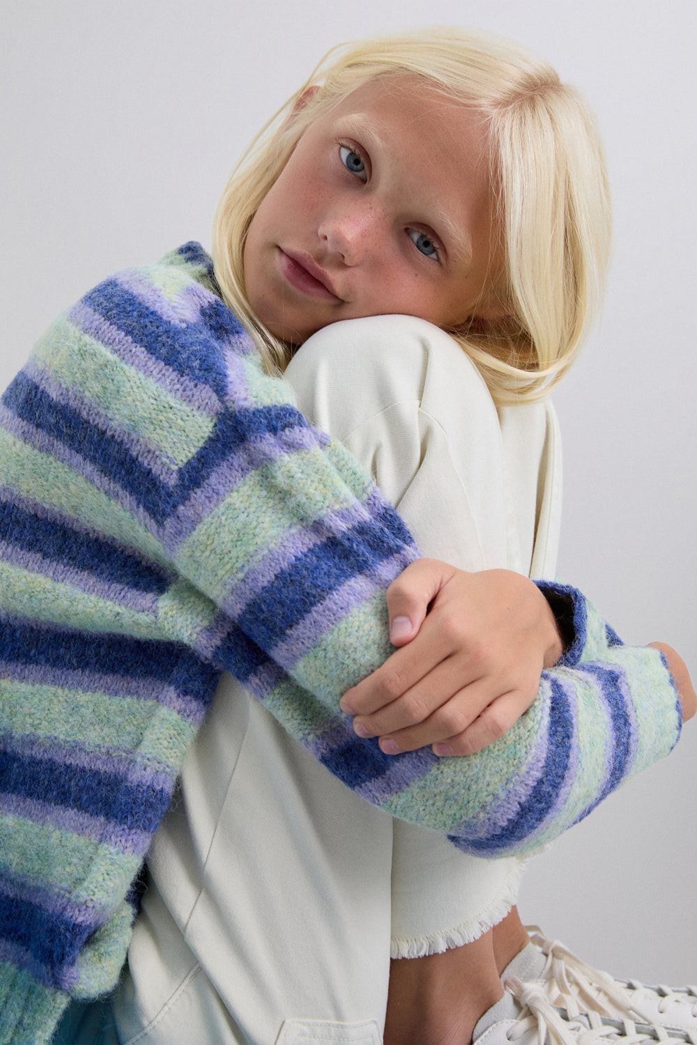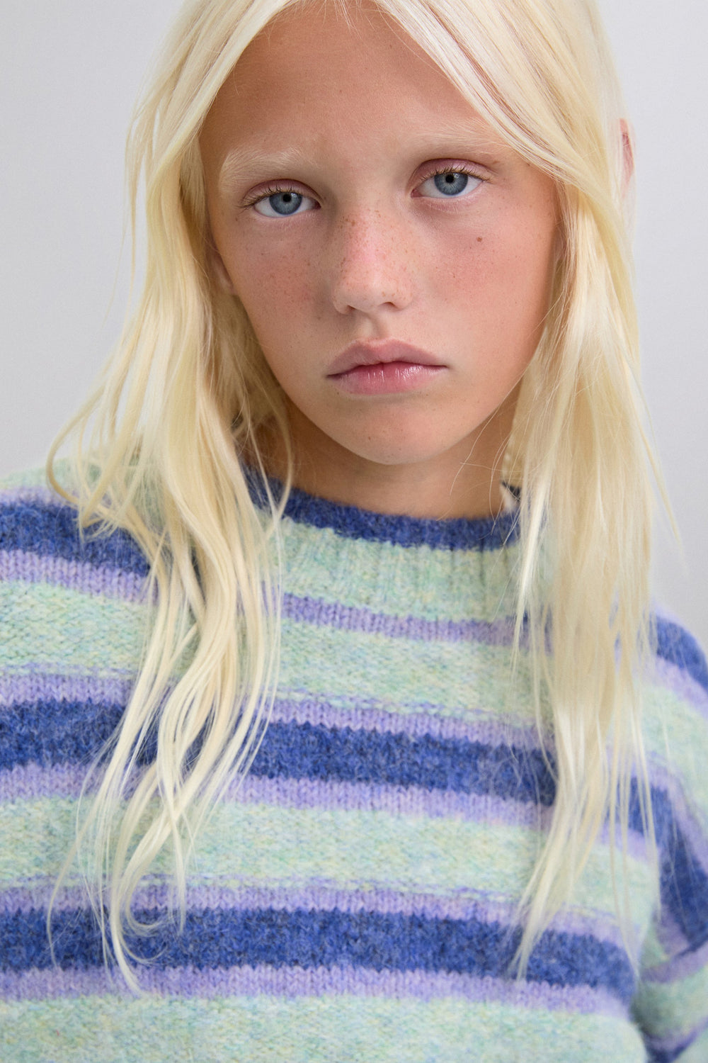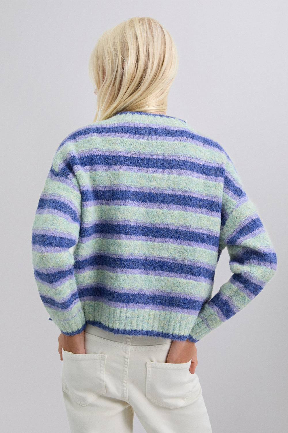 Knit sweater with stripe print. Long sleeves. Round neck. Ribbed trim.