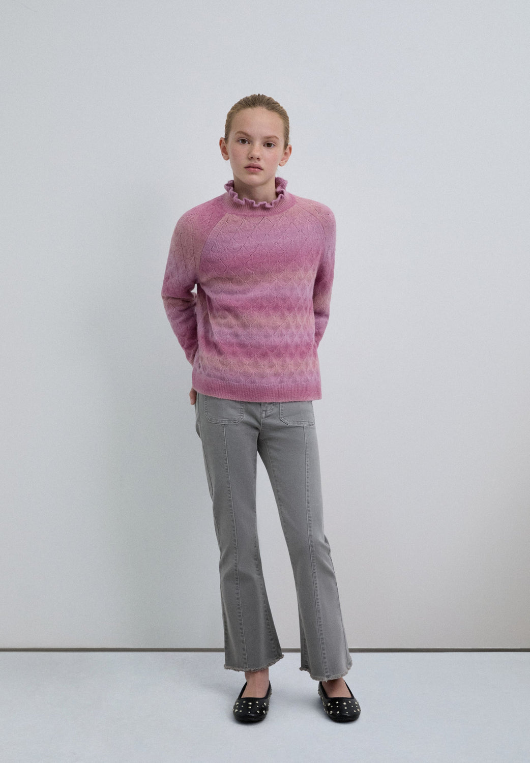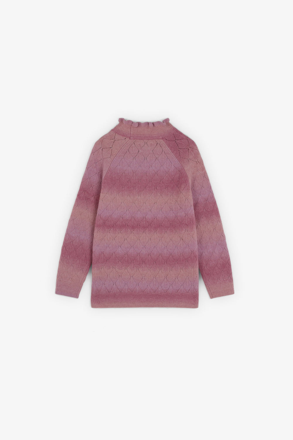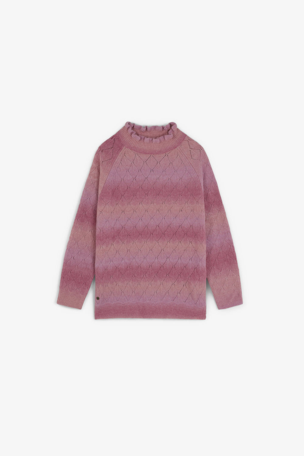Knit sweater made of a merino wool blend. High neck with ruffles. Long sleeves with ribbed cuffs. Perforated diamond pattern.