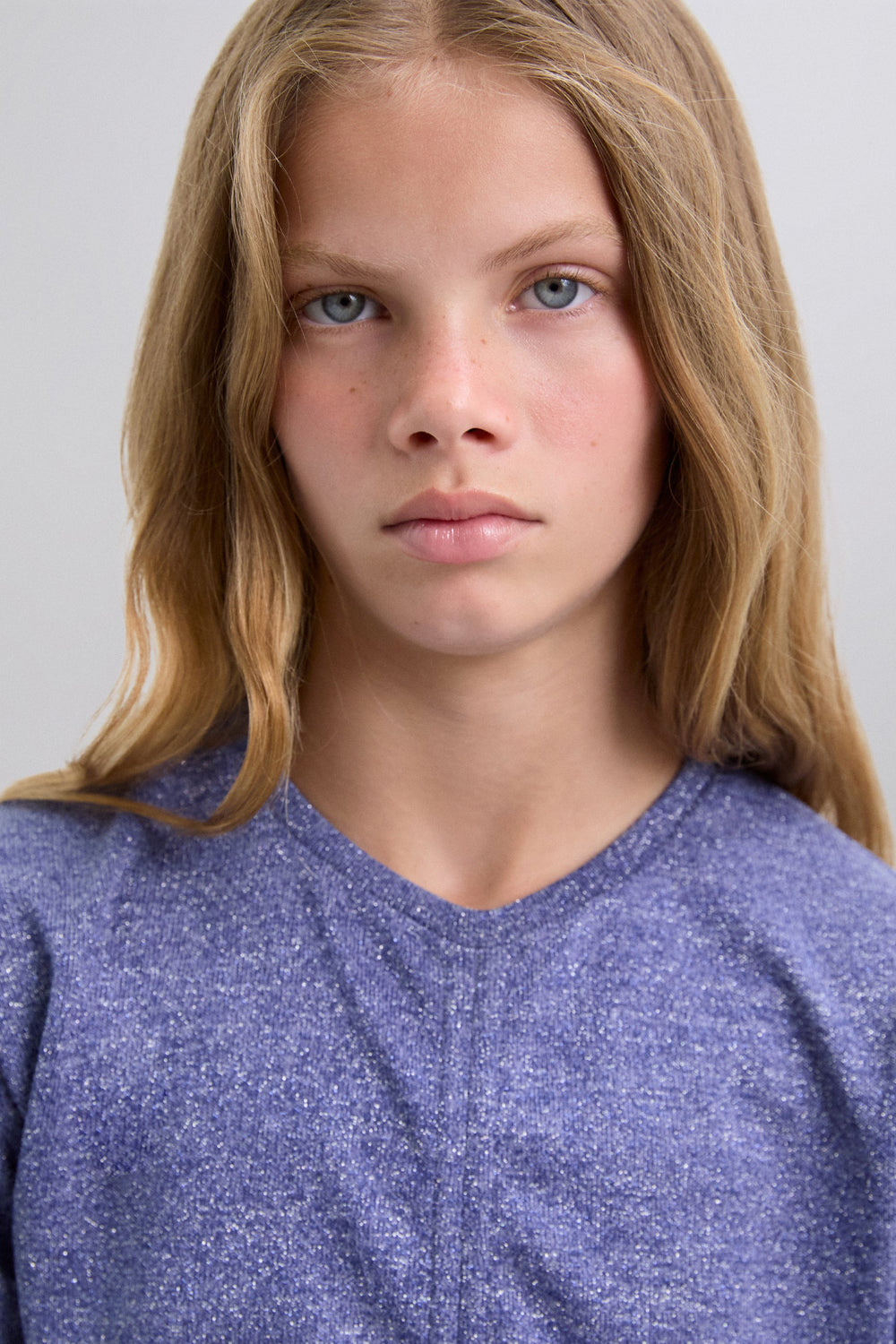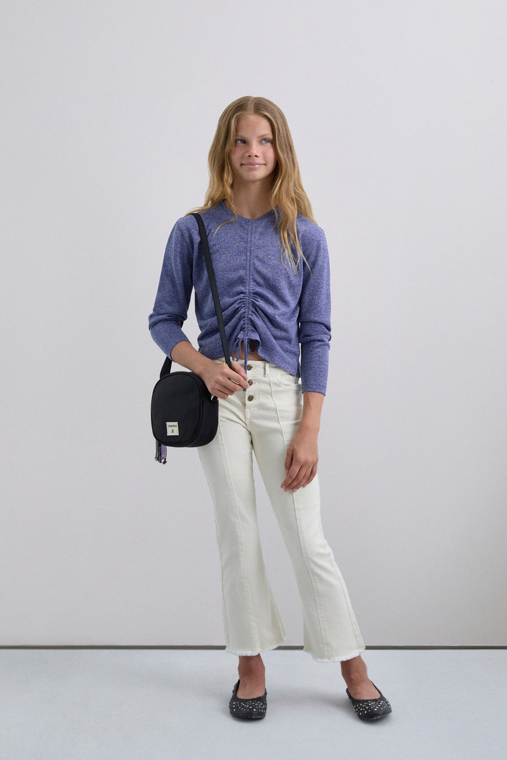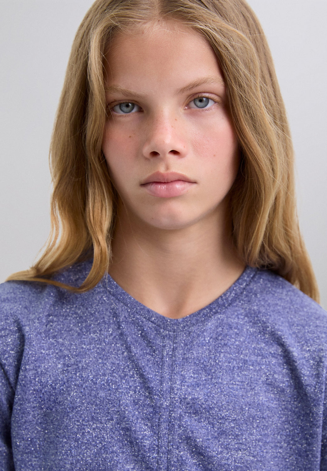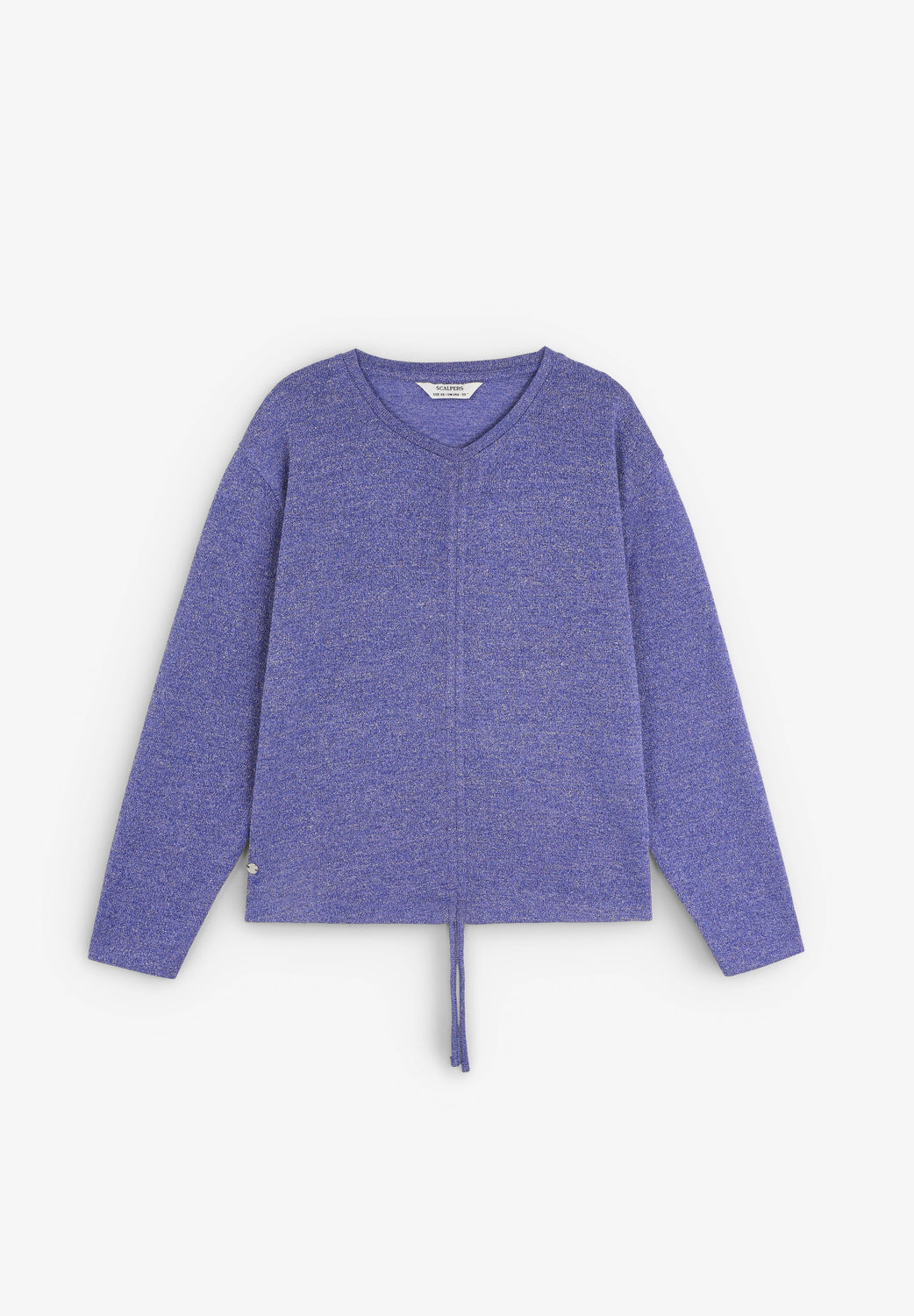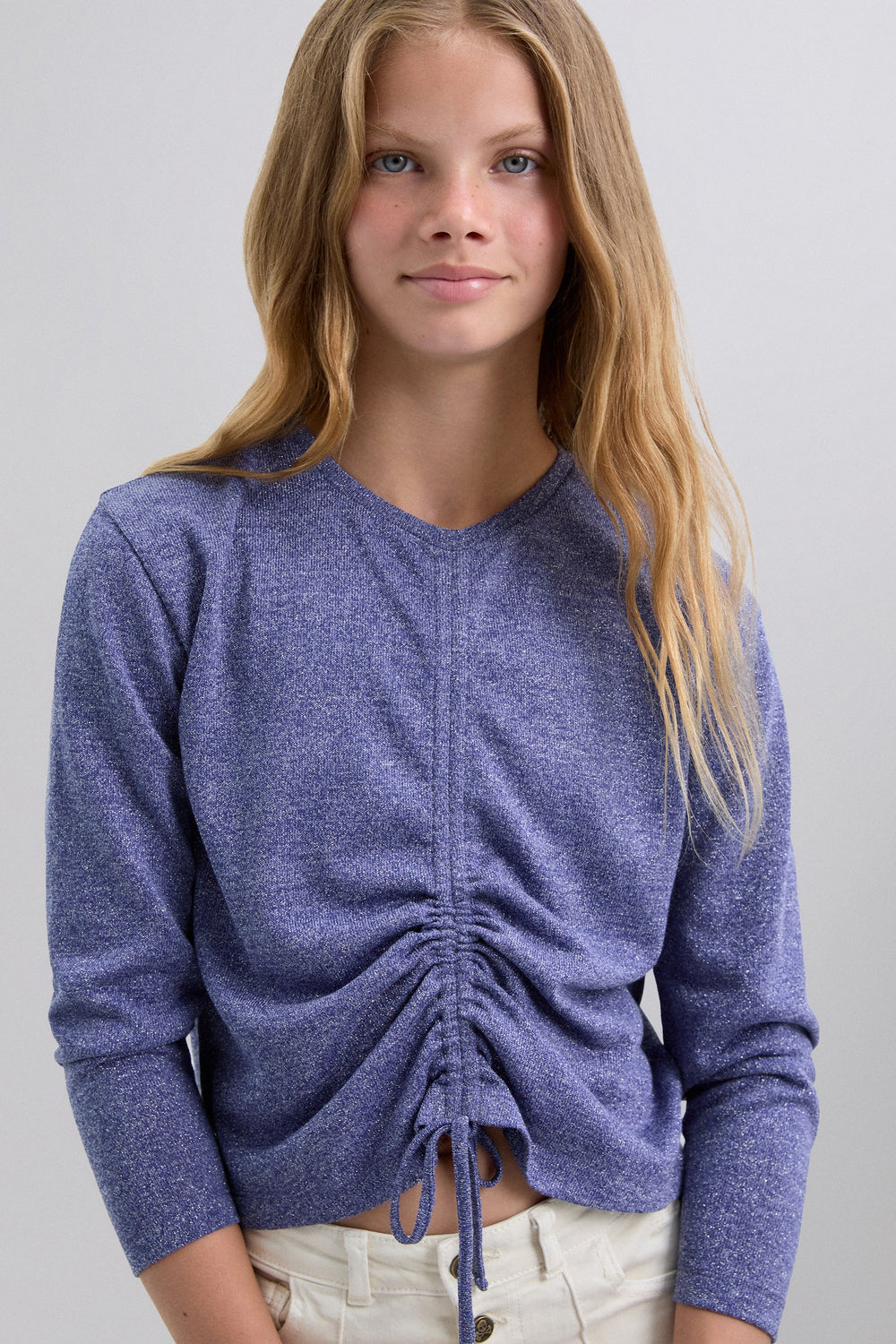 Fluid fabric shirt with metallic thread. Regular fit. Slight V-neck. Long sleeves. Gathered tie front.