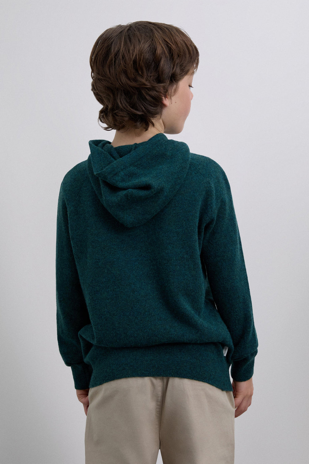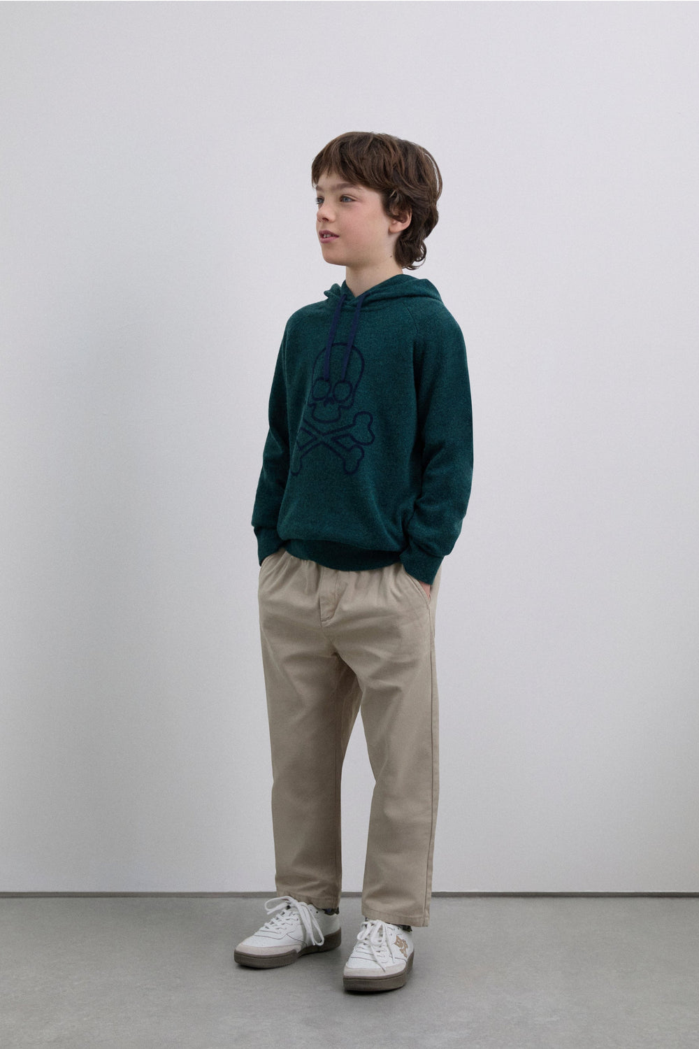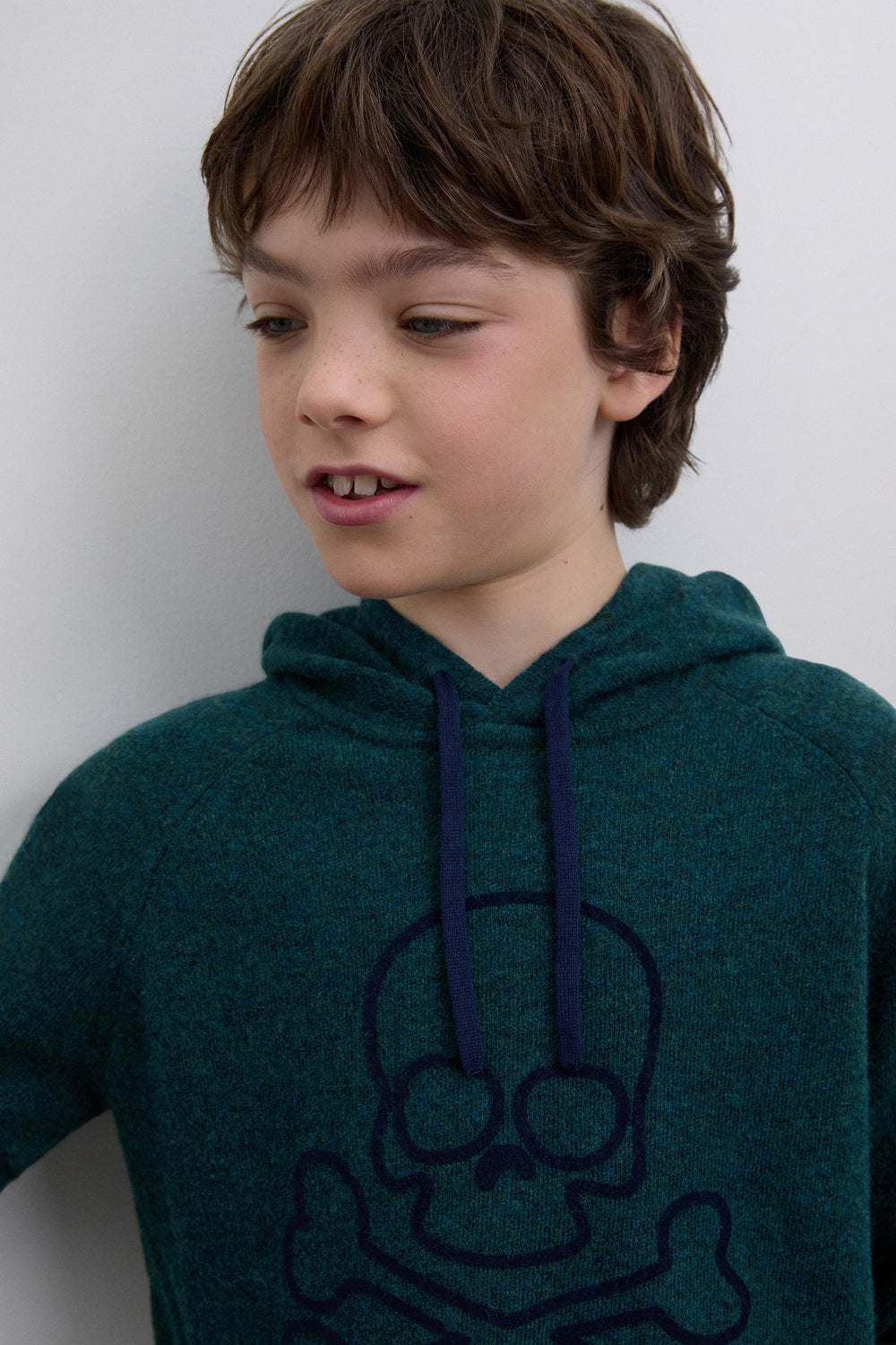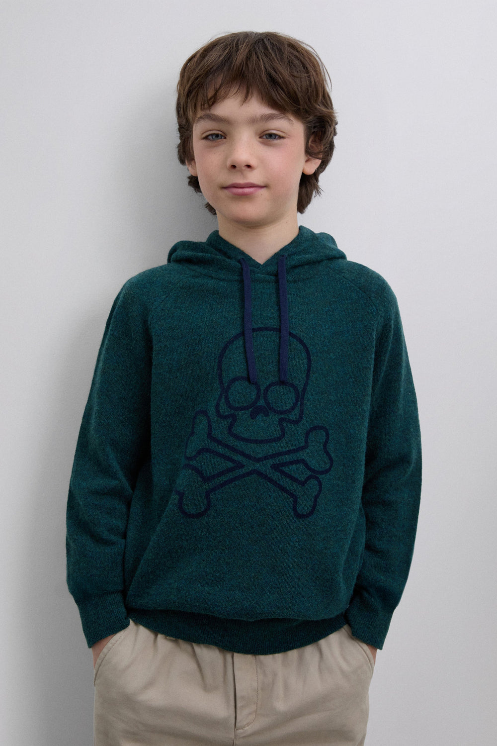 Long sleeve hooded sweater. Regular fit. Collar with adjustable hood. Contrast front skull detail.