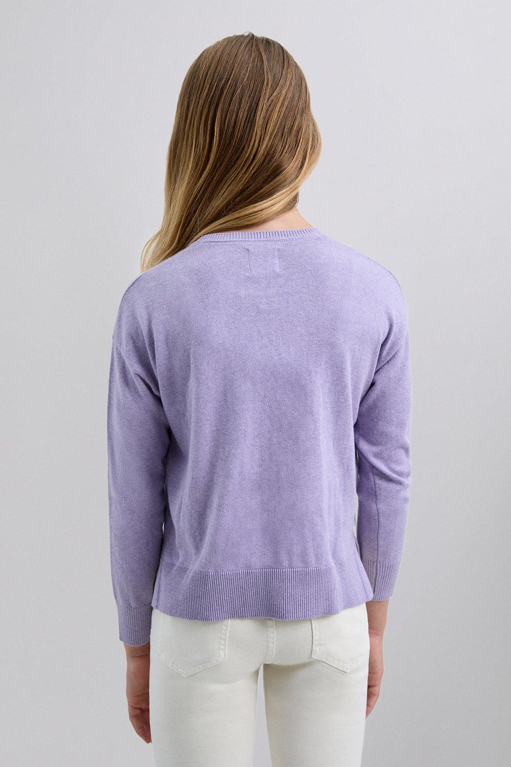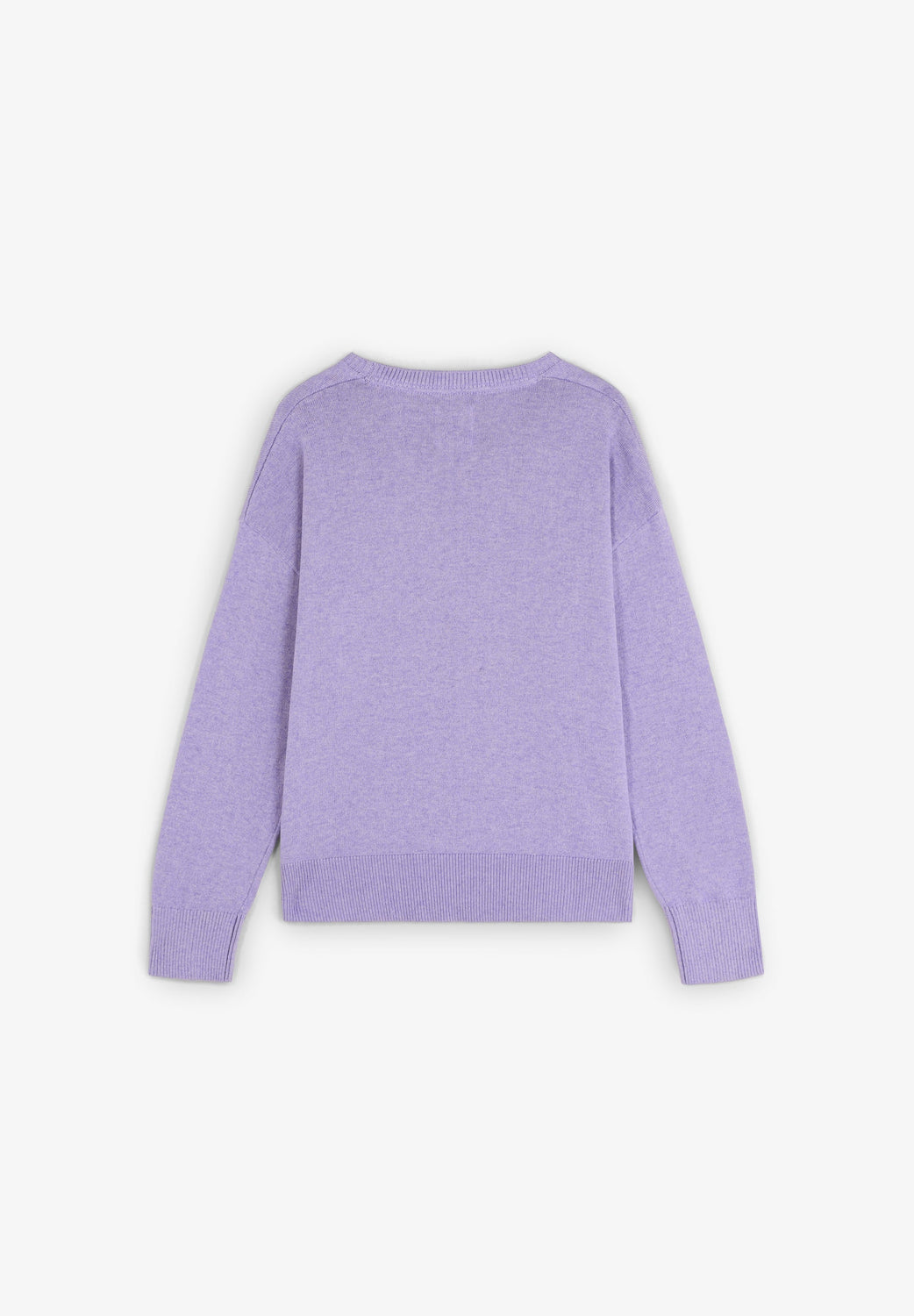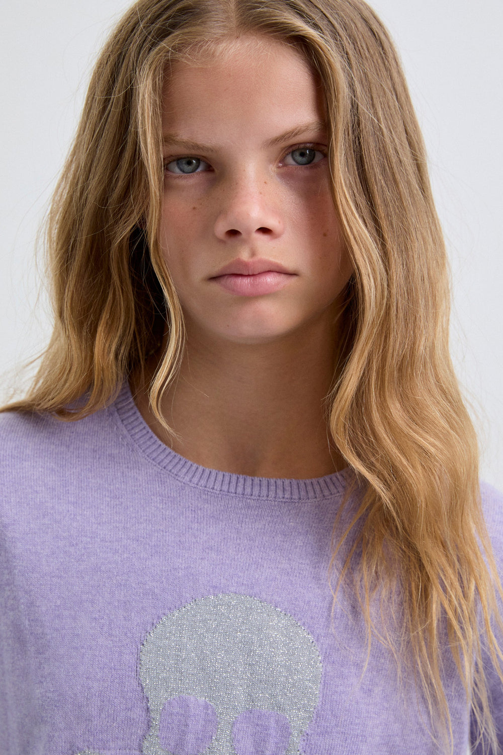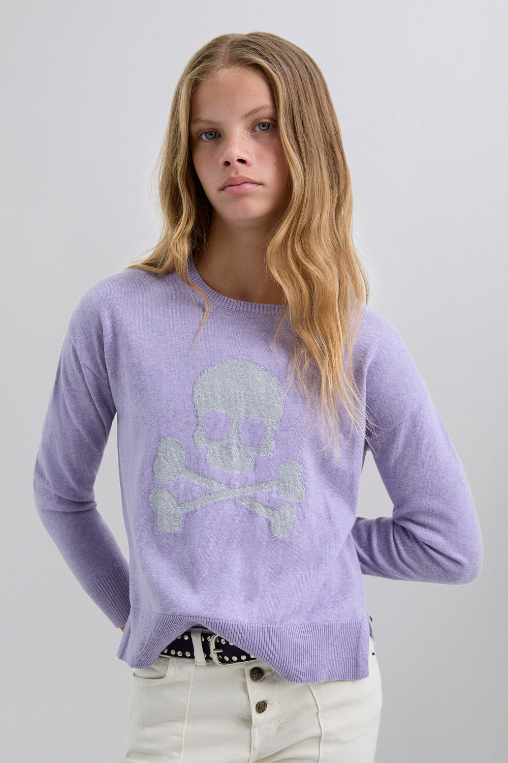 Synthetic blend knit sweater with skull print on the front. Matching ribbed round neck. Cuffed sleeves and hem. Side slit on hem.
