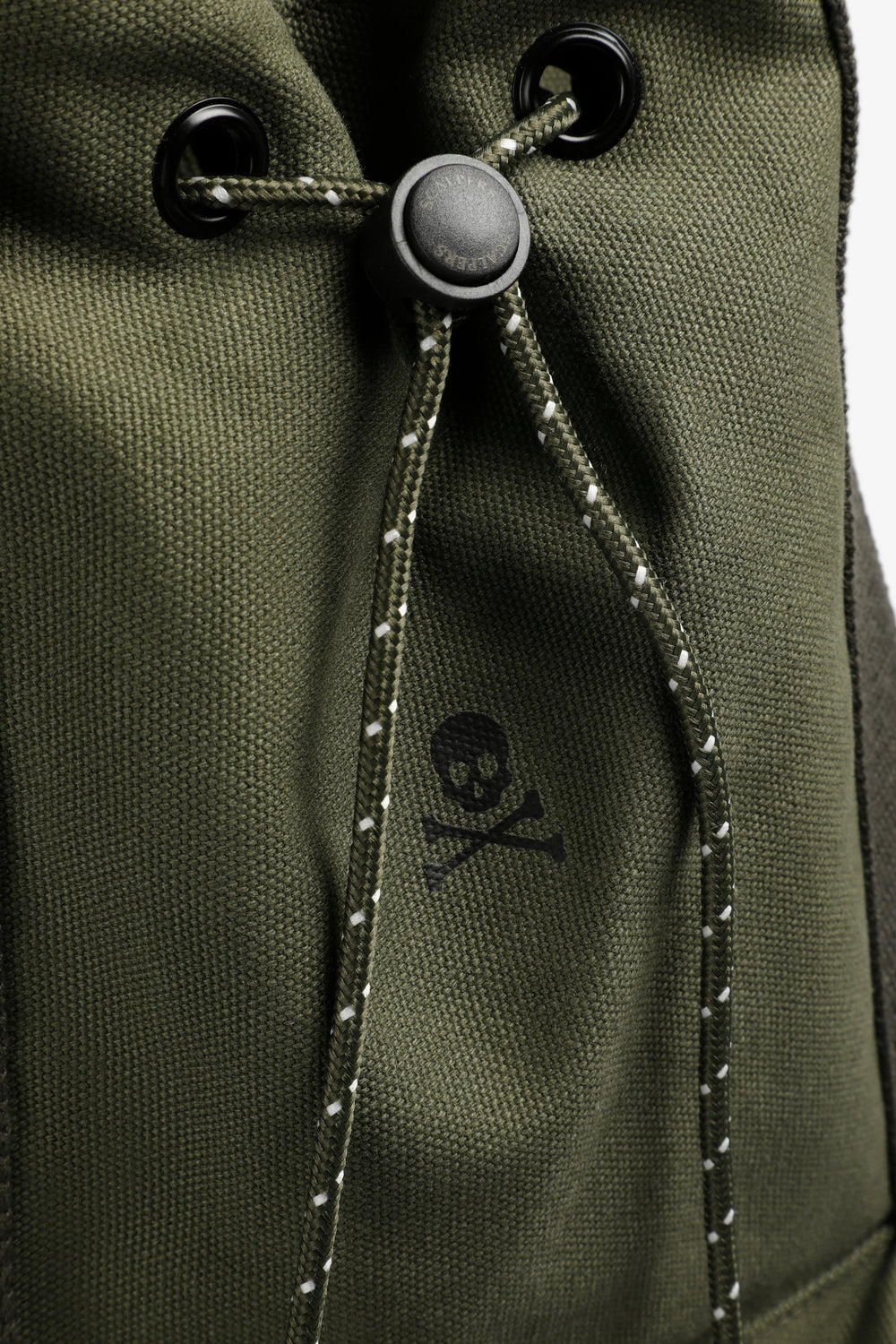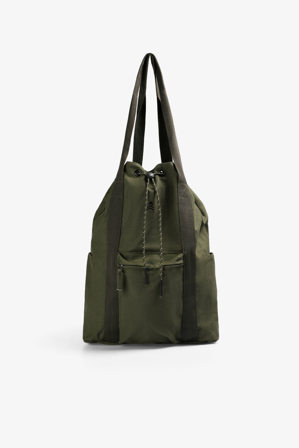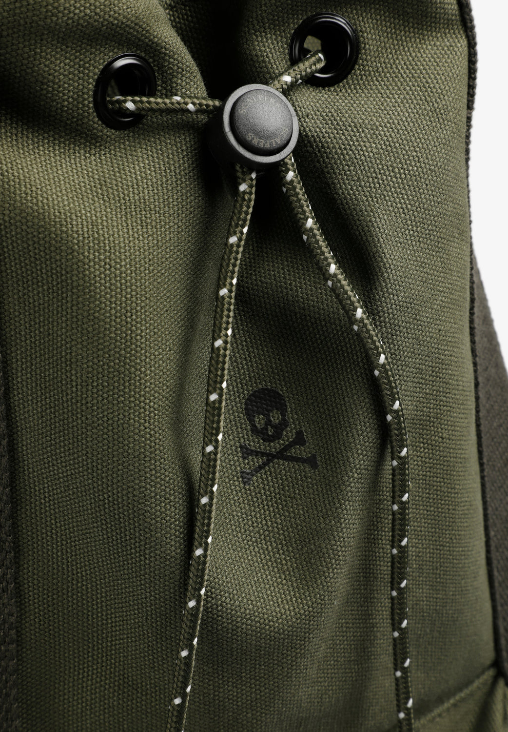 Bag made of 100% cotton. Double strap. Adjustable zip, inner pocket and outside cargo-style pocket. Contrast skull and logo detail: