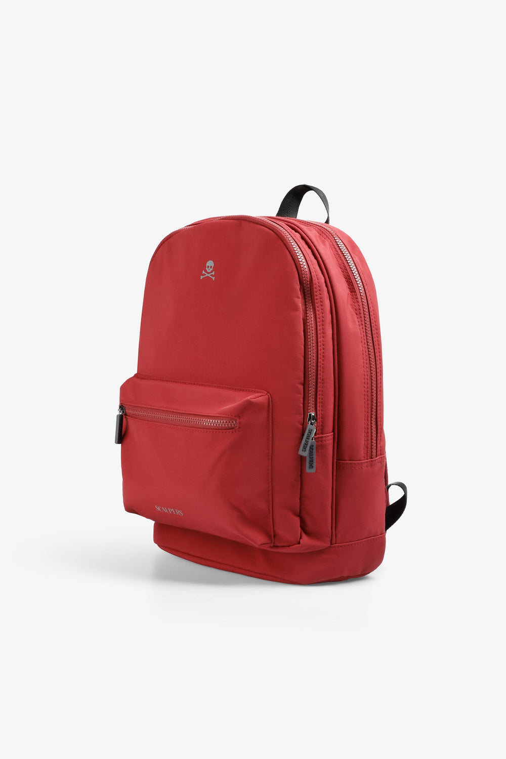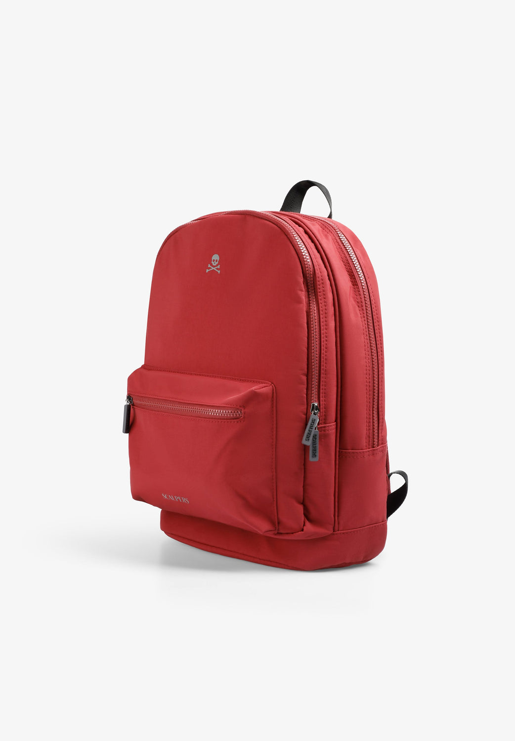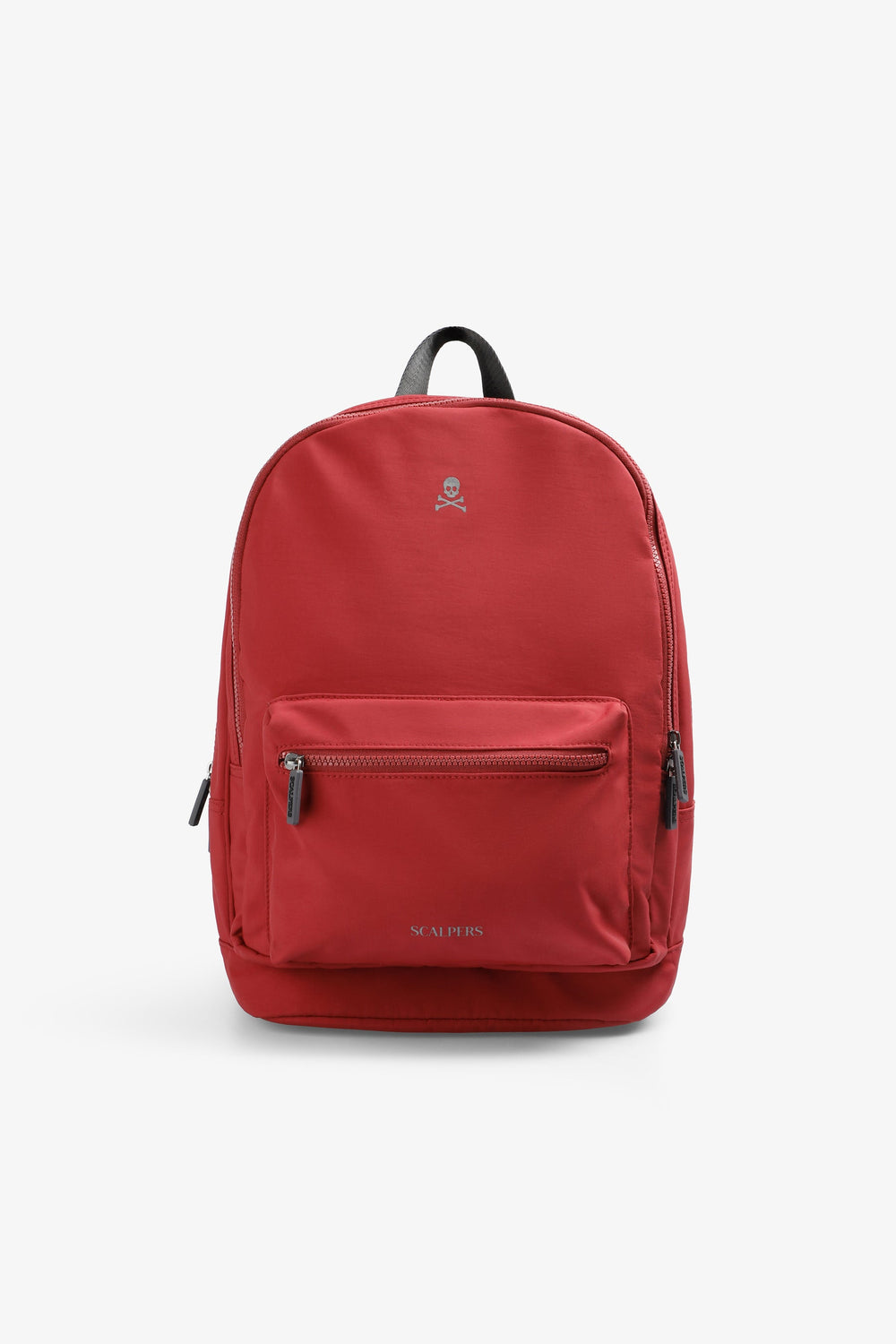 Backpack made of a technical fabric. Outer pocket on the front. Adjustable buckle fastening. Front logo and skull print detail. Top handle. Side and back fastening adjustments. Padded reinforced back.