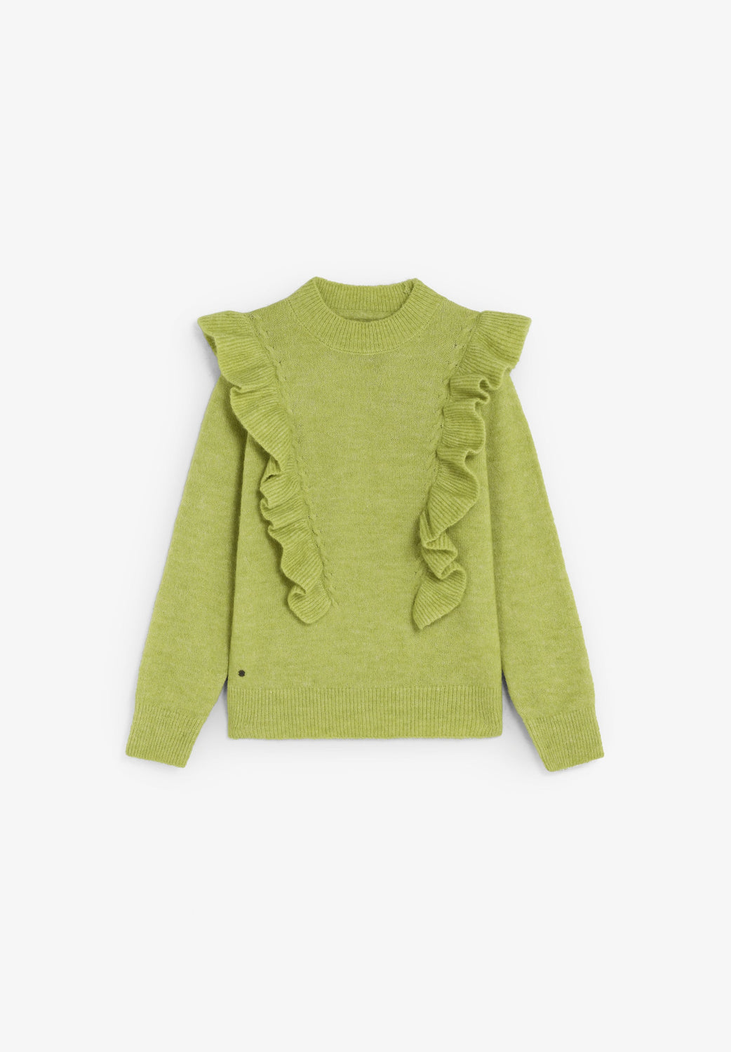 Sweater made of a synthetic blend. Long sleeves. Regular fit. Slightly high collar and ribbed cuffs. Front ruffle details.