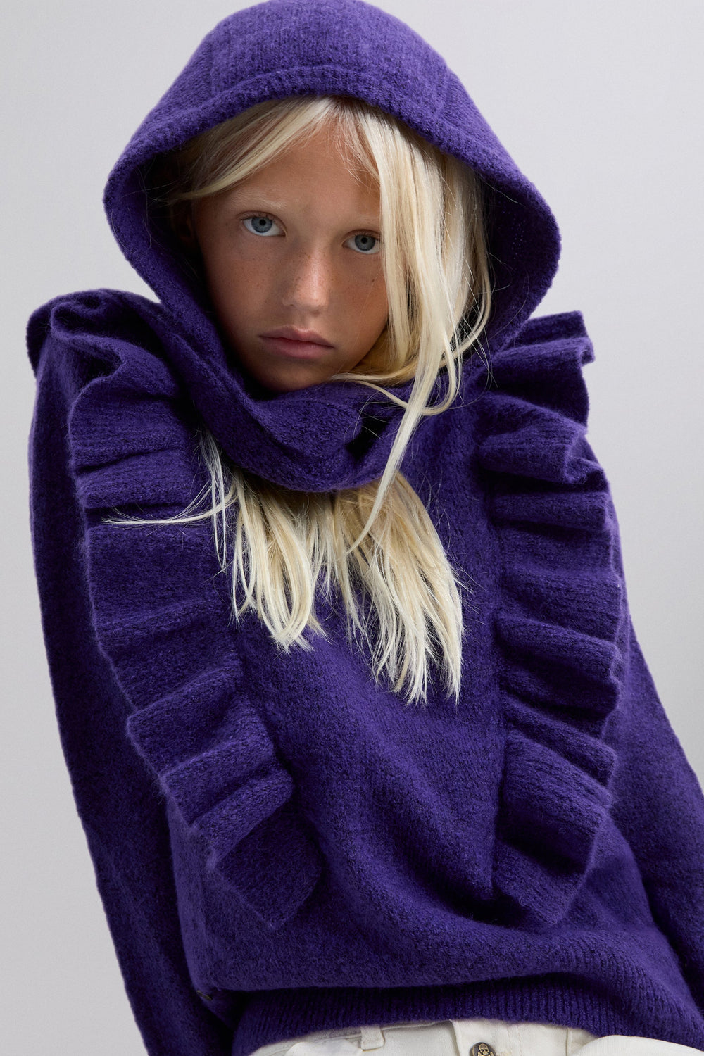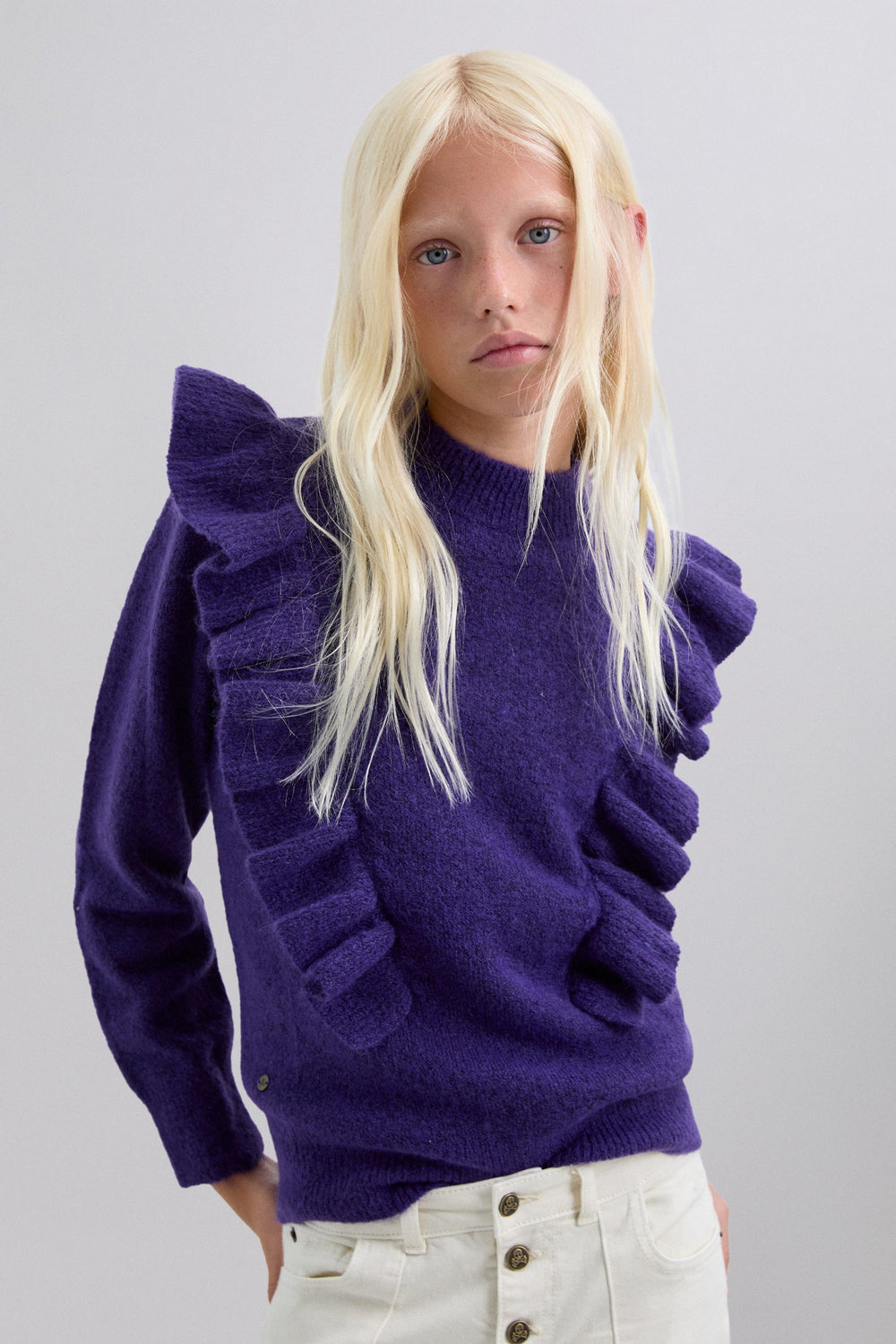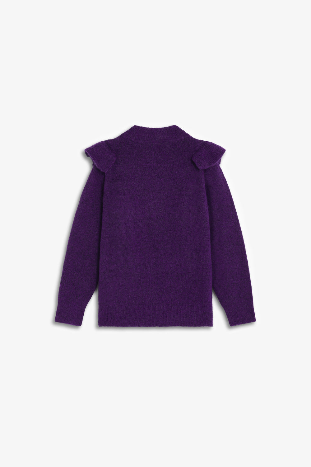 Sweater made of a synthetic blend. Long sleeves. Regular fit. Slightly high collar and ribbed cuffs. Front ruffle details.