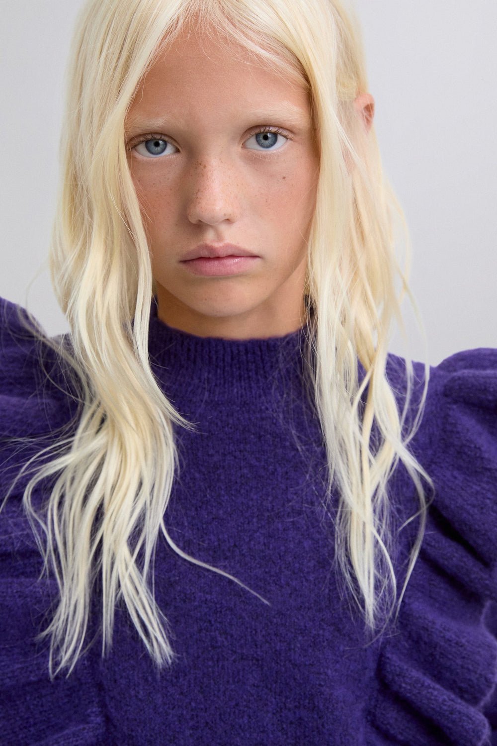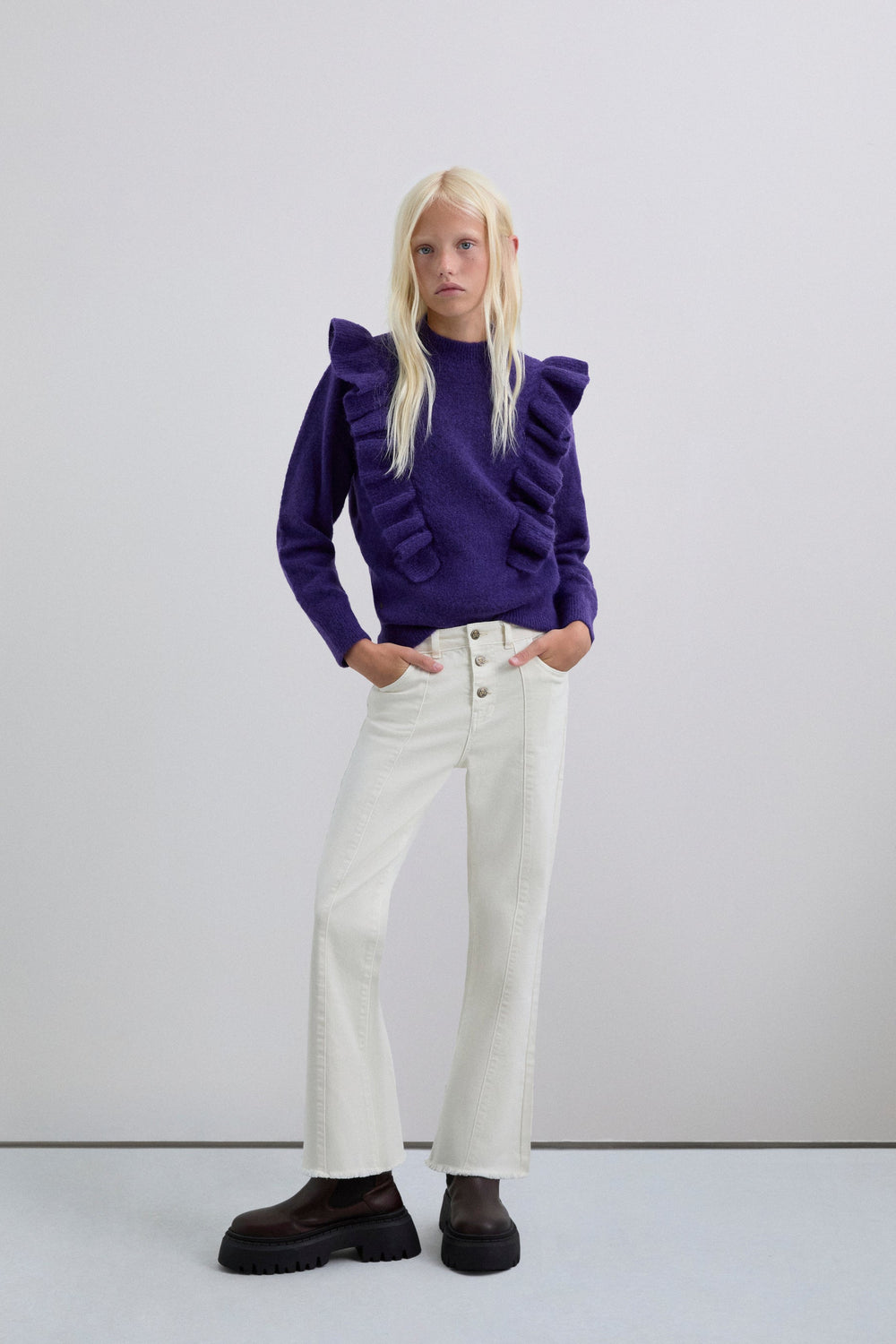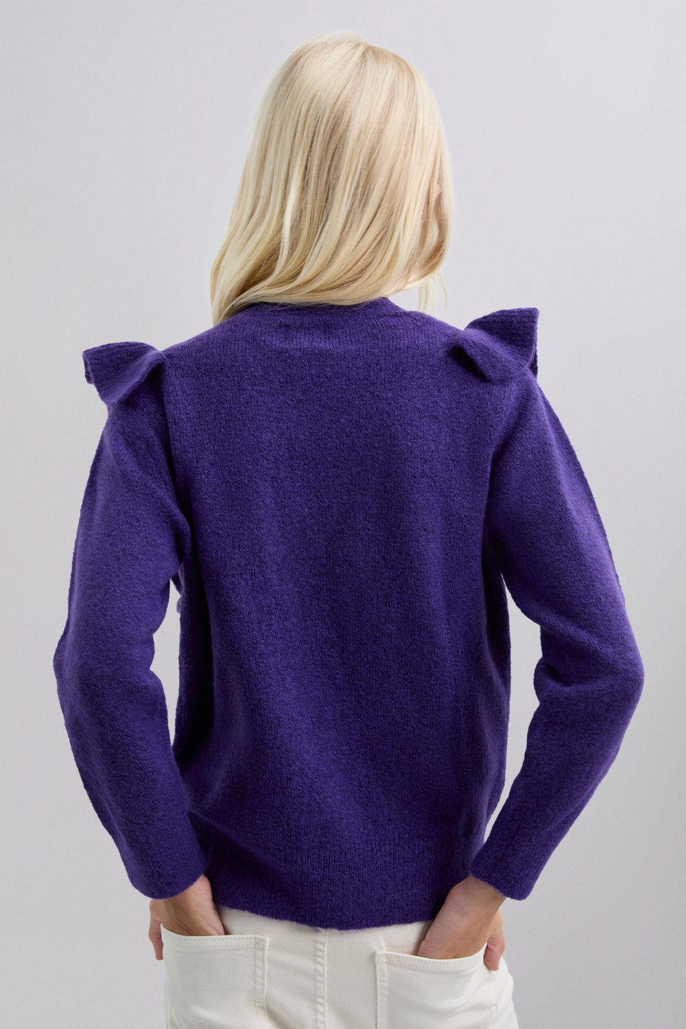 Sweater made of a synthetic blend. Long sleeves. Regular fit. Slightly high collar and ribbed cuffs. Front ruffle details.