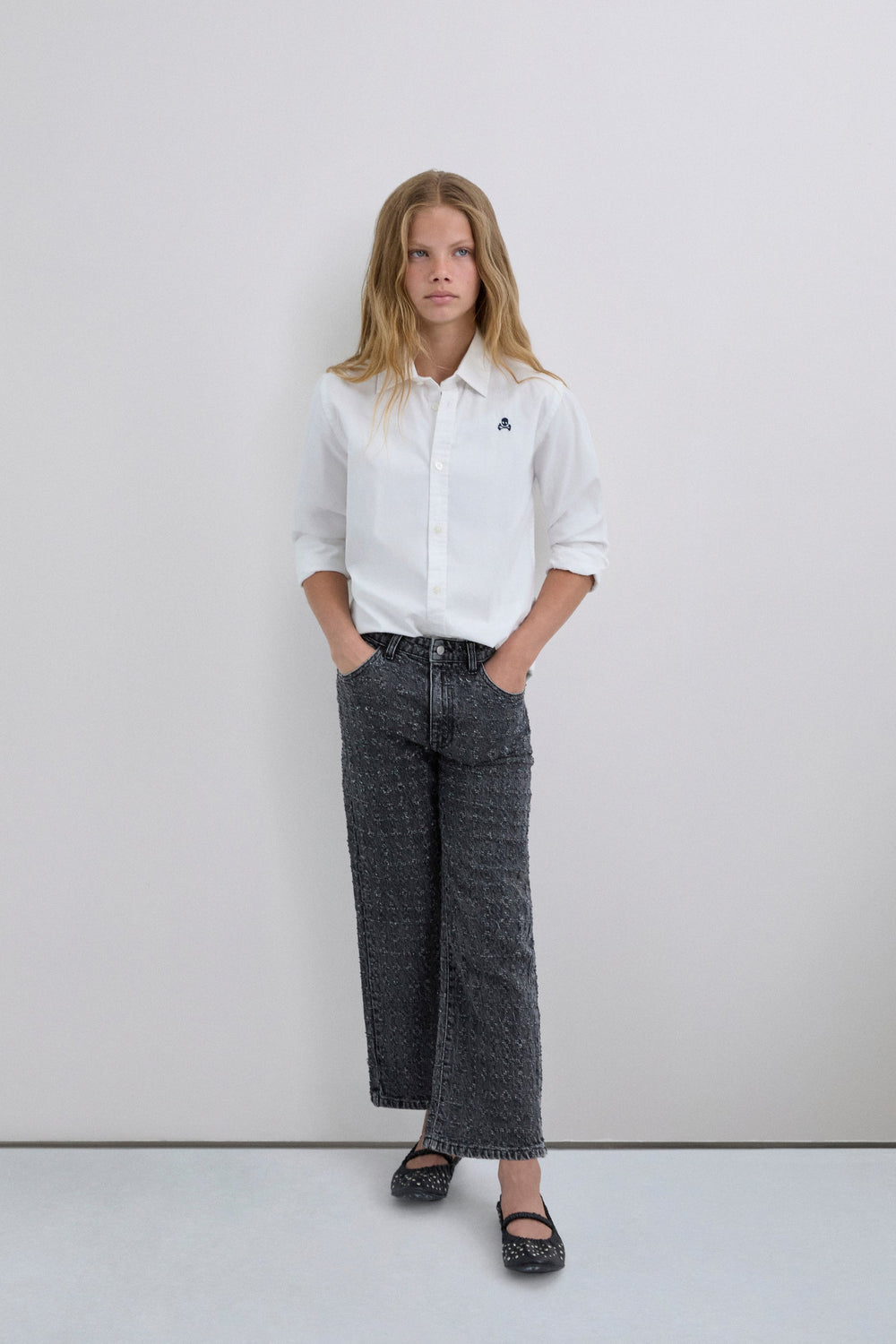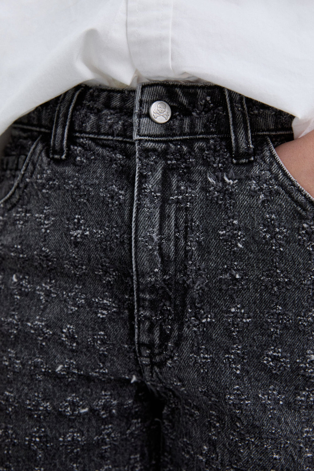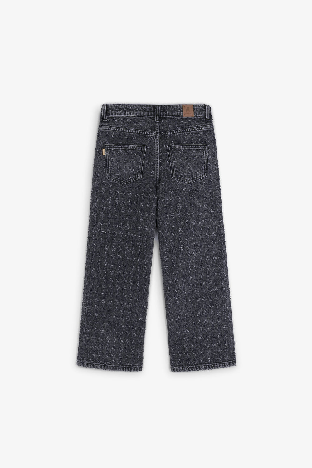Jeans made of slightly stretchy cotton with laser-printed metallic thread. Flared cut, zip and button fastening and belt loops. Side and back pockets.