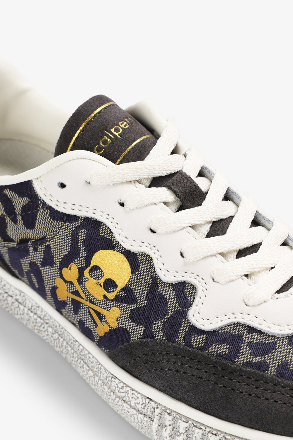 Leather low top sneakers. Contrast skull on side. Animal print. Lace-up fastening. TPR worn effect sole. Contrast metallic detail on heel and logo detail on tongue and bottom side.