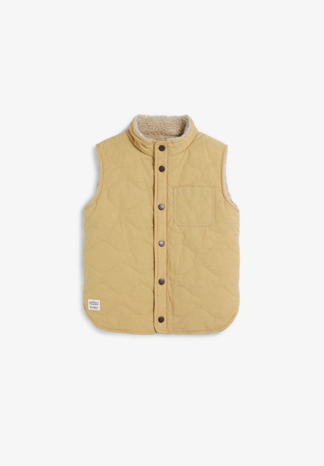 Sleeveless puffer jacket with outside pocket. Faux shealing lining. High collar. Regular fit. Button fastening.