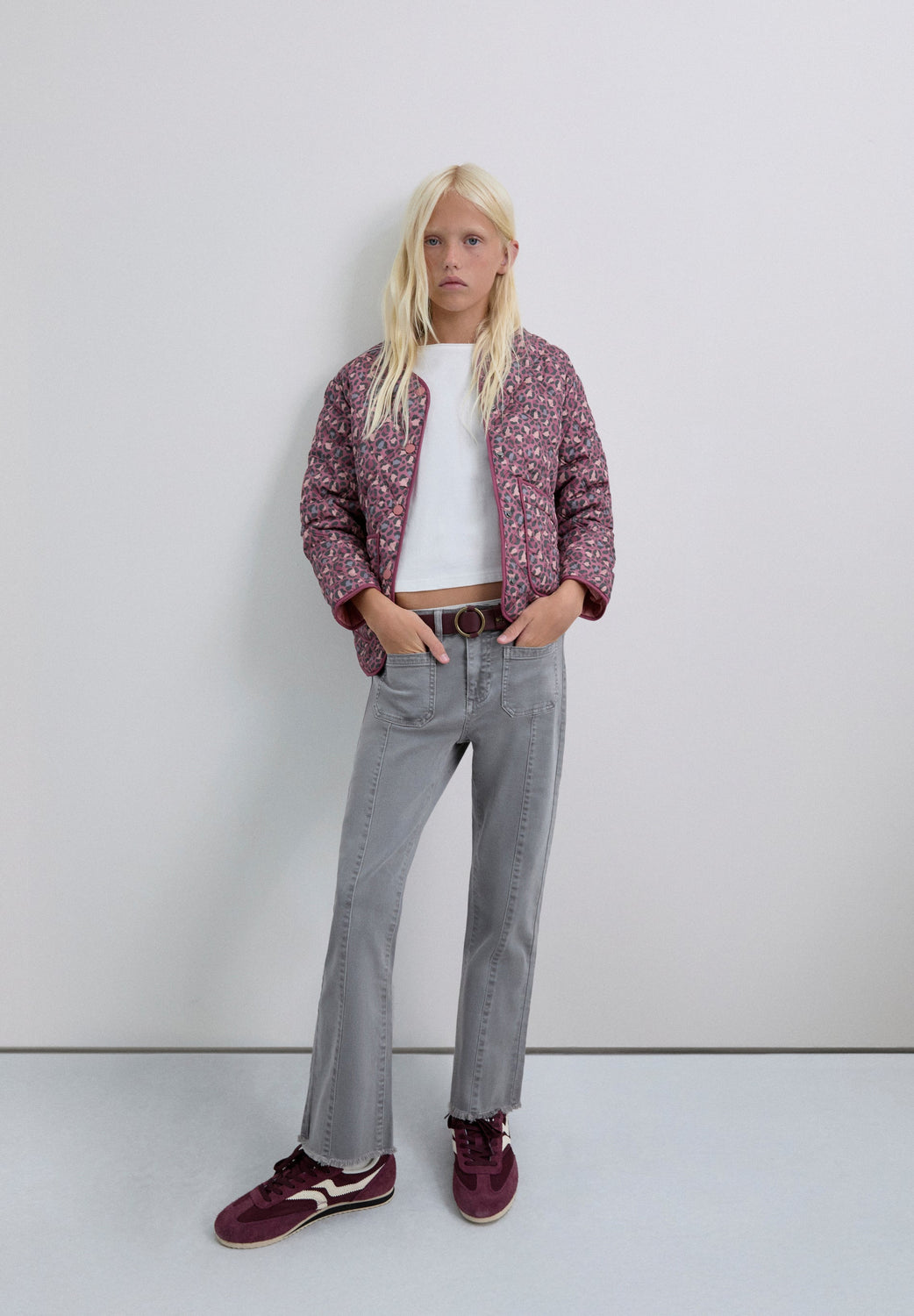 Puffer jacket made of a synthetic blend. Animal print. Button fastening. Slightly V-neck. Long sleeves. Two front pockets.