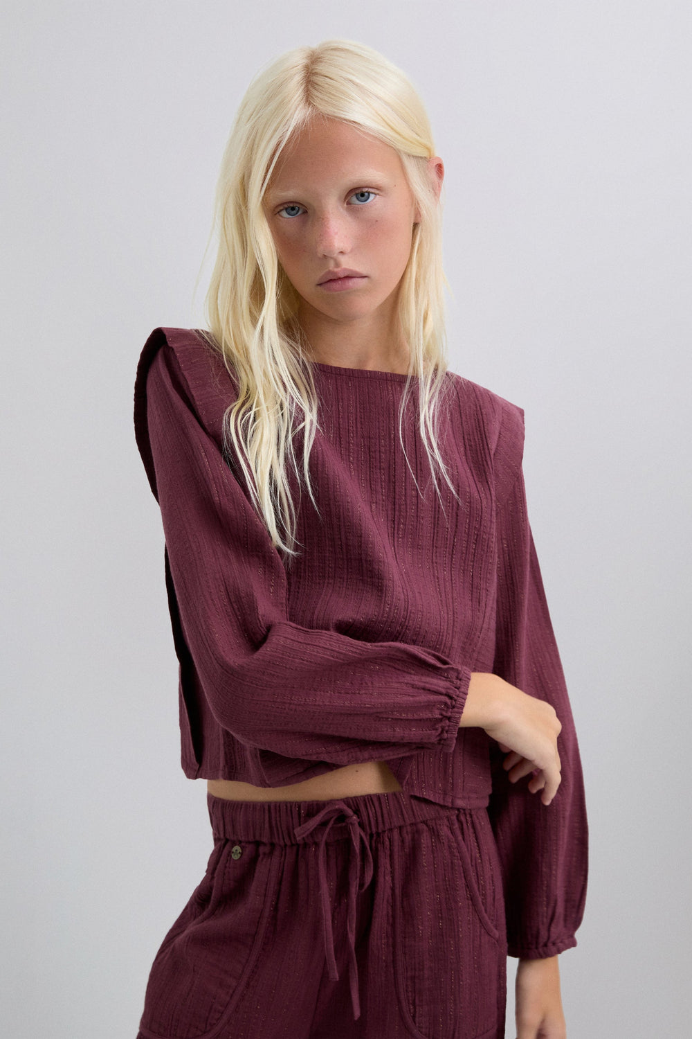 Blouse made of BCI cotton. Round neck. Front pleats. Ribbed details. Long sleeves. Elasticated cuffs. Back button fastening.