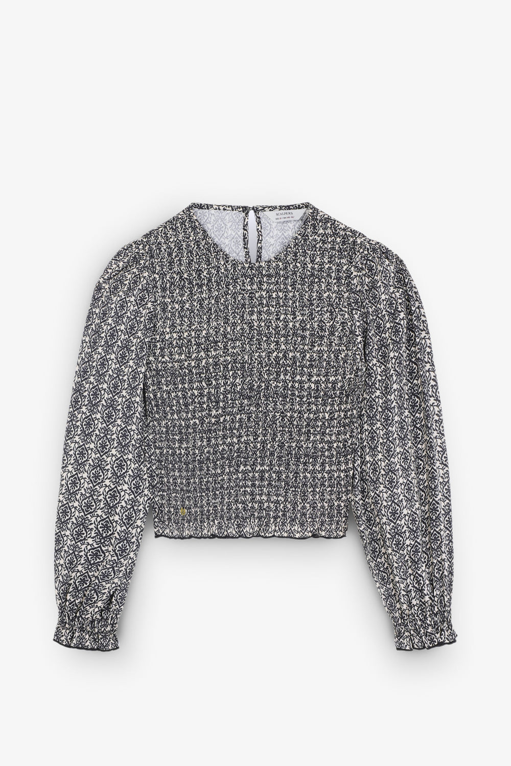 Blouse made of 100% viscose with smocking. Regular fit, round neck and back button fastening. Long sleeves with elasticated cuffs and ruffle on the hem.
