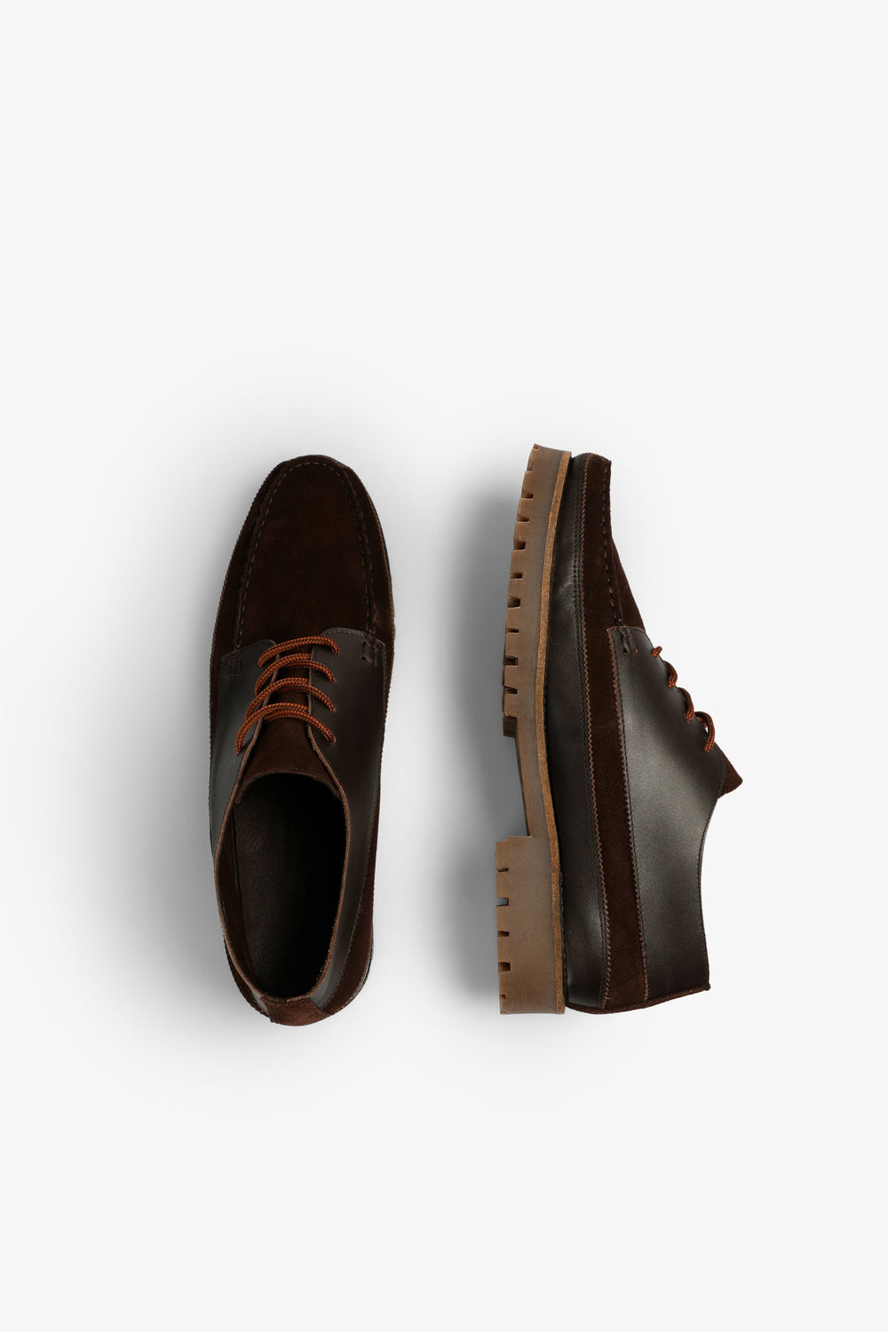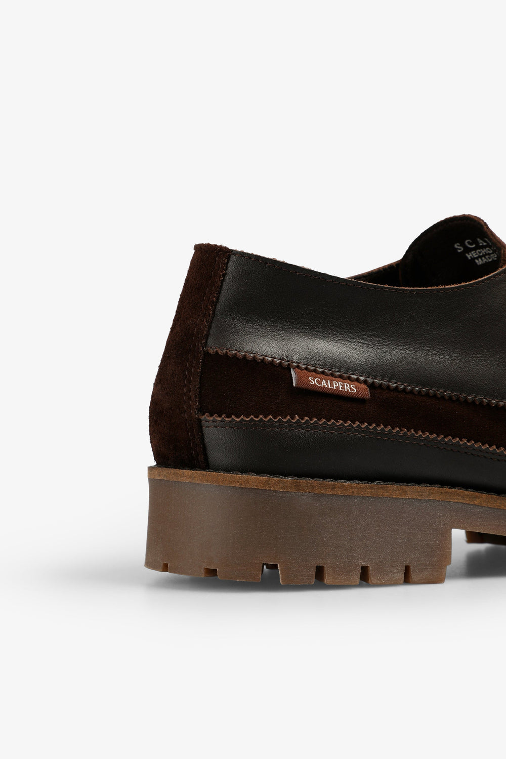 Shoes made of 100% cowhide leather. Contrast lace-up fastening Label detail on heel. Track soles.