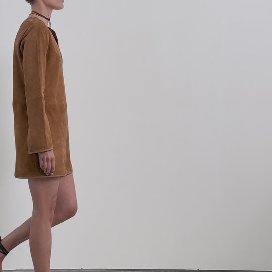 Mini dress made in goatskin with suede finish. Crew neck. Sleeves. Lined. Seams detail.