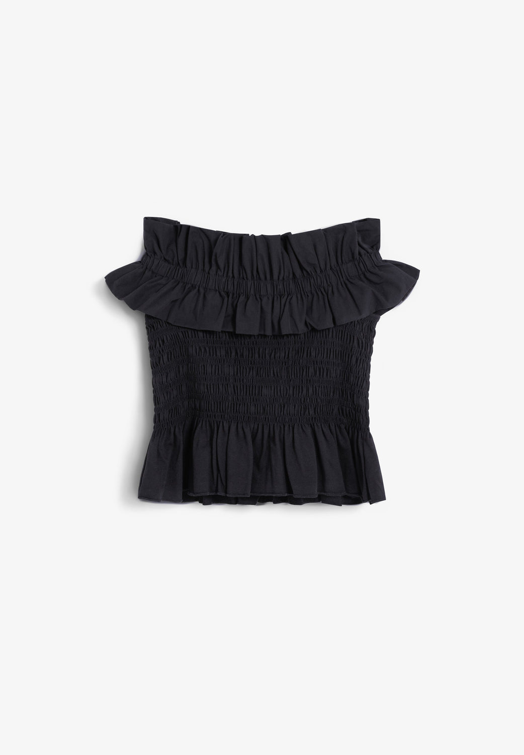 Top made of 100% BCI cotton. Slim fit. Off the shoulder with gathering and ruffles detail. Smocking on the body.