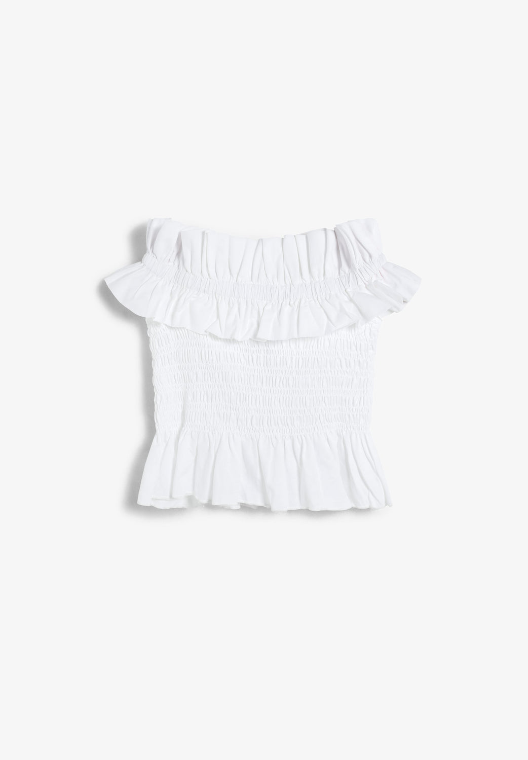 Top made of 100% BCI cotton. Slim fit. Off the shoulder with gathering and ruffles detail. Smocking on the body.