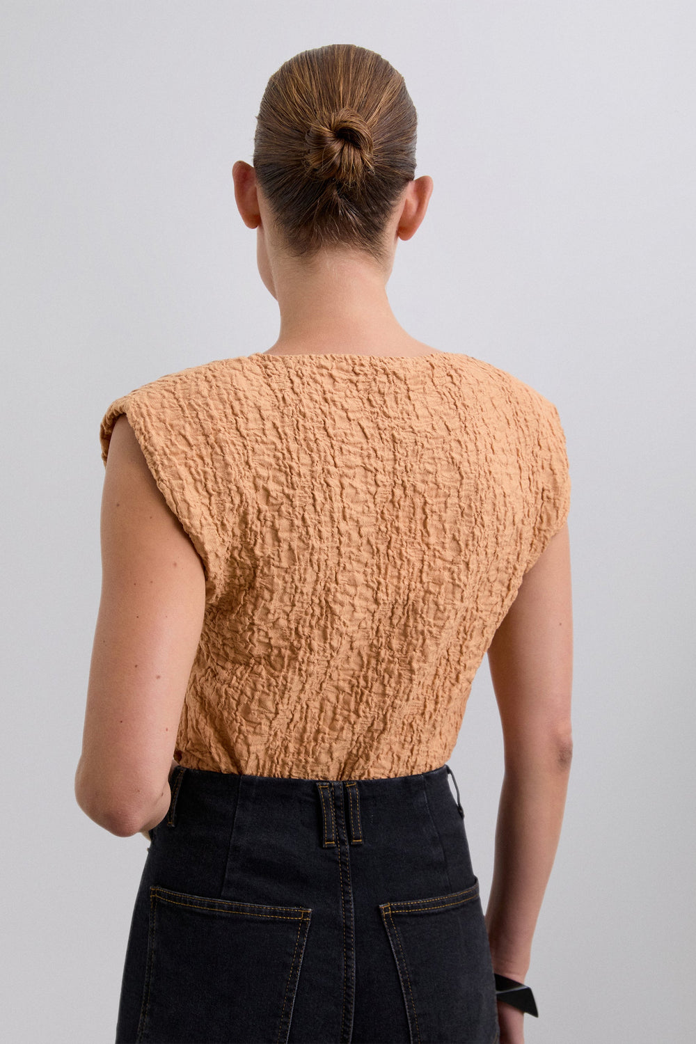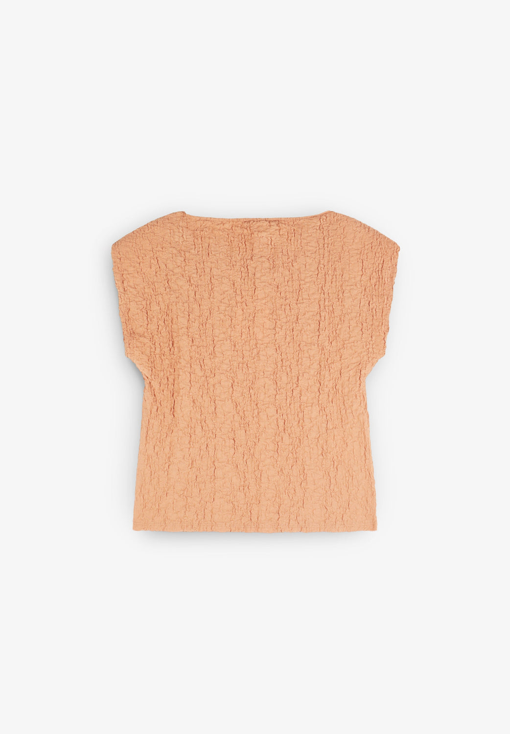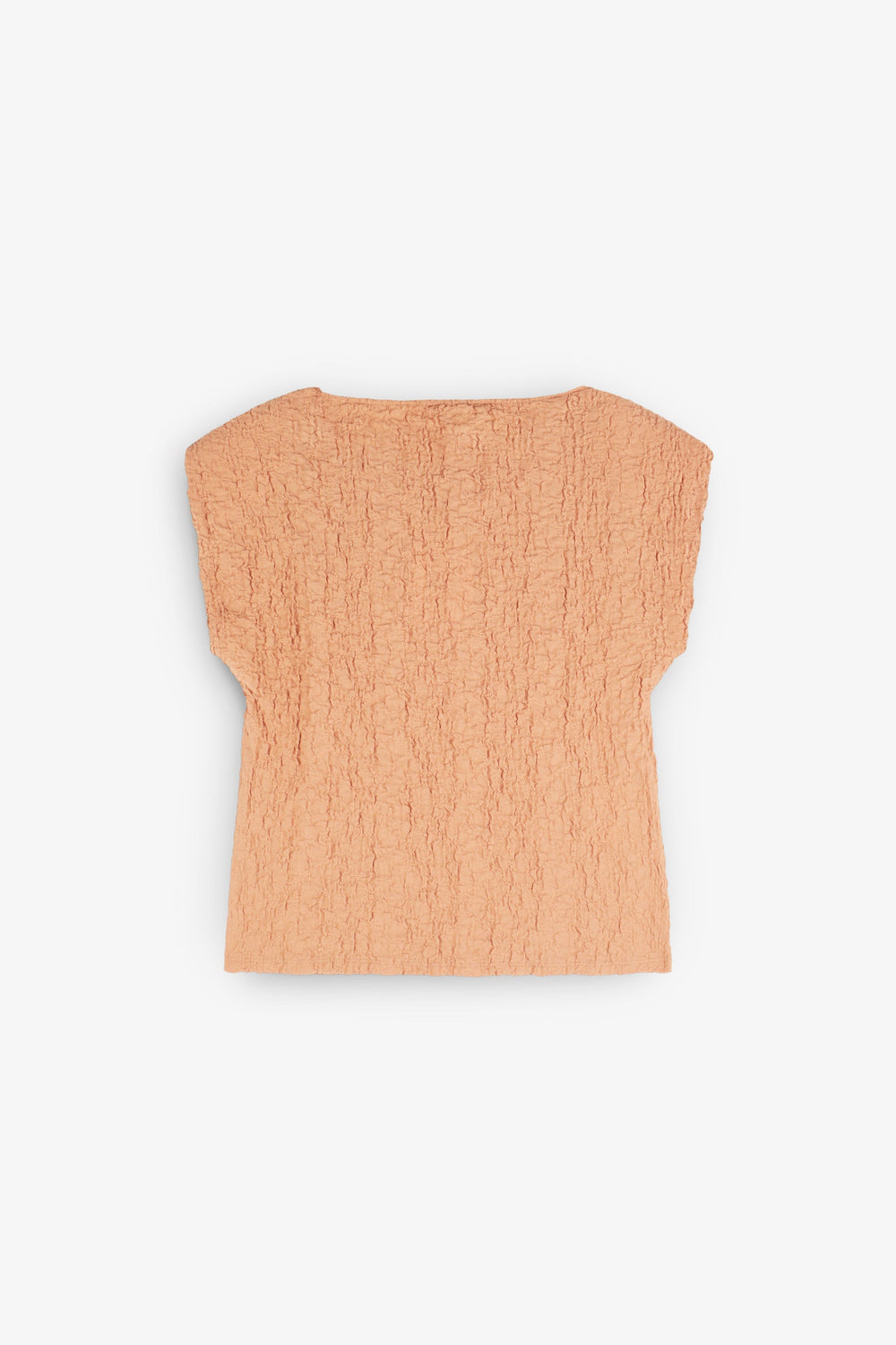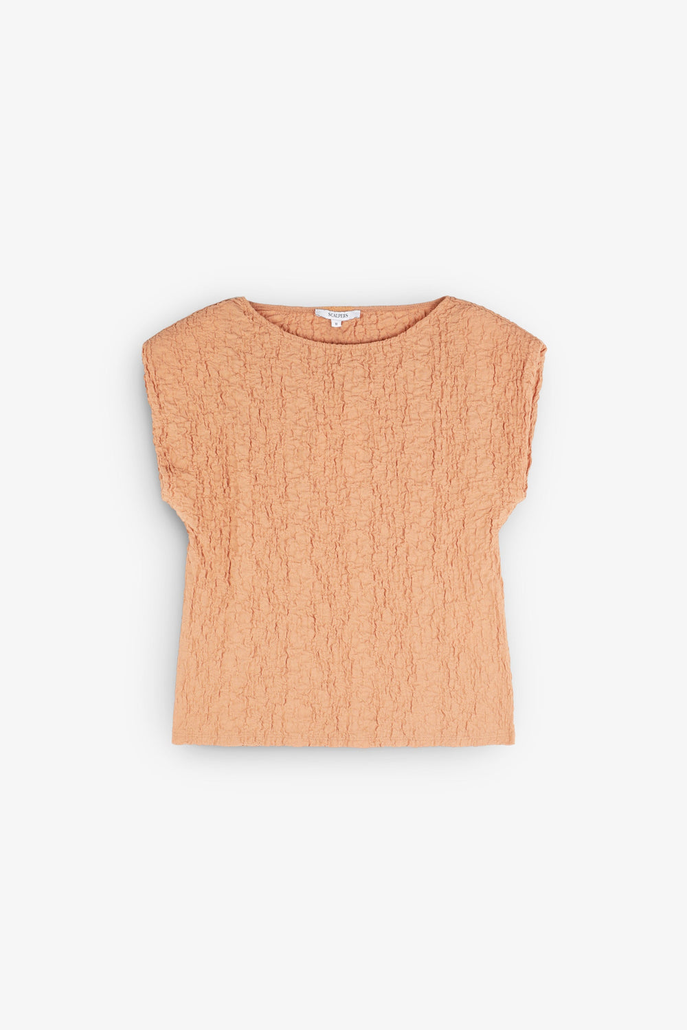 T-shirt made of slightly stretchy cotton blend fabric with crinkle texture. Slim fit, round neck, short sleeves with slightly padded shoulders.