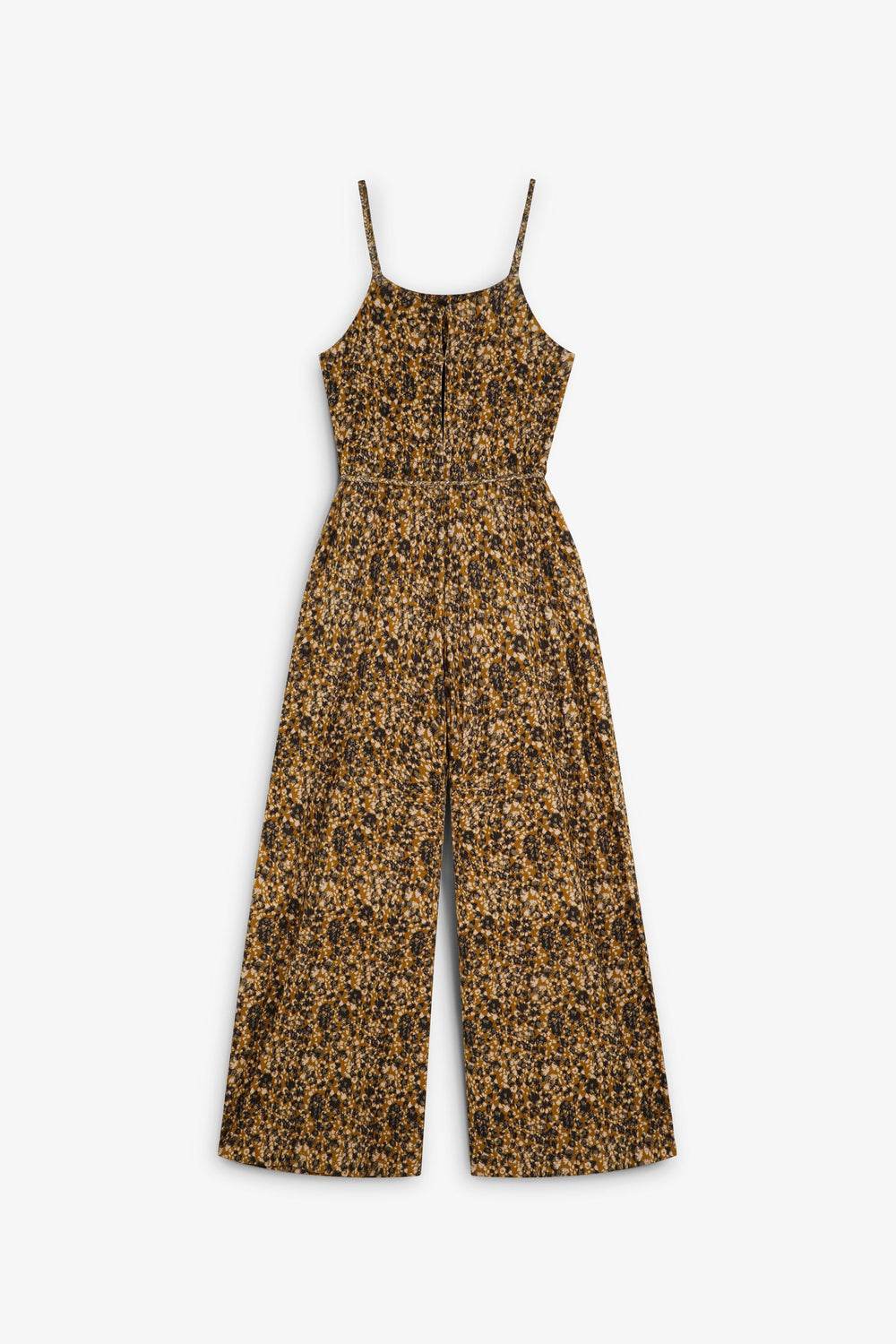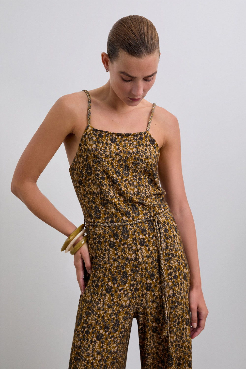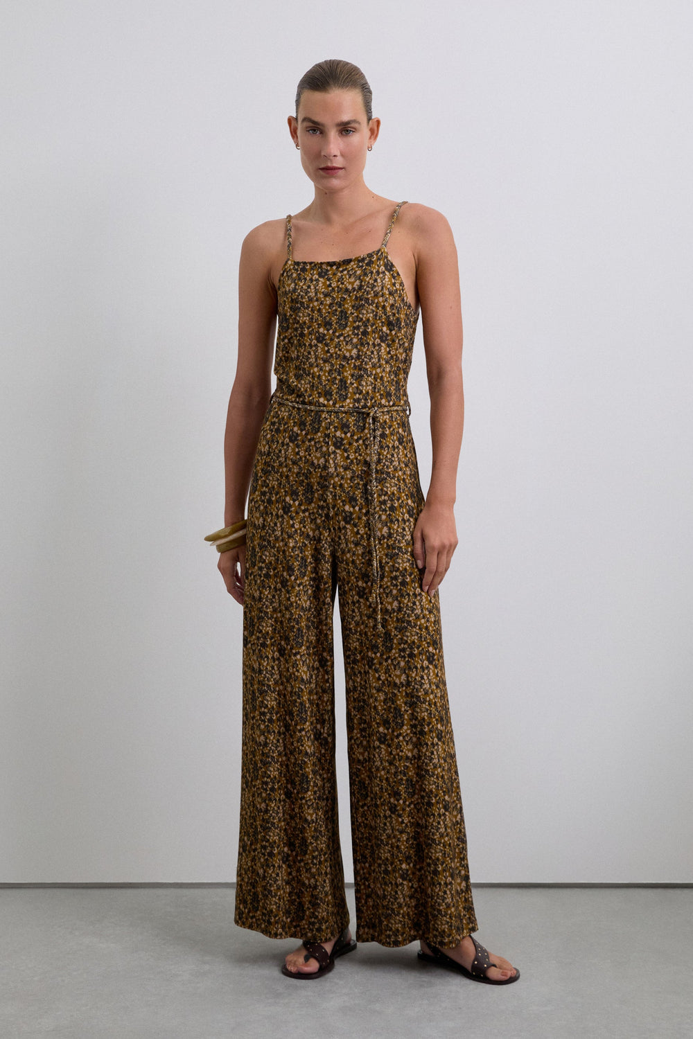 Viscose and elastane blend jumpsuit with animal print. Slim fit, thin straps and back button fastening. Rope belt detail.