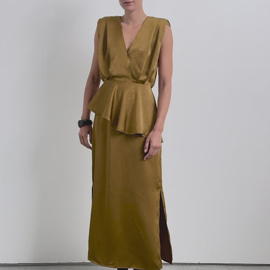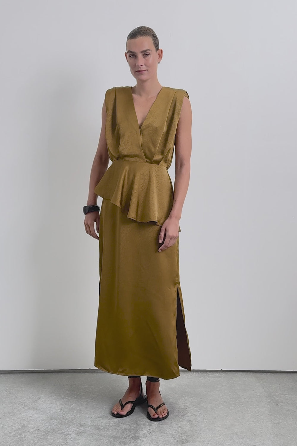 Midi skirt made of flowing fabric with texture. Concealed side zip fastening and split leg.
