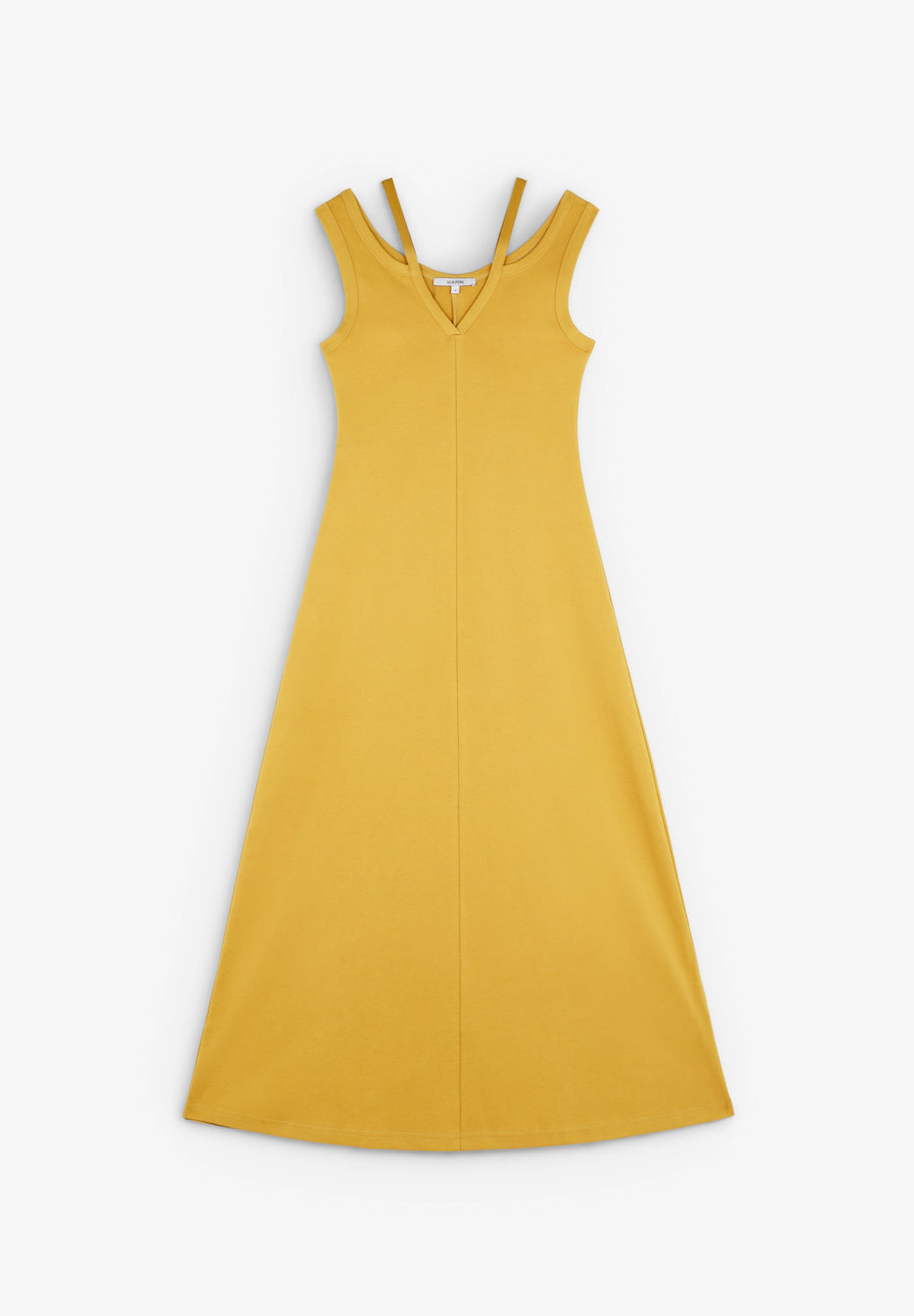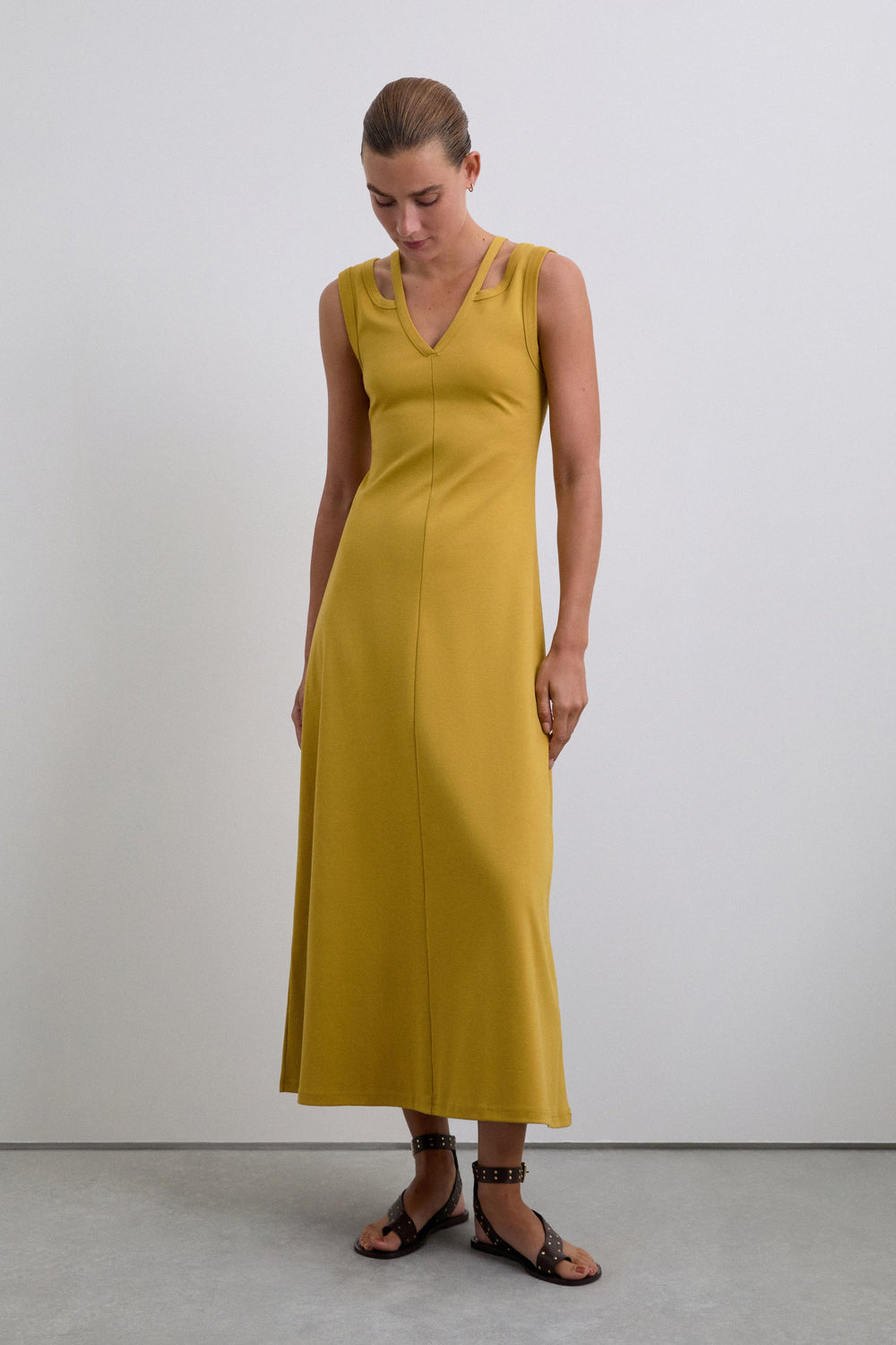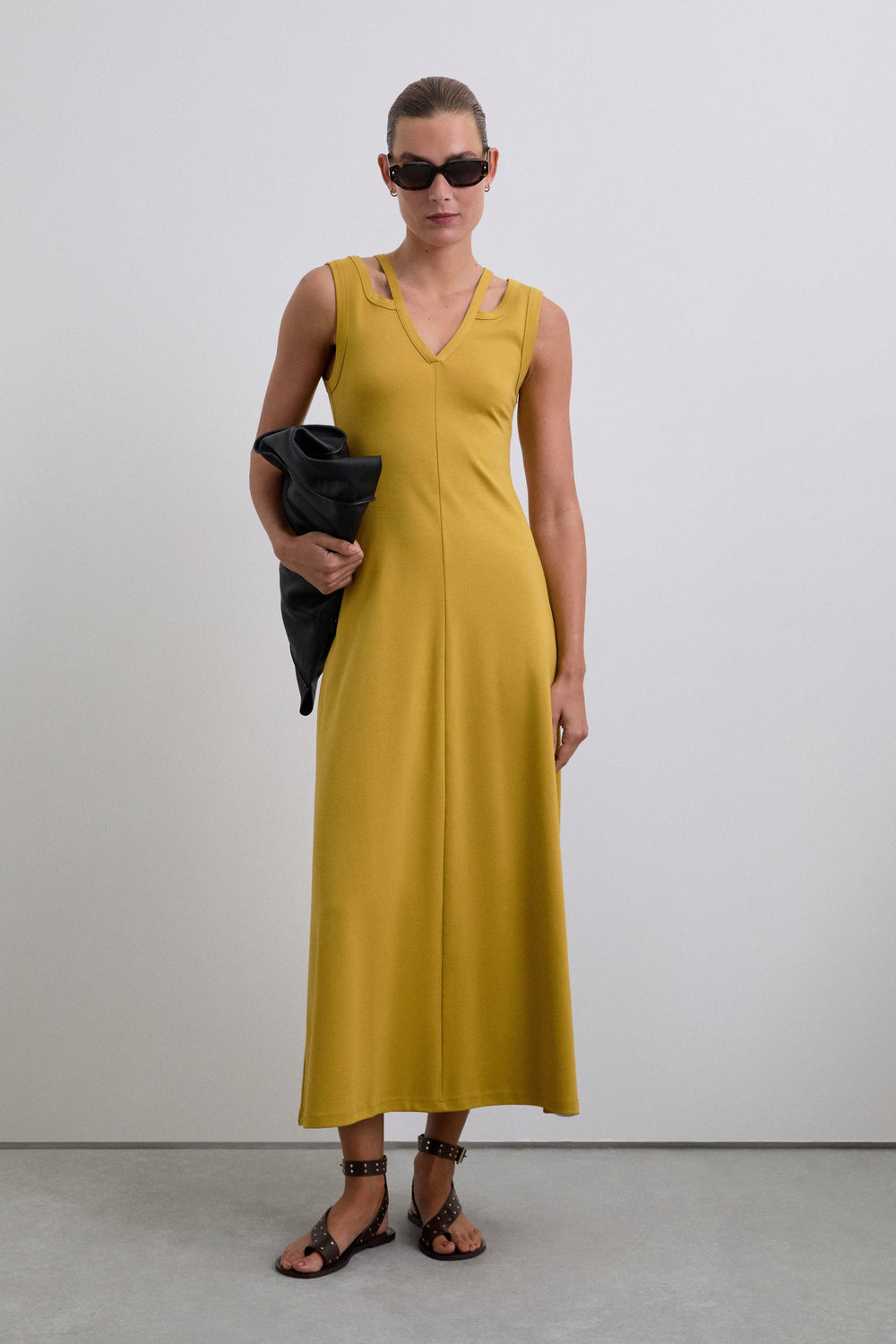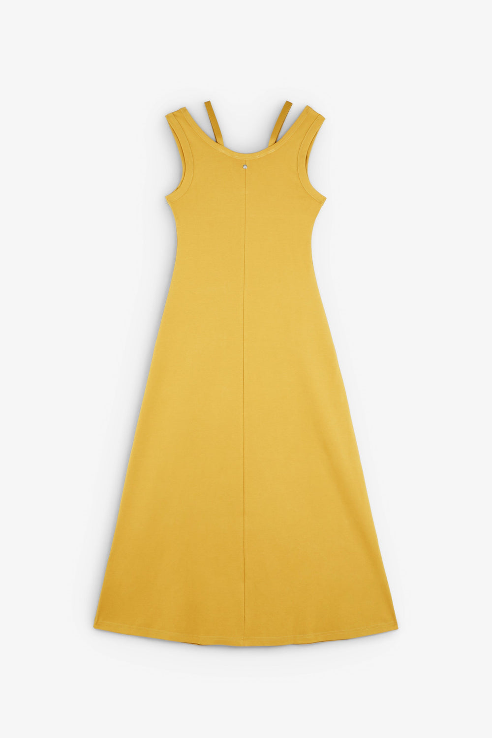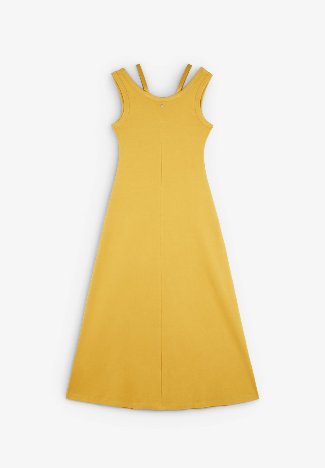 Midi dress made of 100% organic BCI cotton. Sleeveless. Cut out on straps. V-neck. Metal appliqué detail on the back.