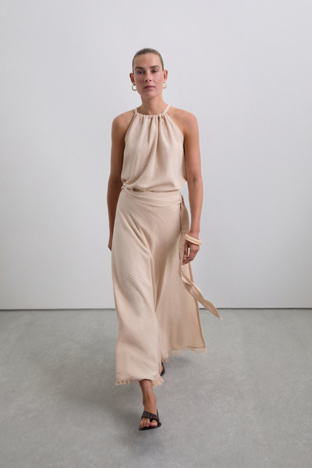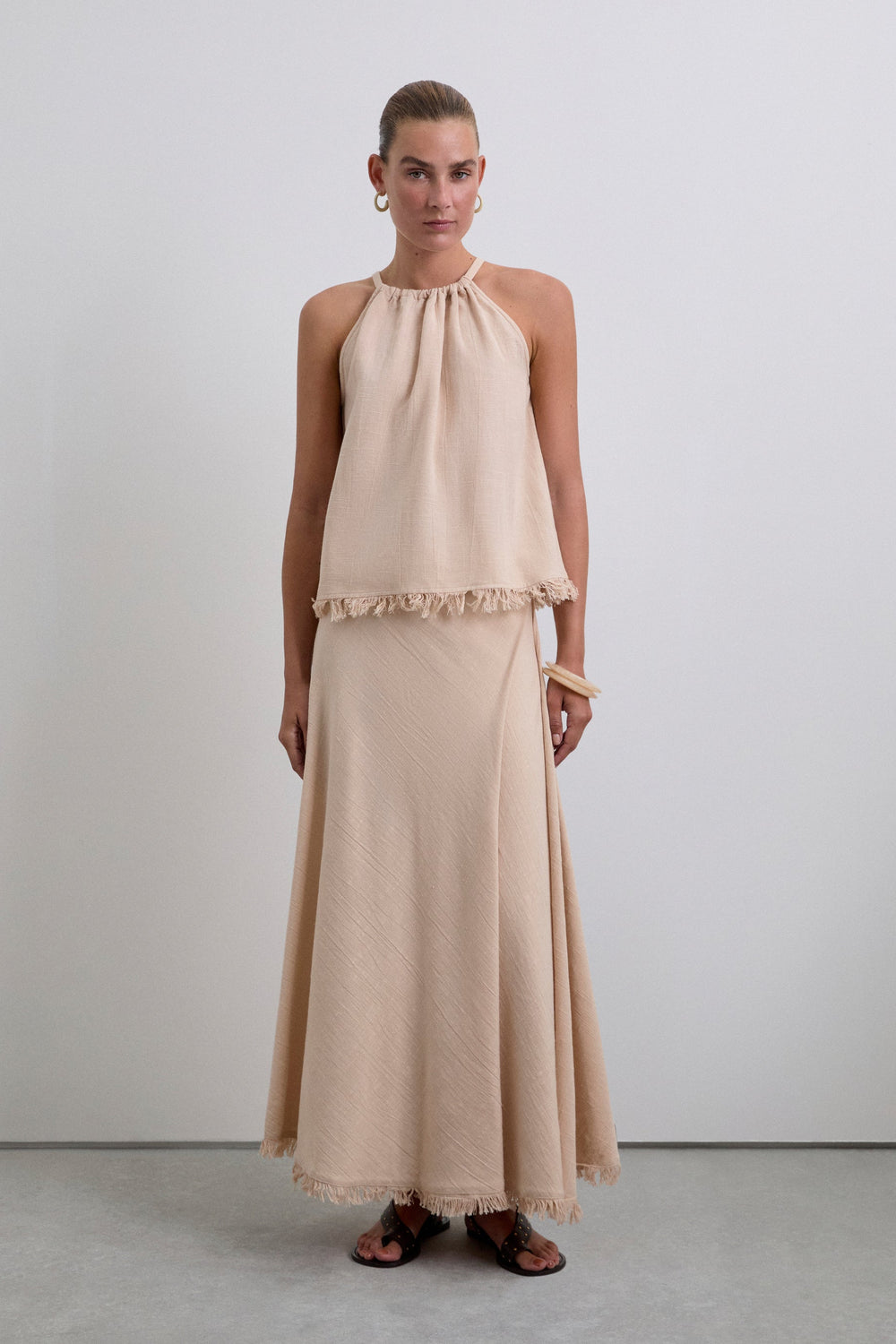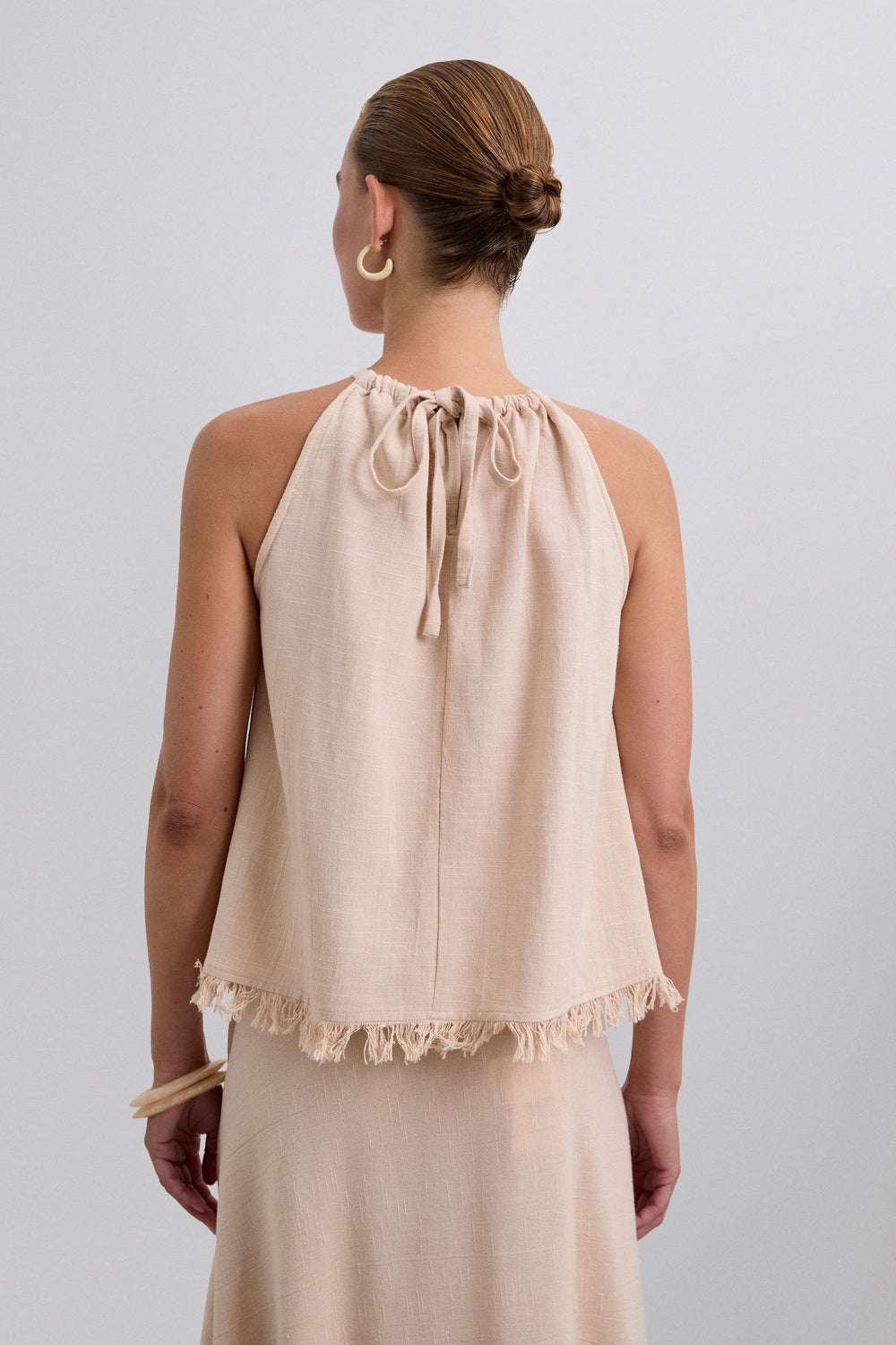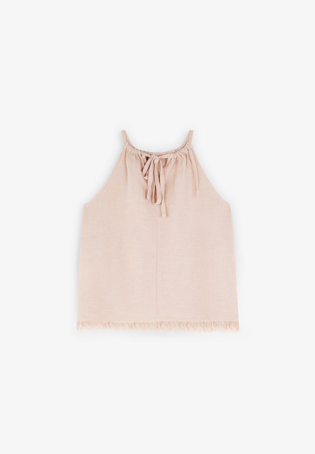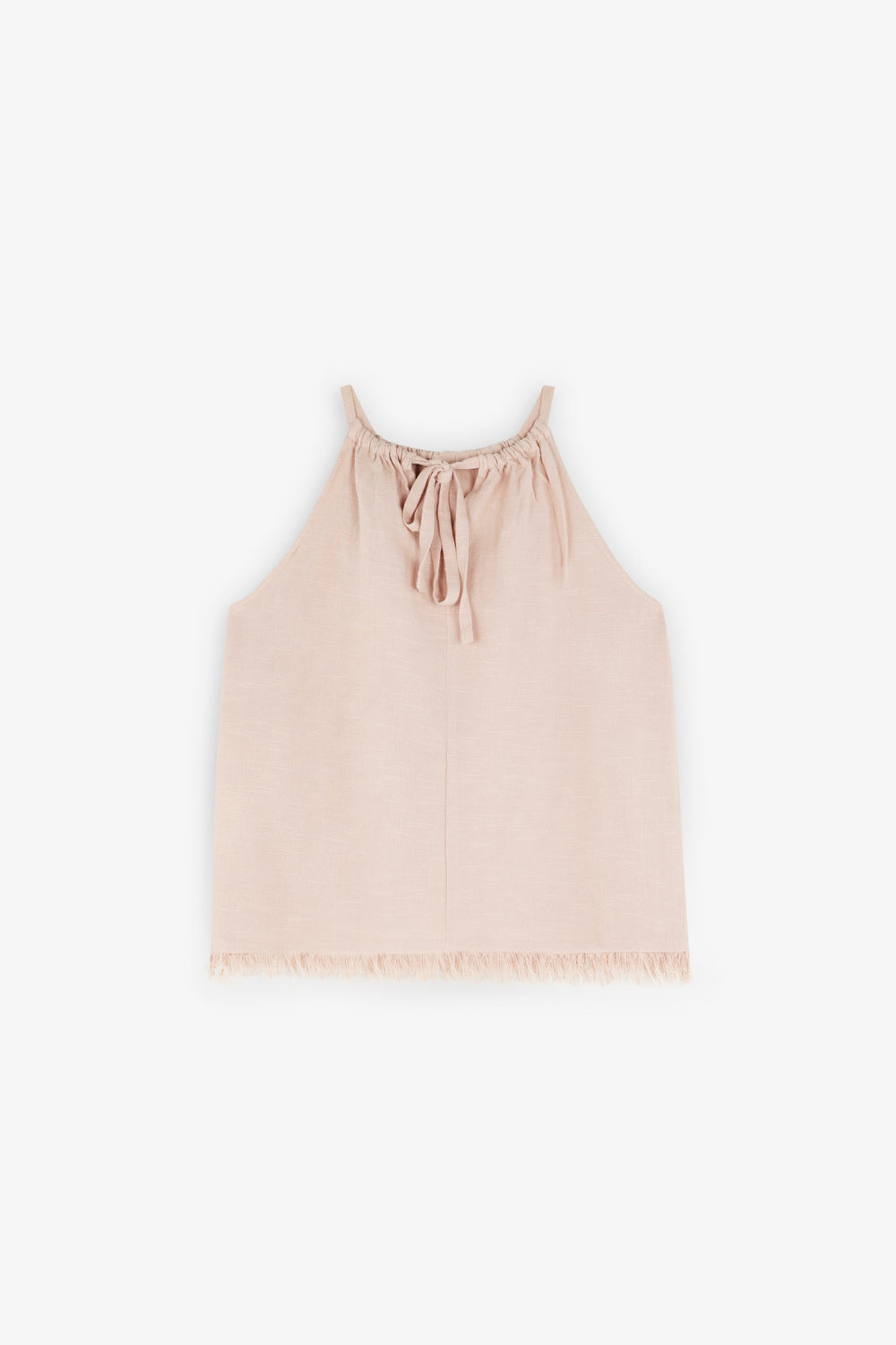Cotton top with fringed detail on the hem. Sleeveless. Adjustable lace up back.