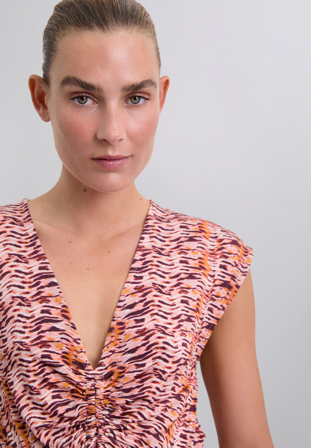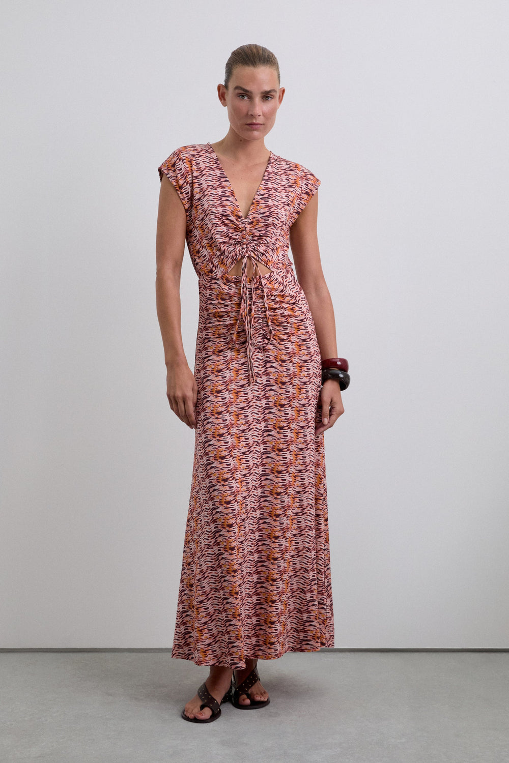 Flowing printed dress with cut out at the chest. Short sleeve. V-neck. Adjustable front bow detail.