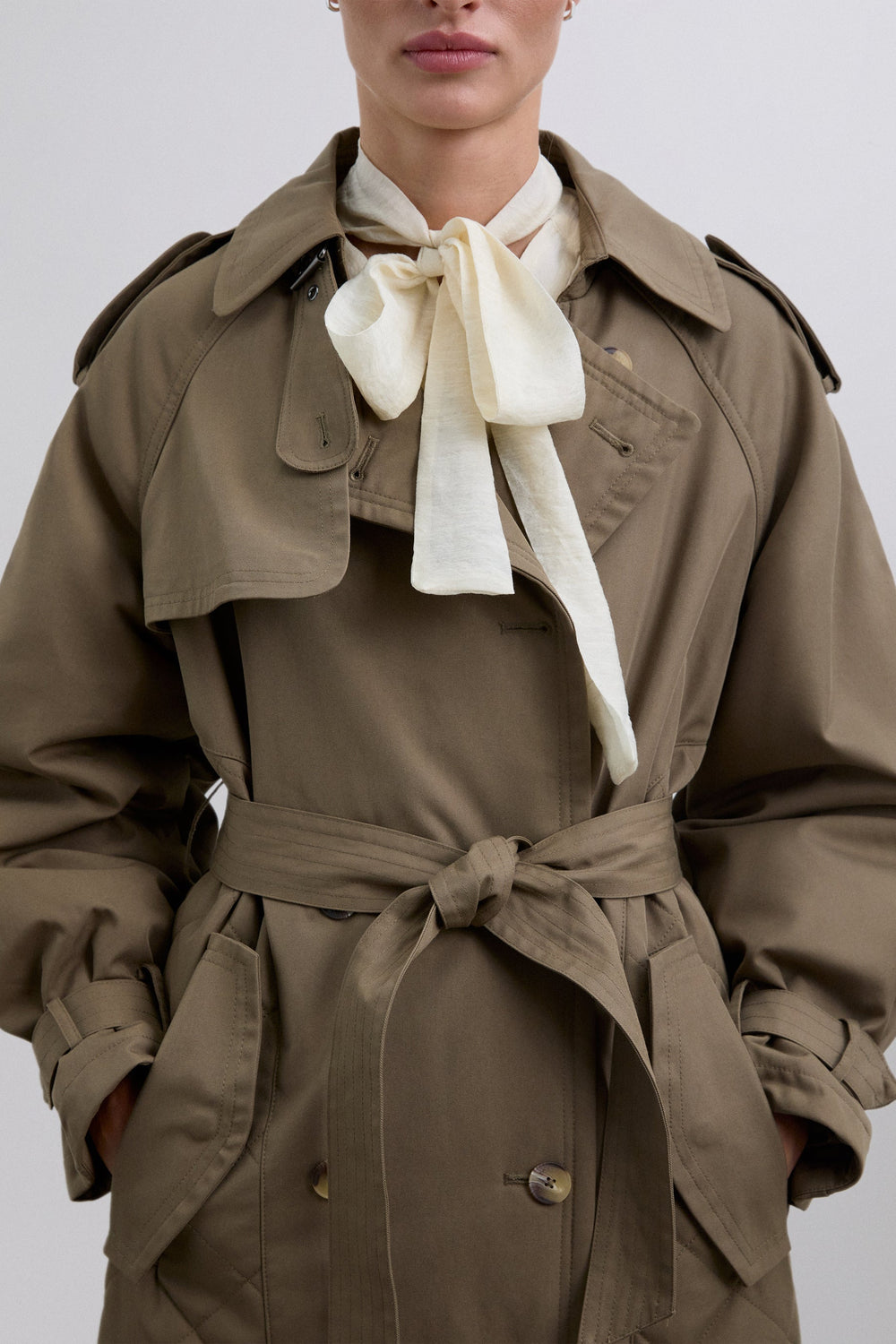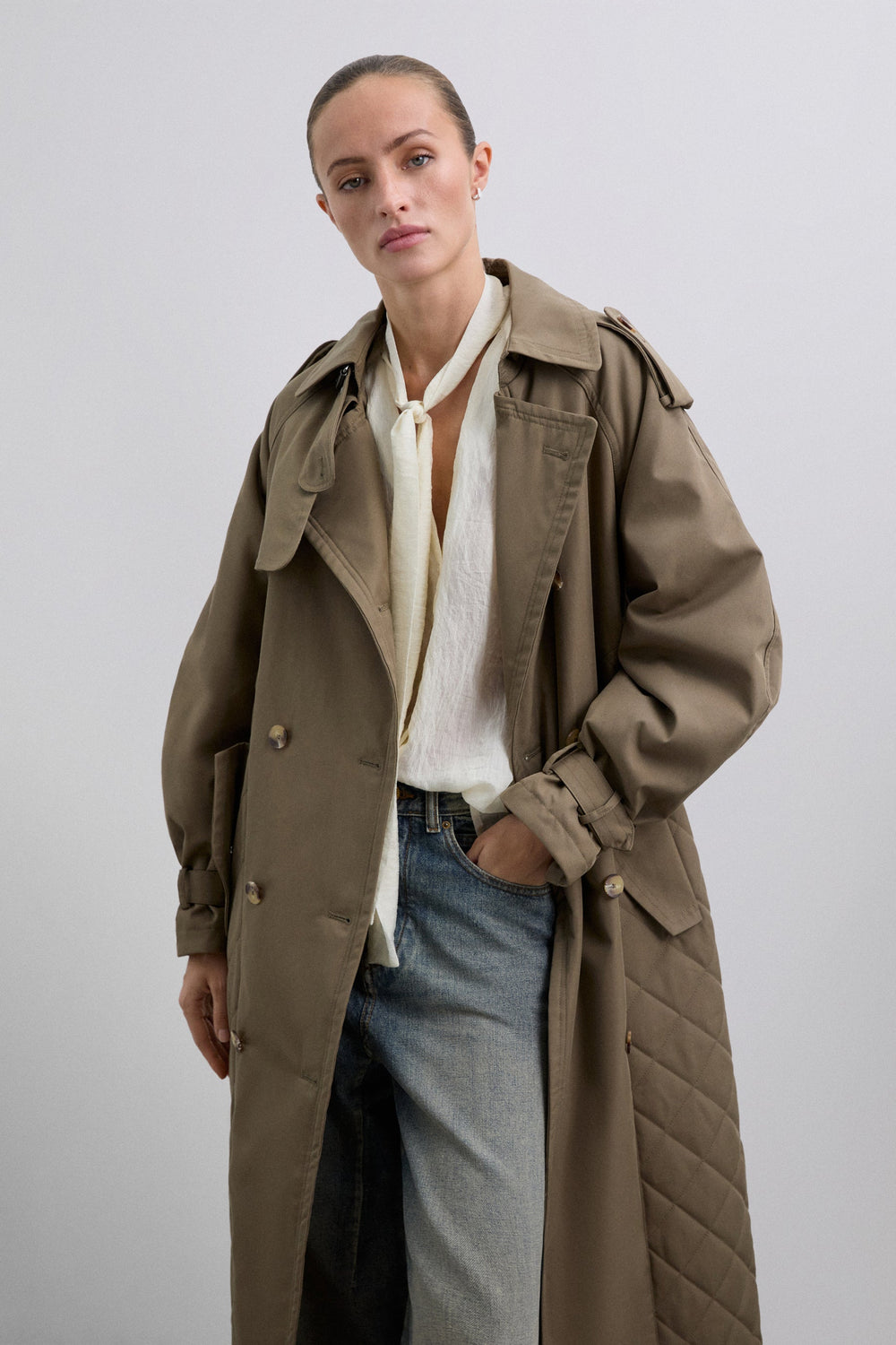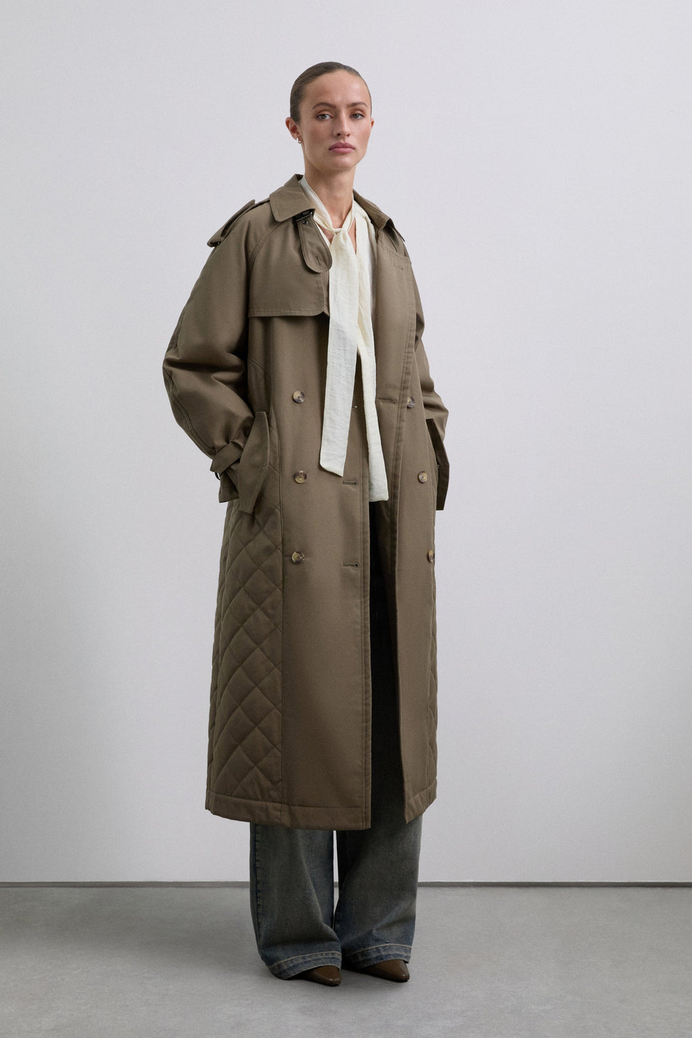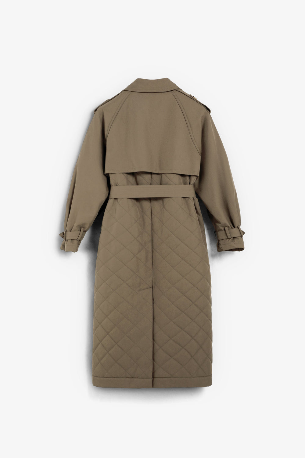 Coat quilted, waterproof trench coat made of cotton. Quilted detail at the bottom. Voluminous sleeves and cuff tabs. Front button fastening and adjustable belt.